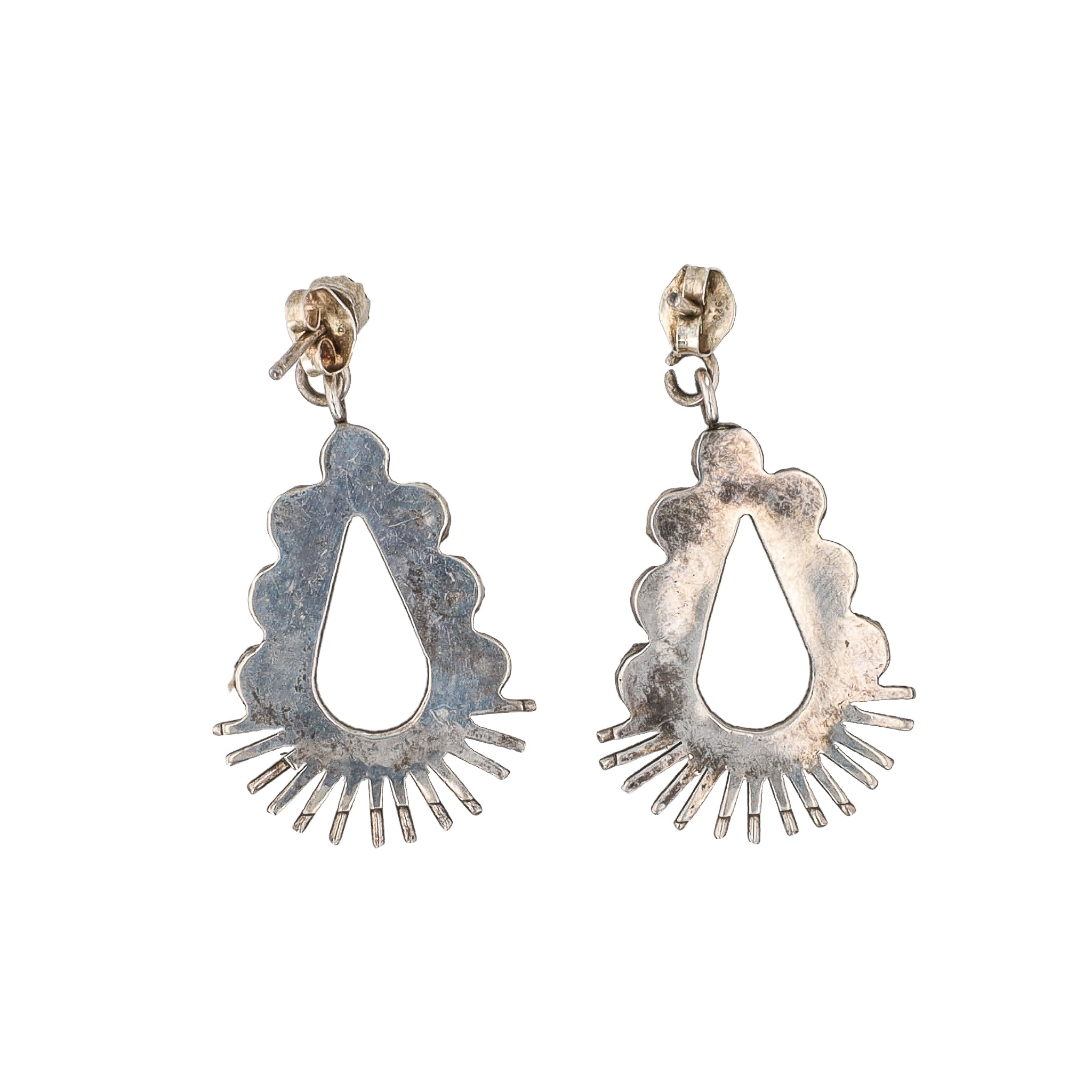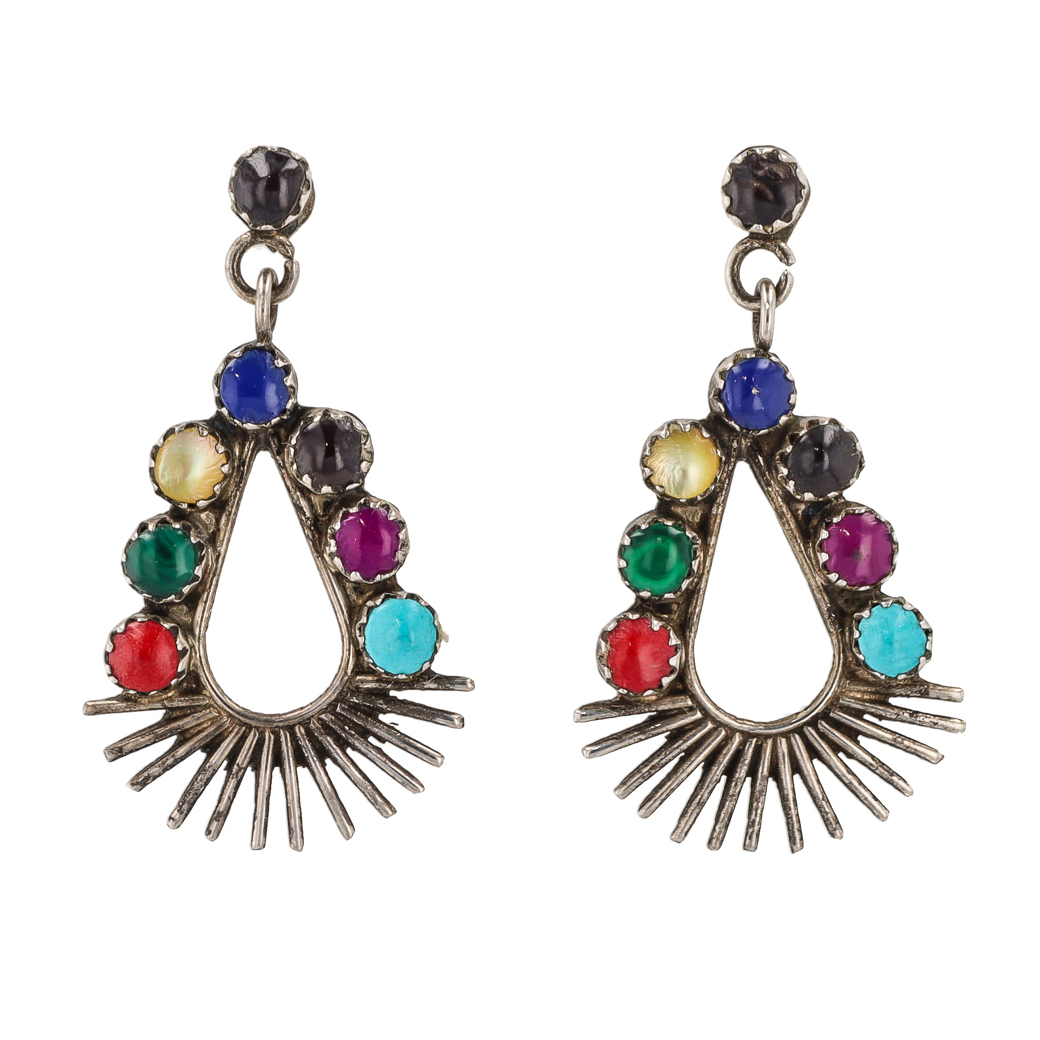 Vintage Zuni Multi Stone Sterling Dangle Earrings 5g-Turquoise, Coral, Amethyst, Malachite, Onyx, Mother of Pearl, Lapis