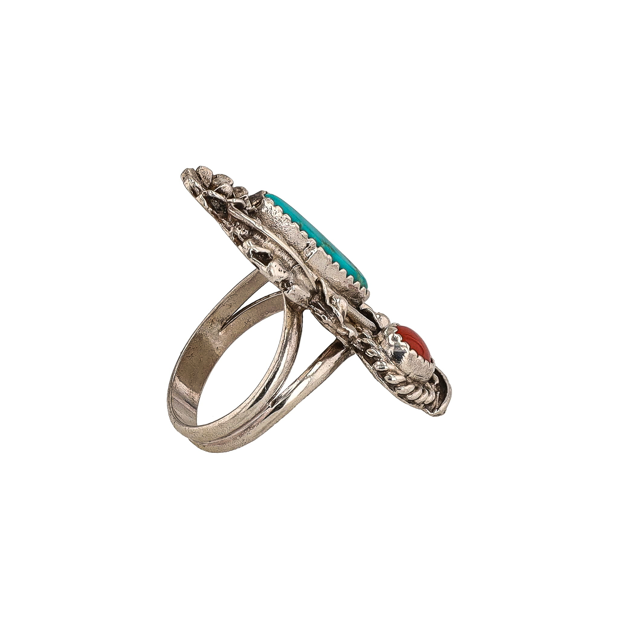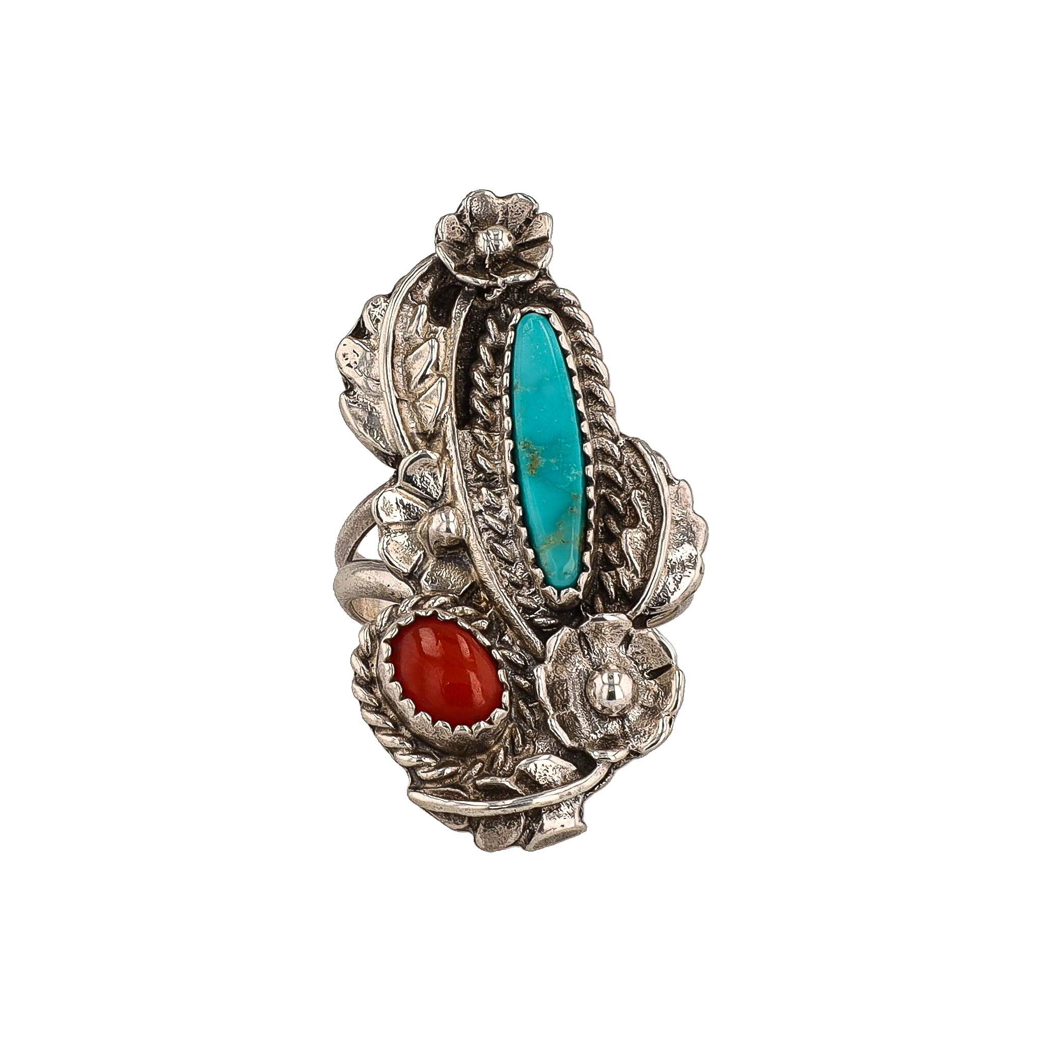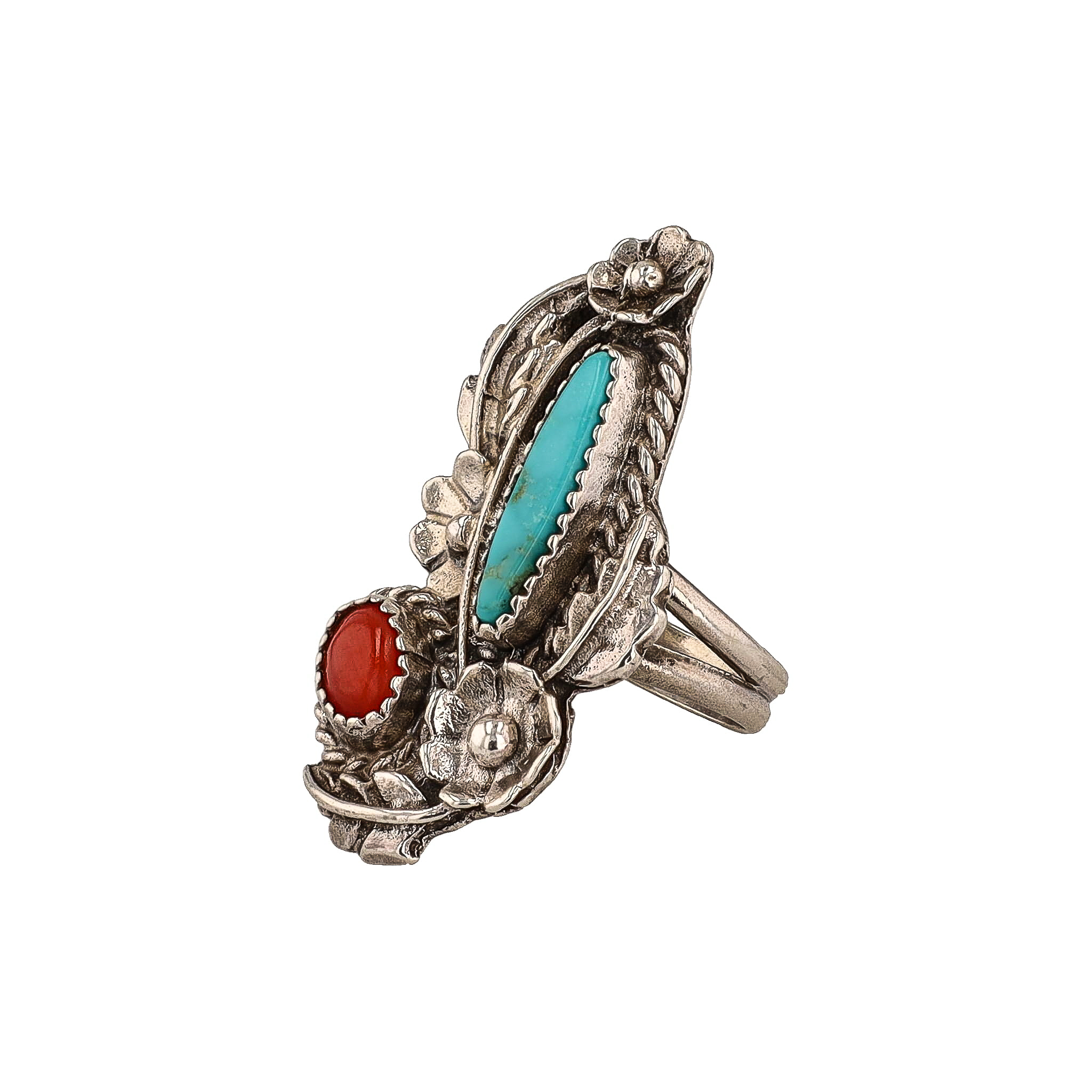 Vintage Navajo Coral Turquoise Sterling Blossom Ring Sz. 6.5, 10g-Cleaned by Previous Owner