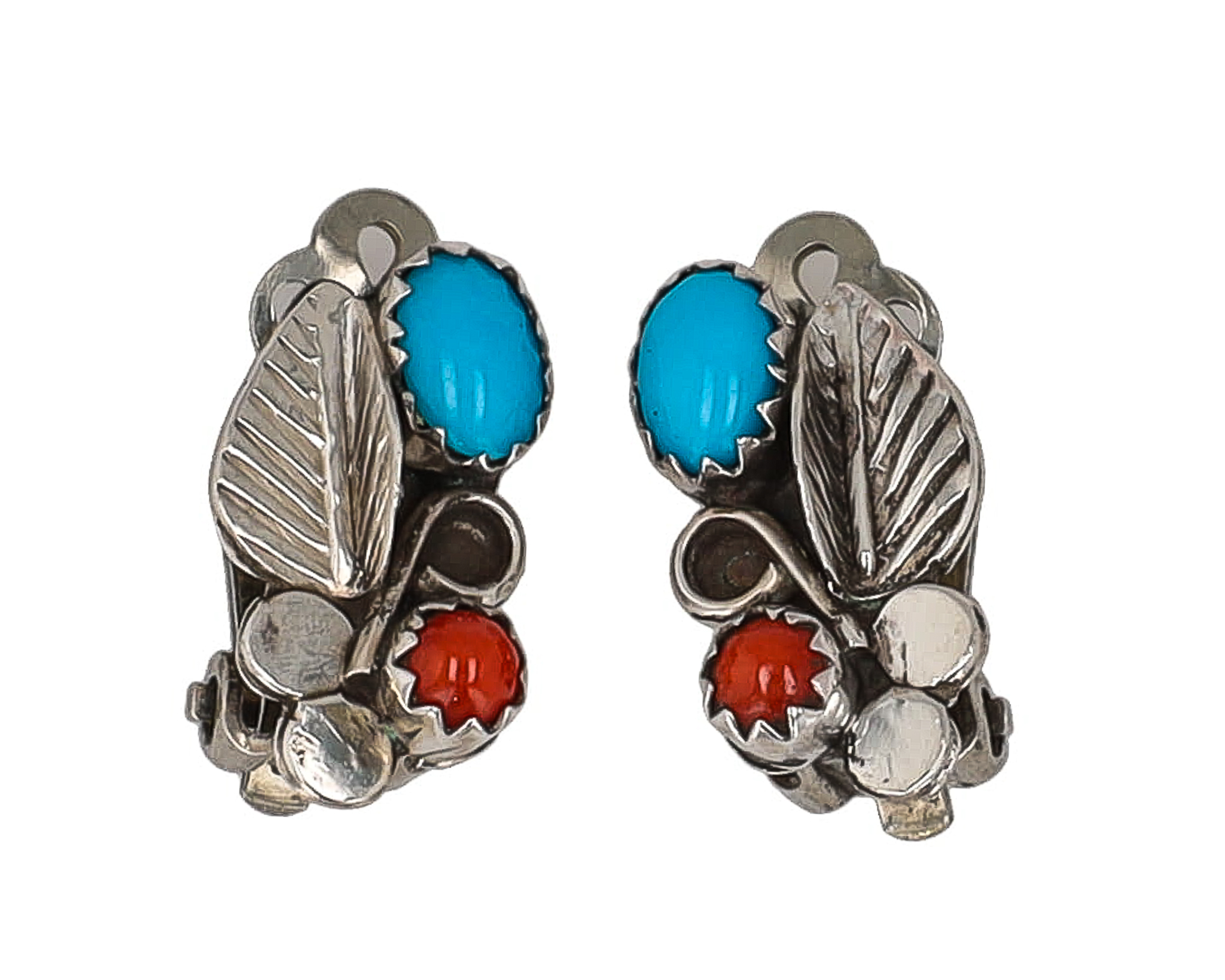 Vintage Navajo Turquoise Snake Eye Coral Sterling Leaf Overlay Earrings 3g