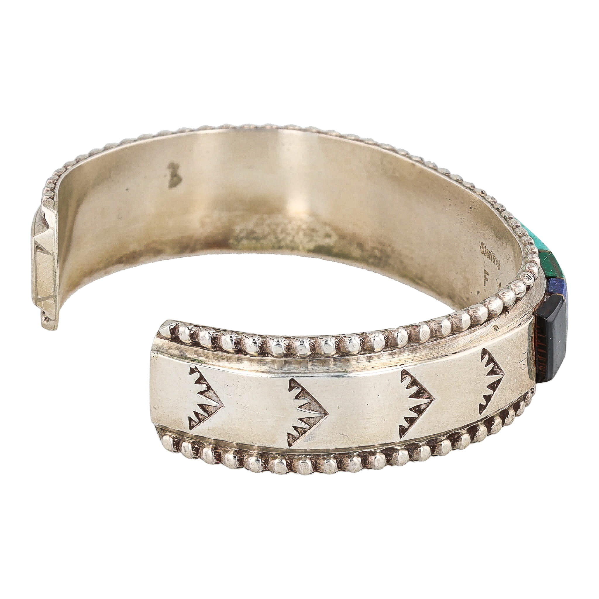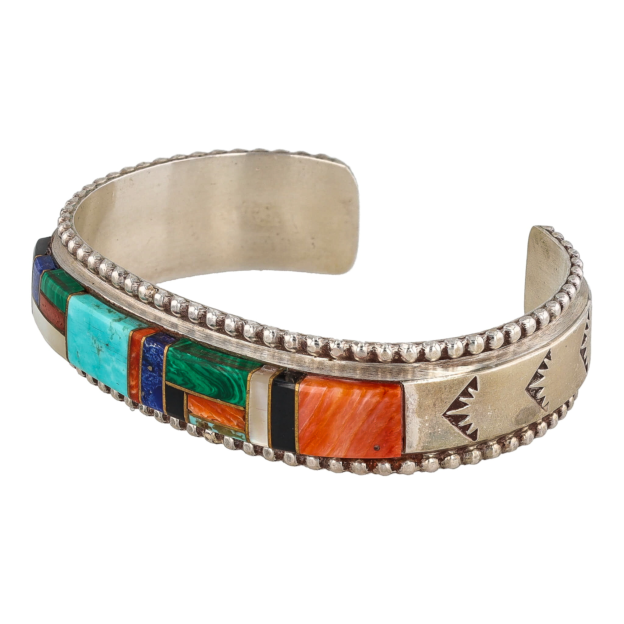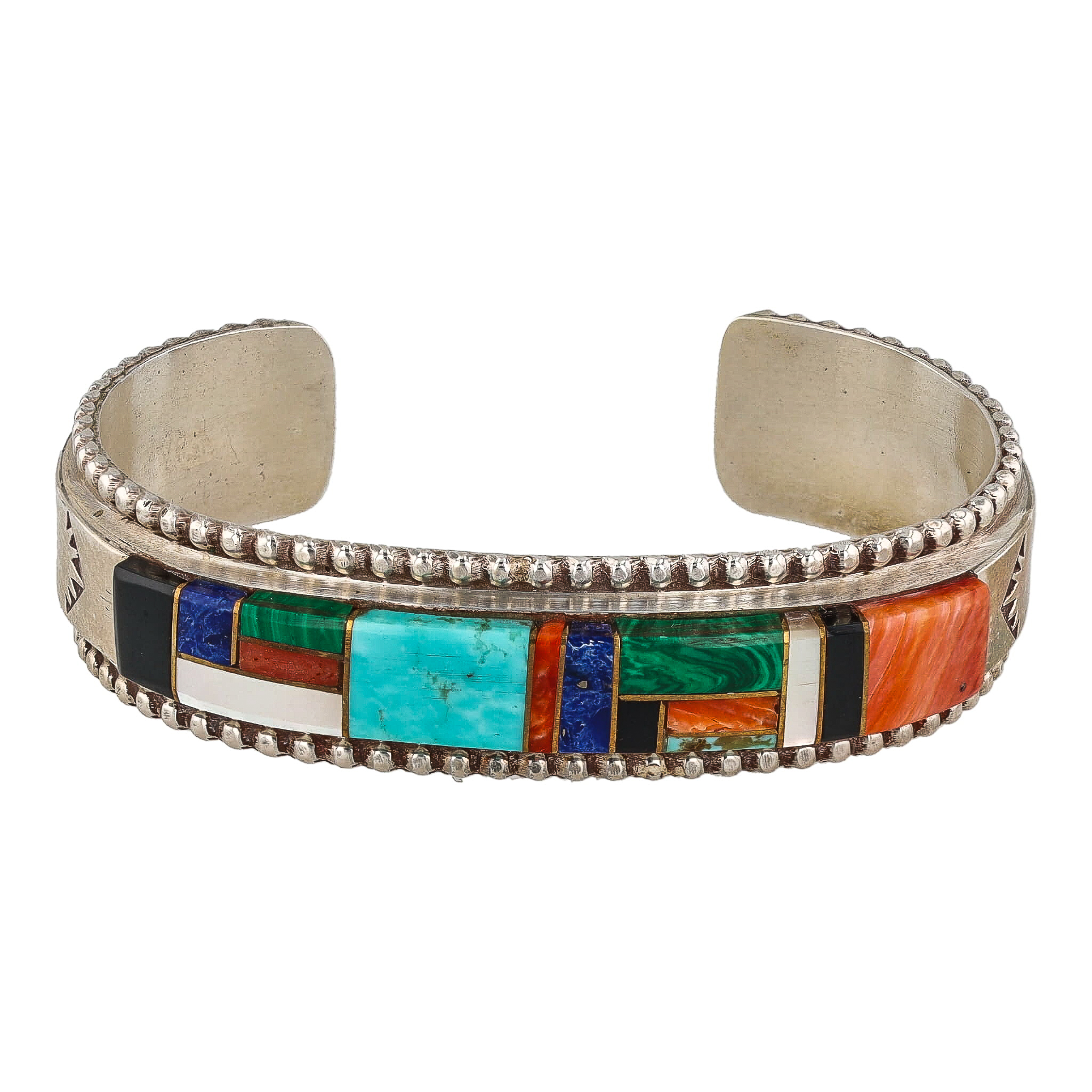 Frank Yazzie Multi Stone Sterling Raised Inlay Cuff Bracelet 31.5g-Turquoise, Spiny Oyster, Coral, Mother of Pearl, Onyx, Malachite