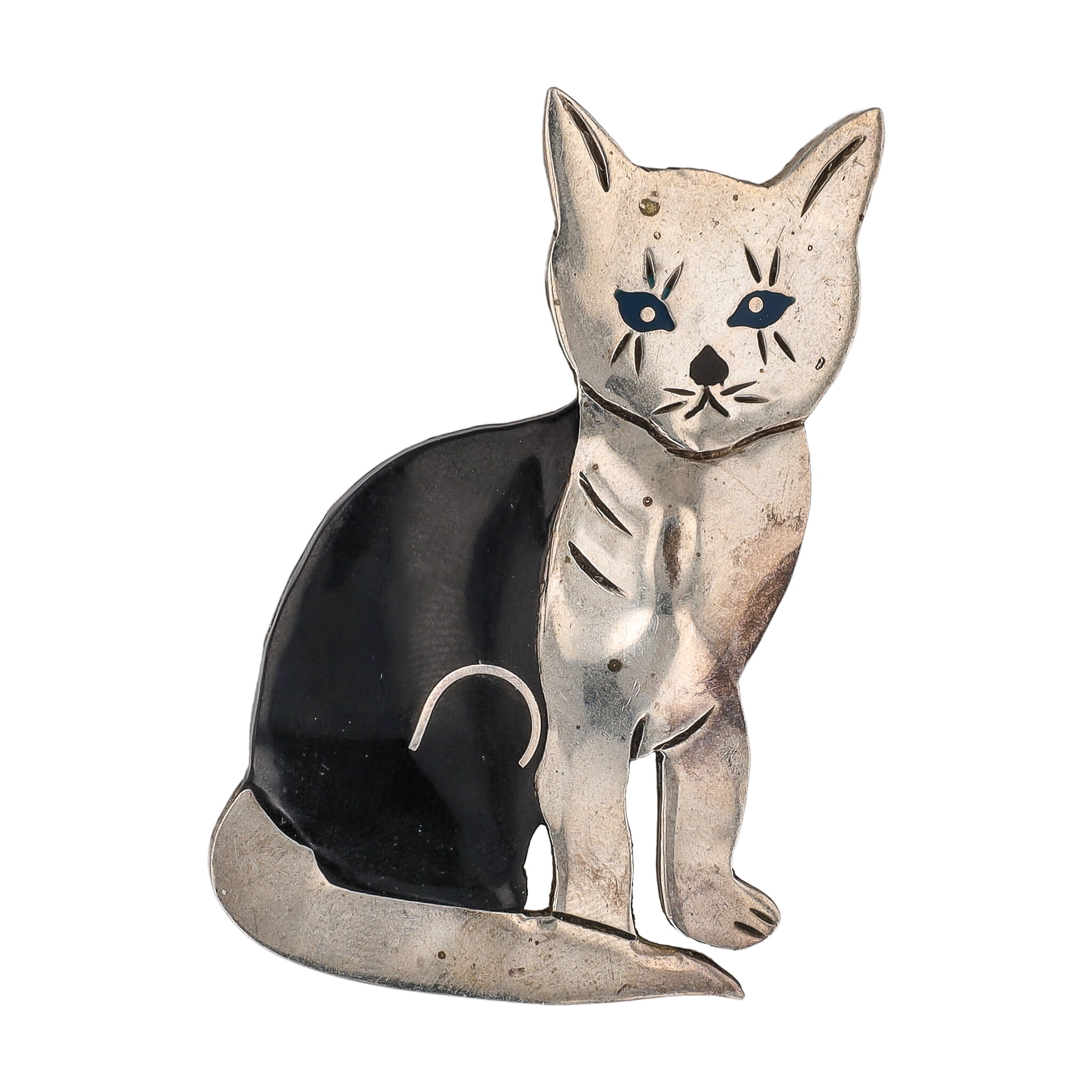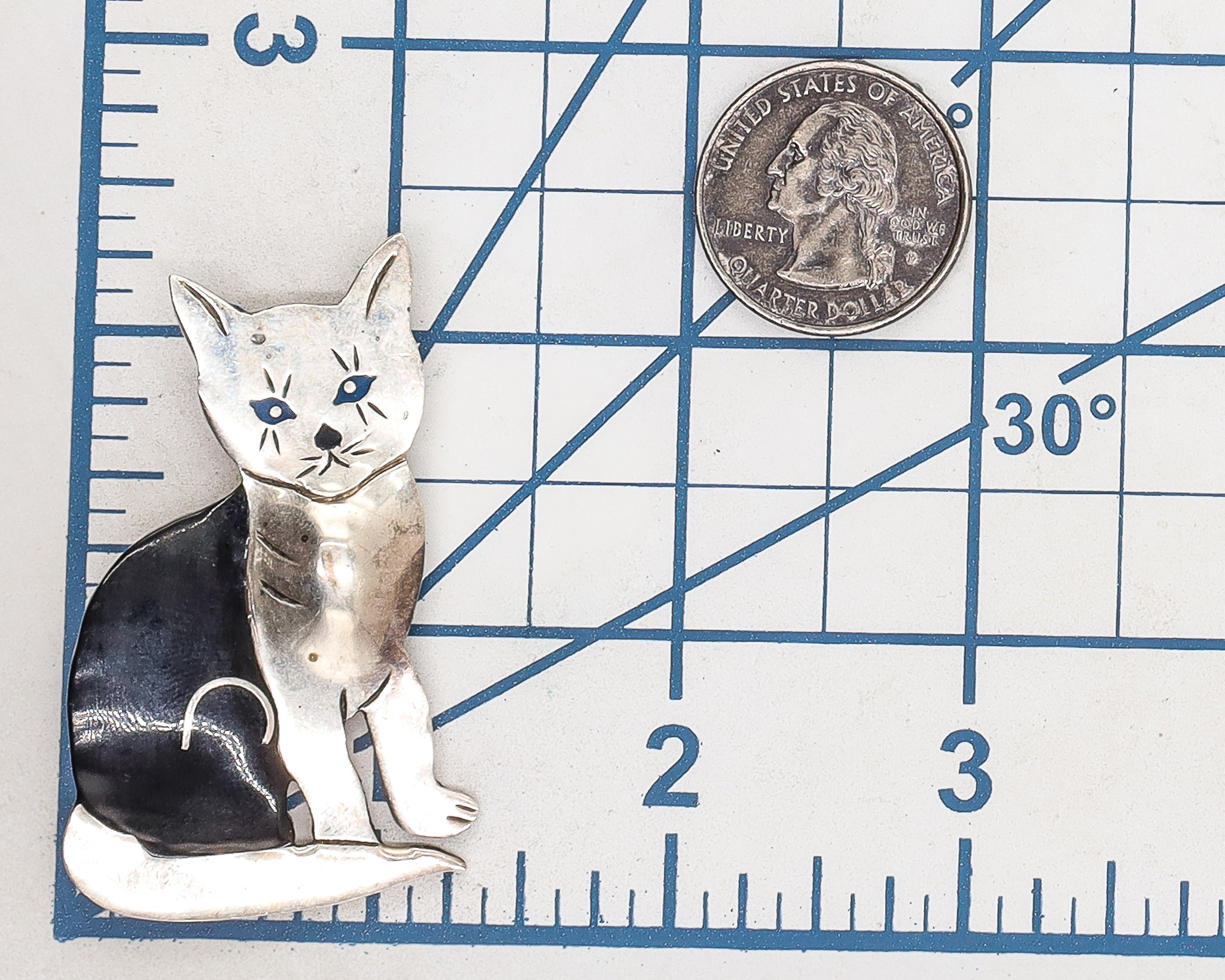Signed TO-57 Taxco Mexico Enamel Sterling Cat Brooch 25g