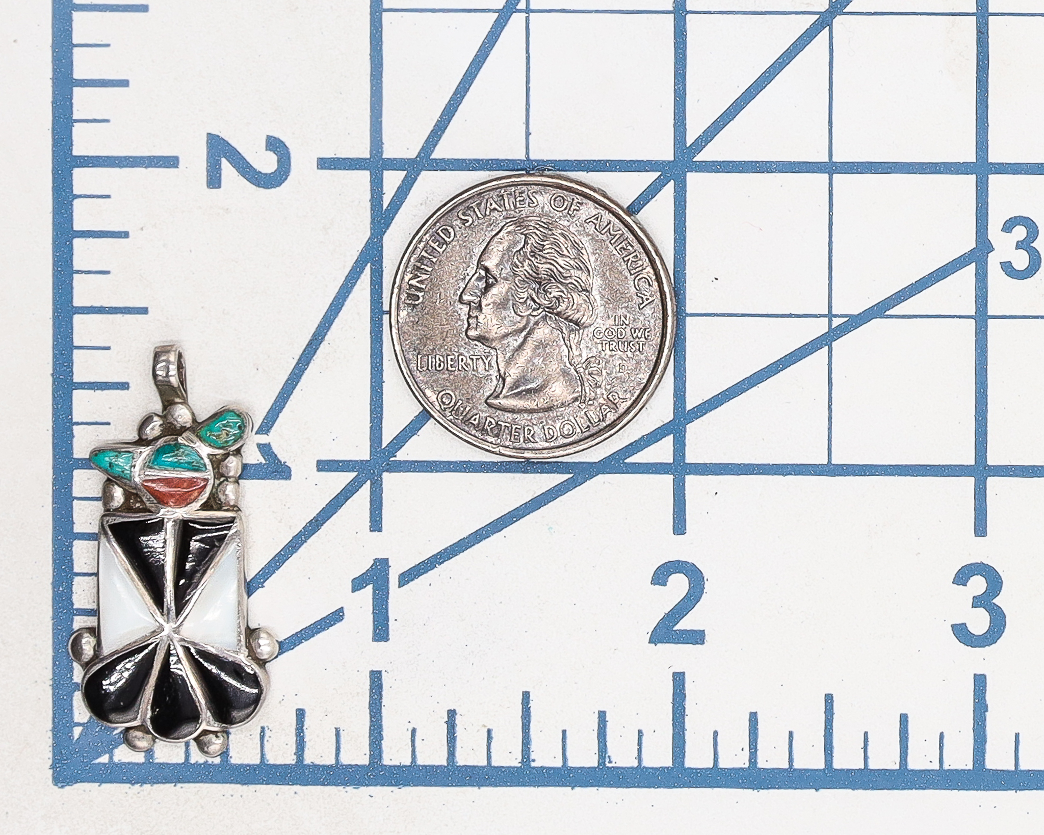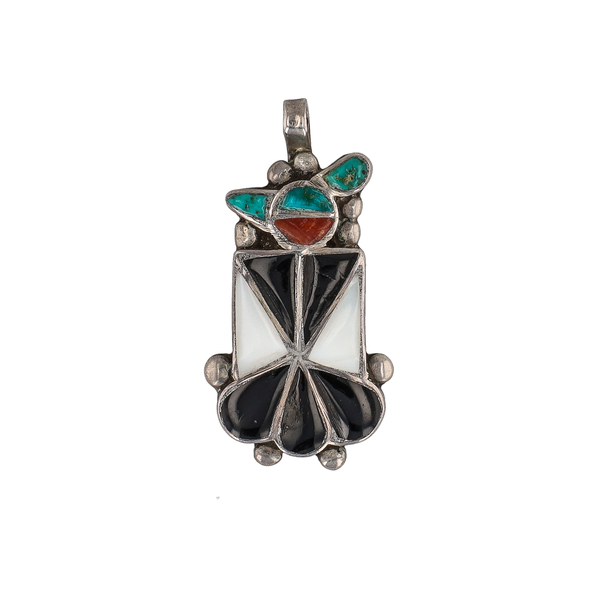 Vintage Zuni Multi Stone Sterling Thunderbird Pendant 4g-Turquoise, Coral, Onyx, Mother of Pearl