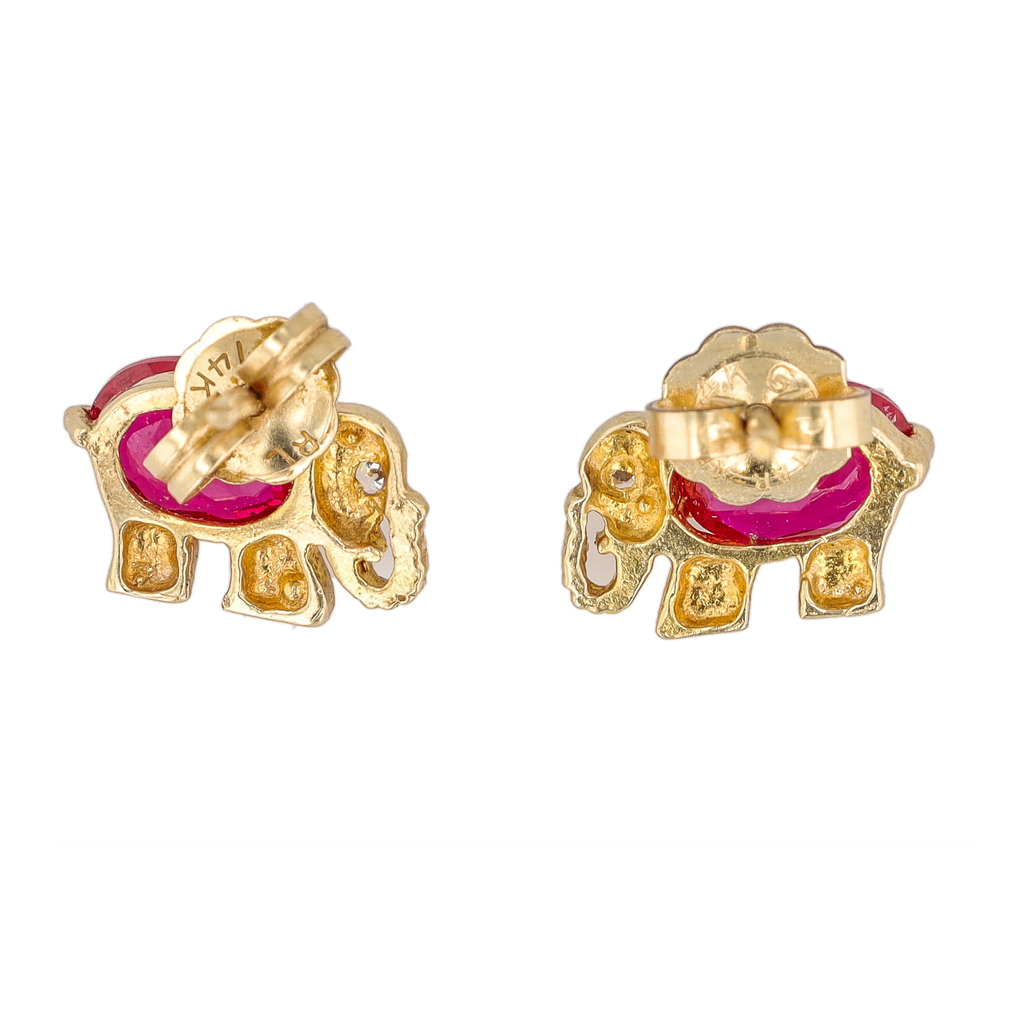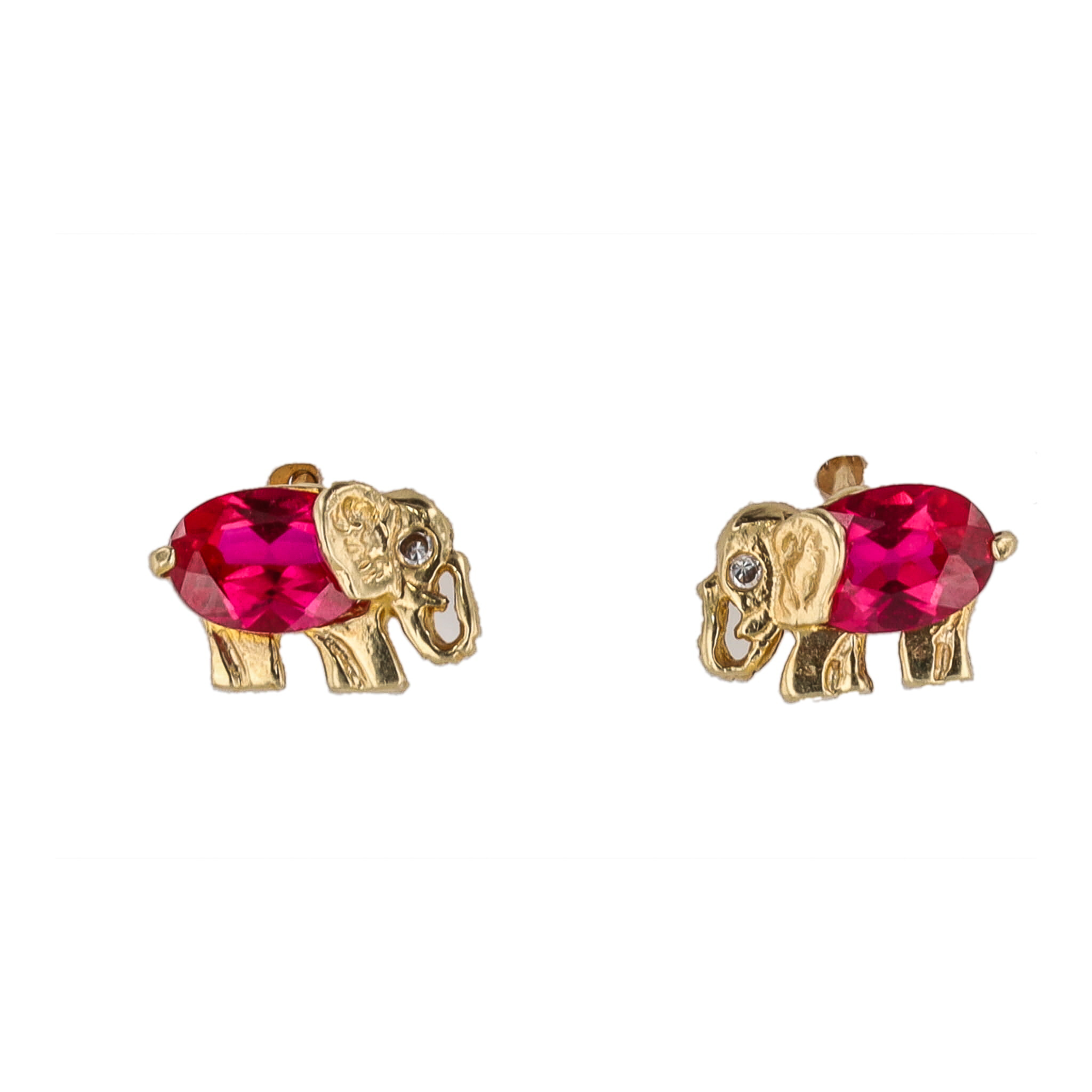 Signed MEA Ruby Gemstone 14K Gold Elephant Earrings