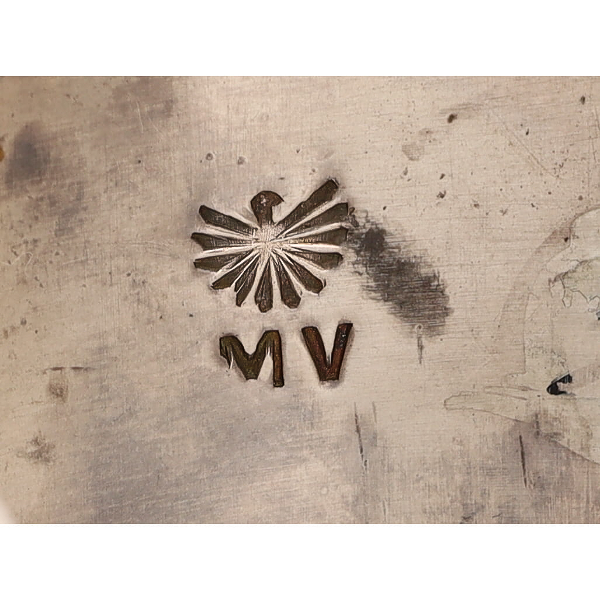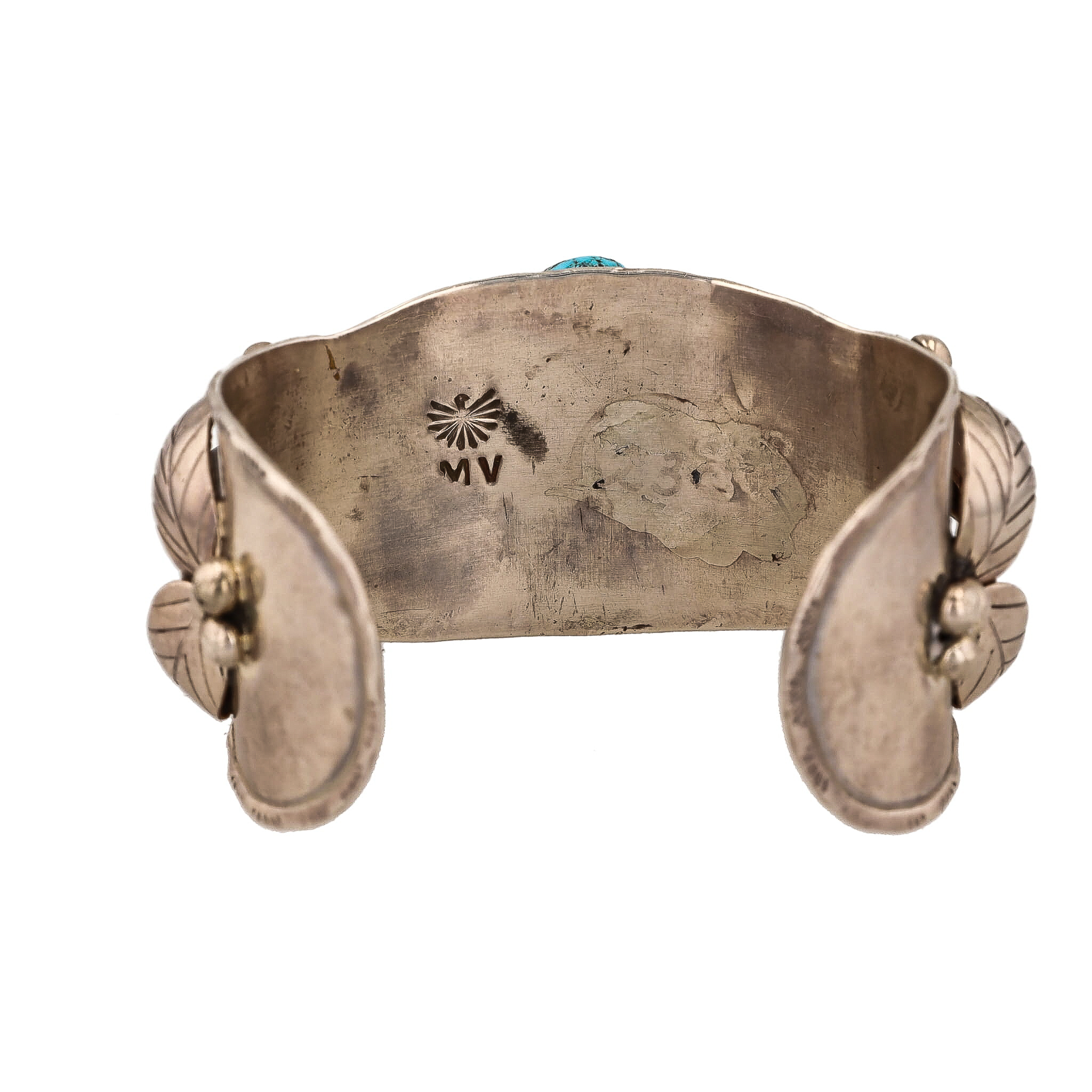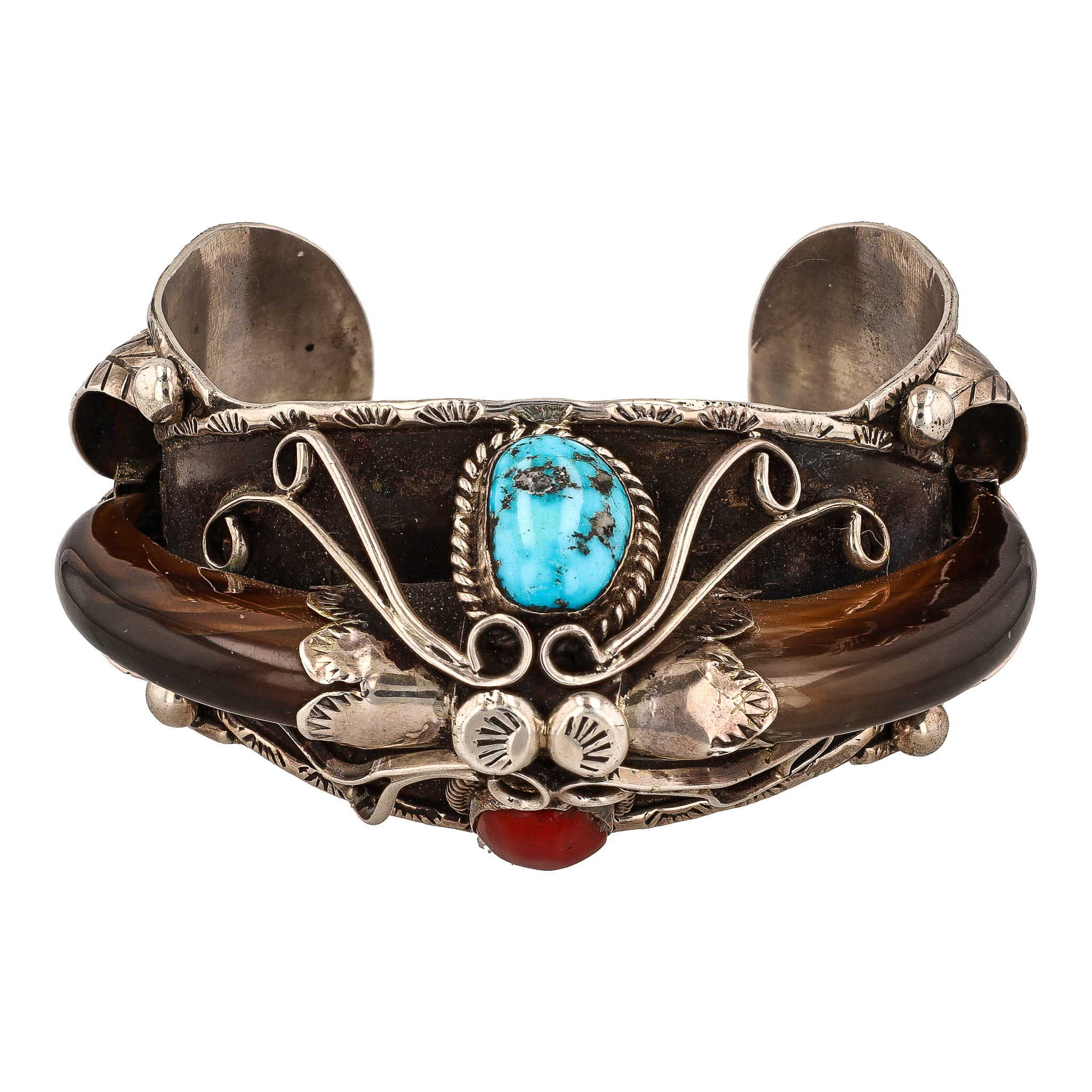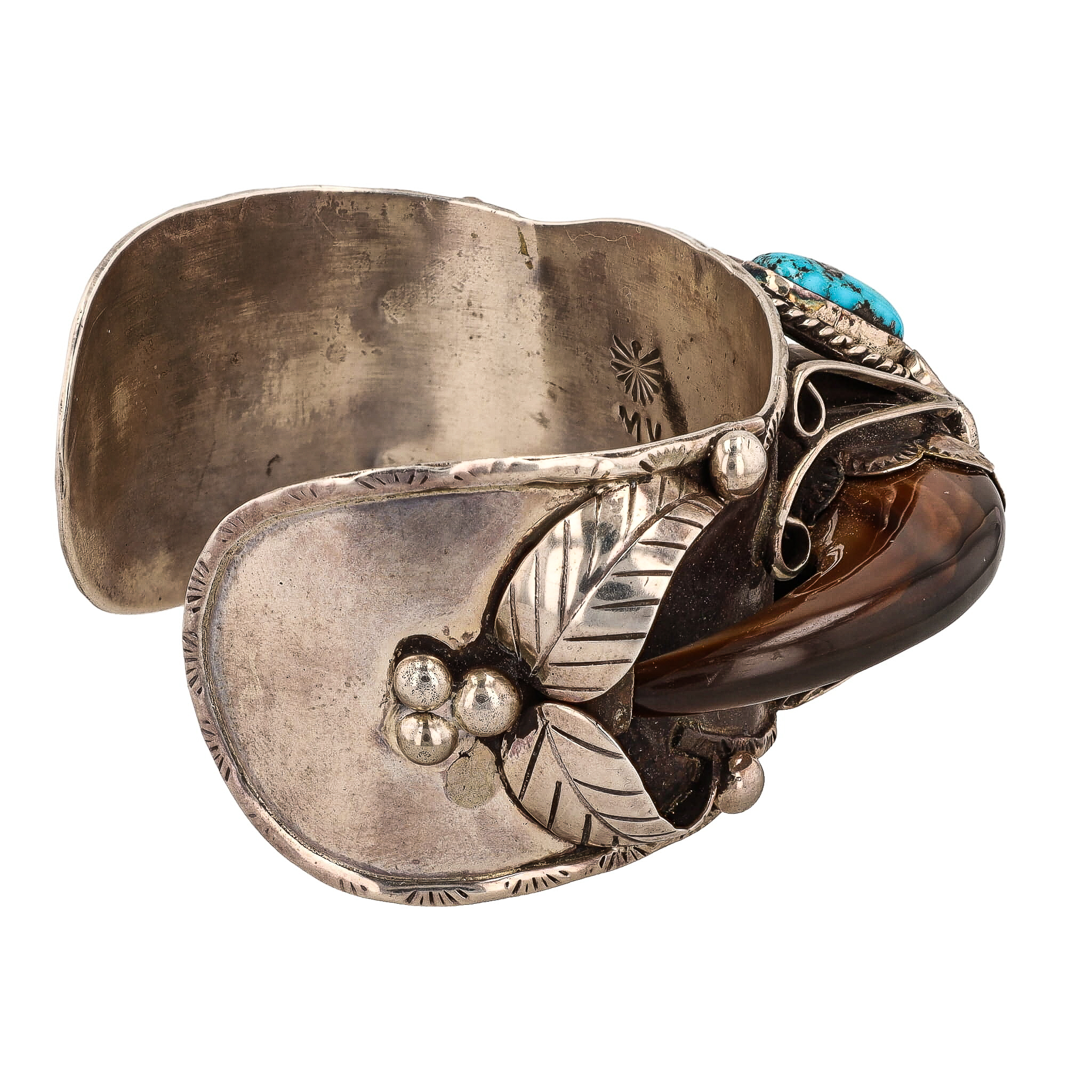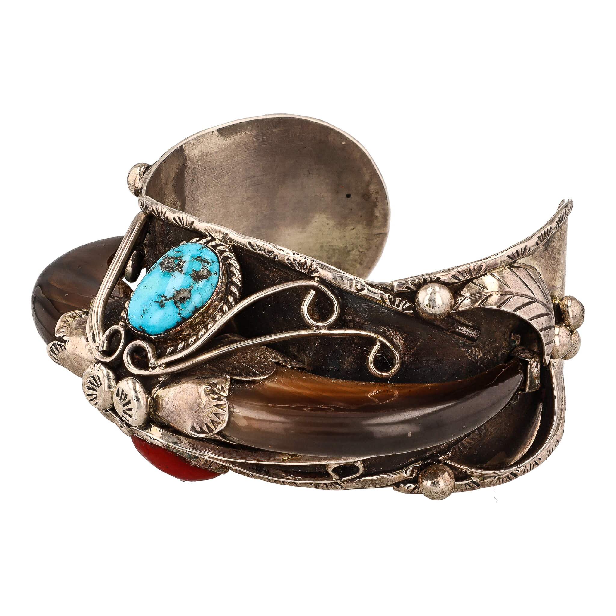 Signed MV Eagle Pictograph Incredible Bear Claw Coral Turquoise Sterling Shadow Box Overlay Cuff Bracelet 55g