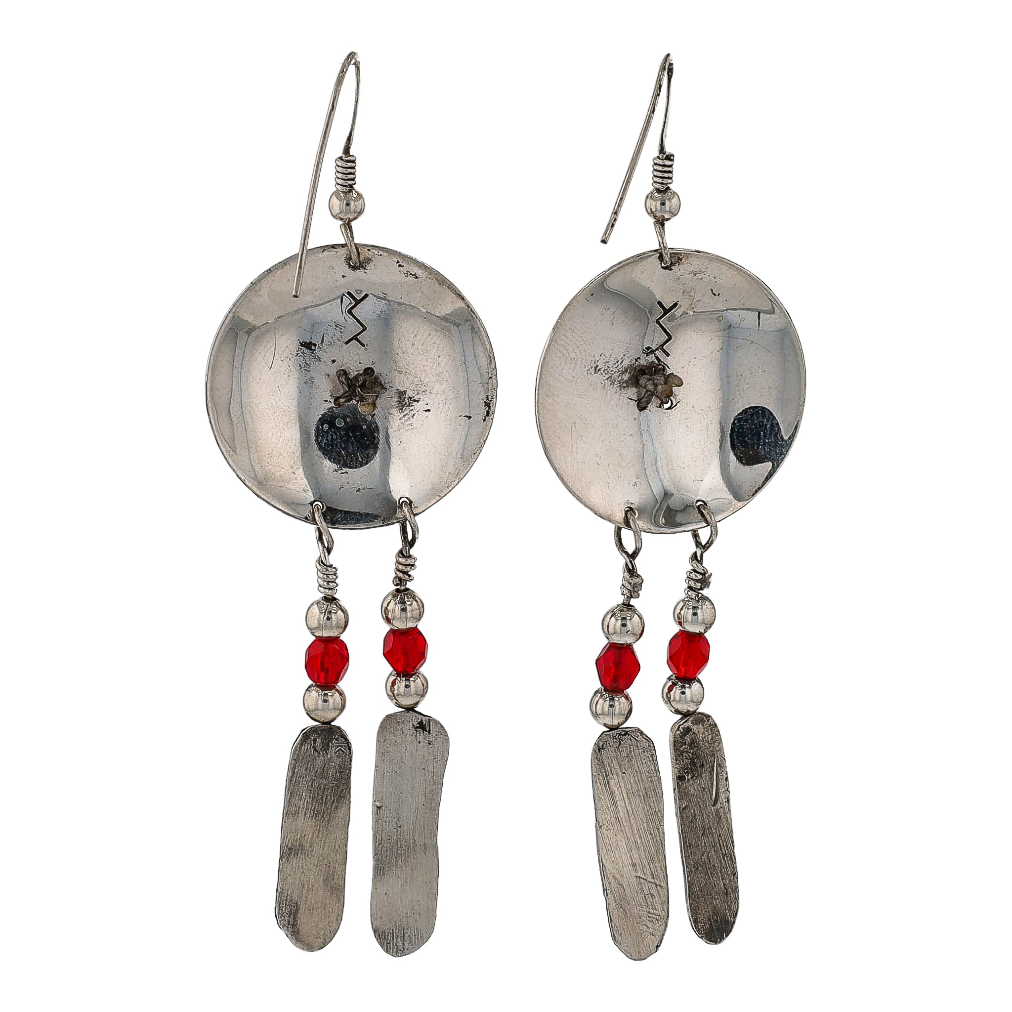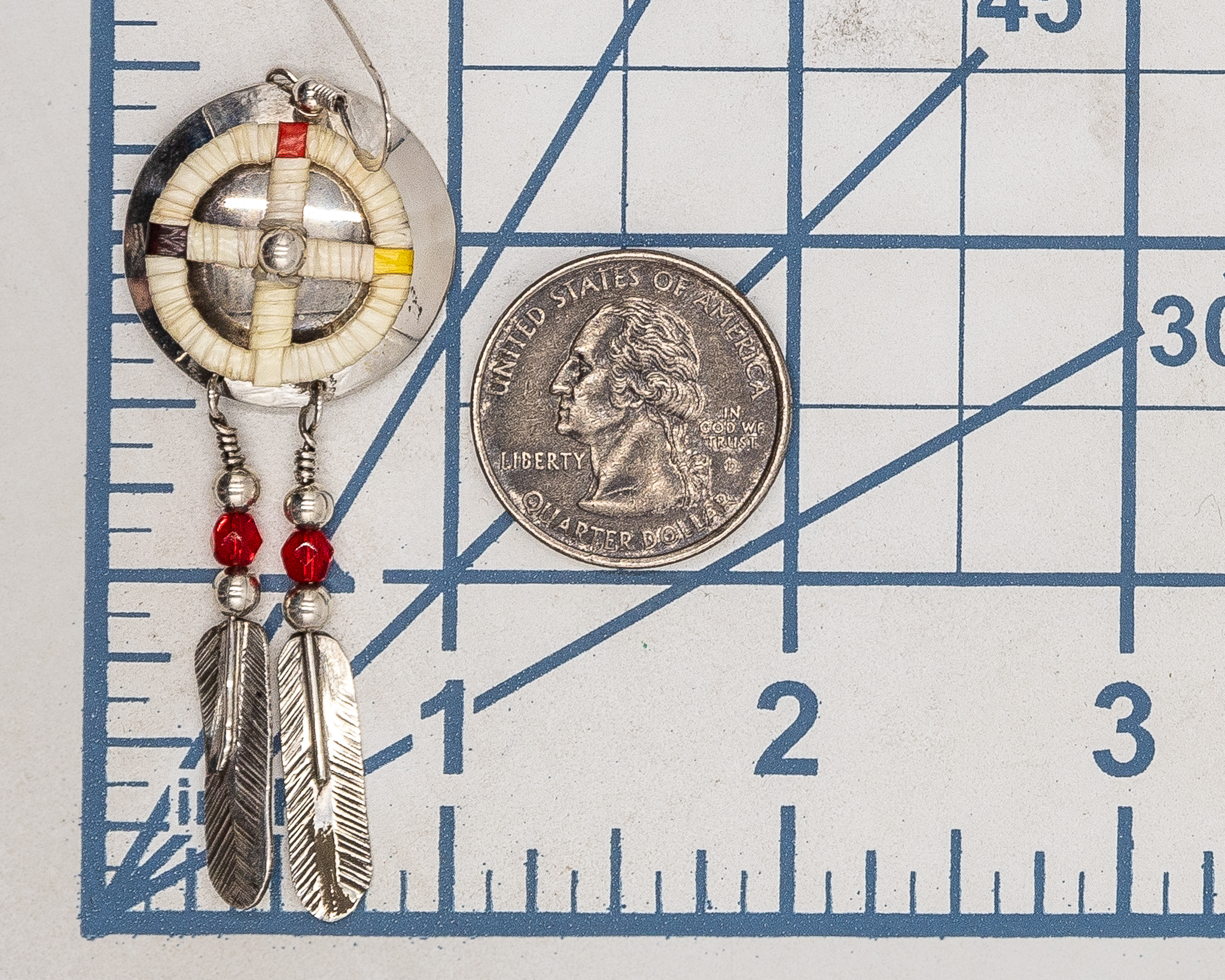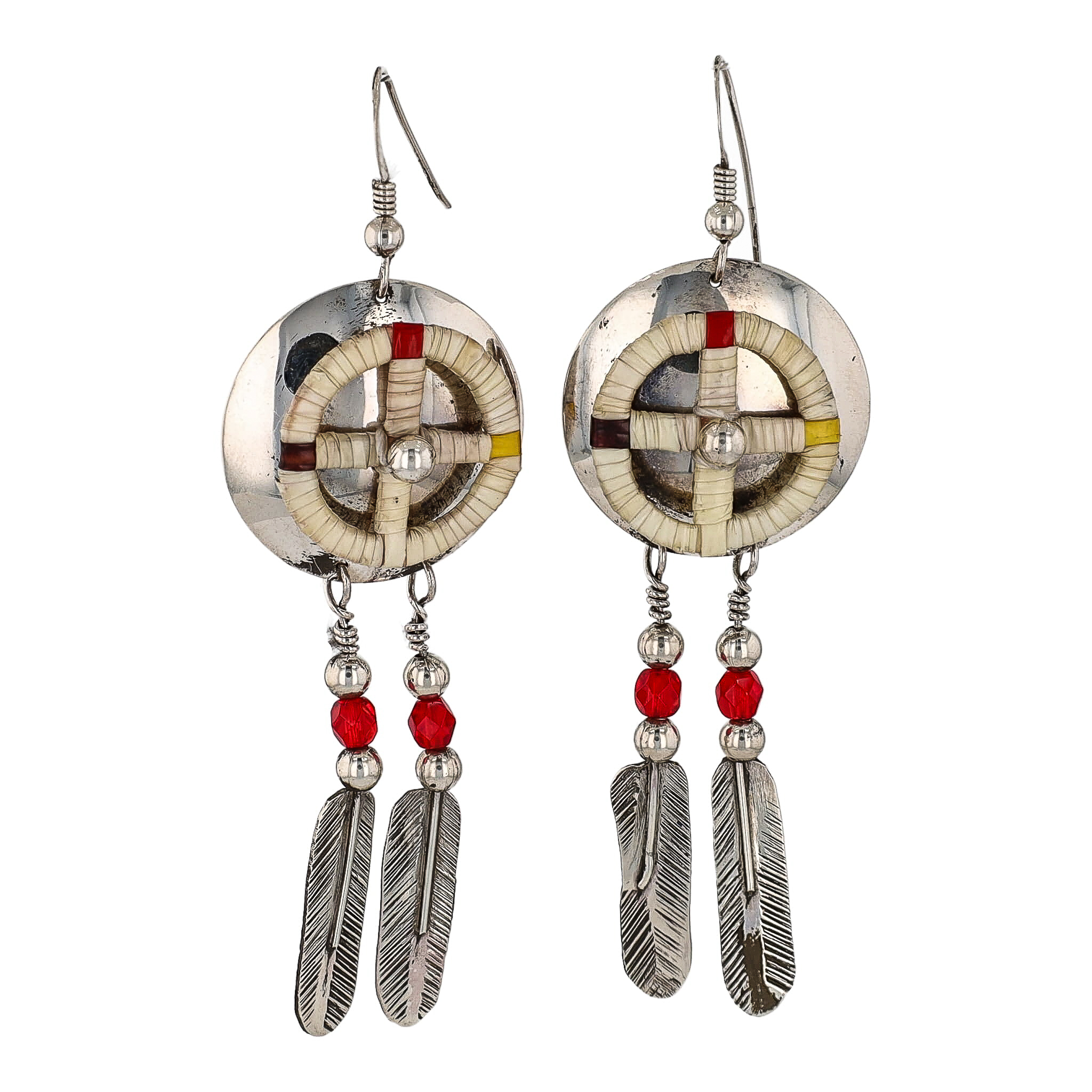 Signed Native American Sterling Medicine Wheel Feather Drop Dangle Earrings 11g-Pictograph Signature Stamp