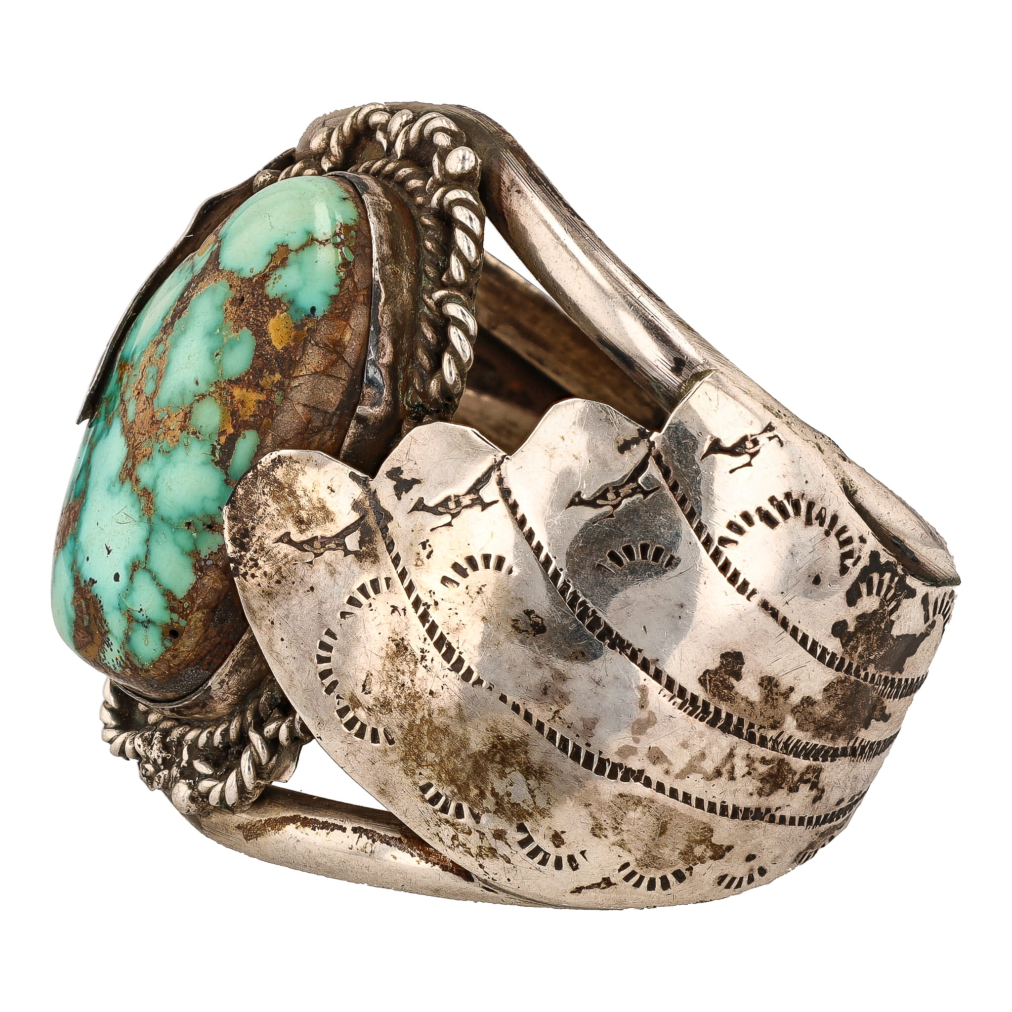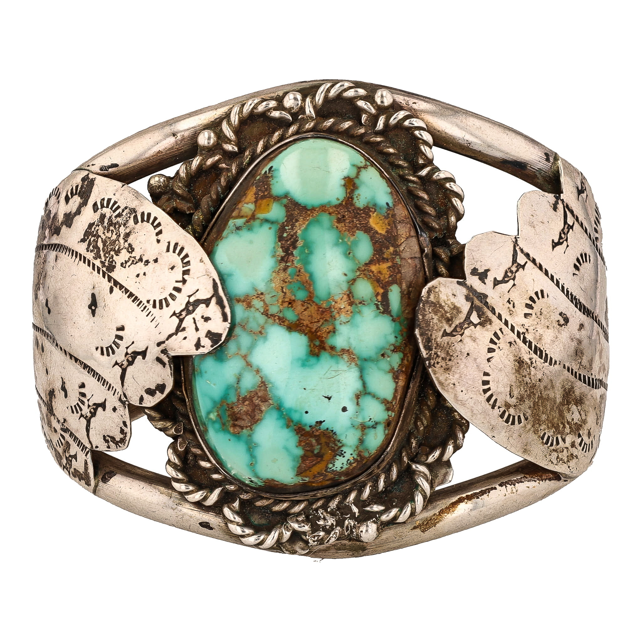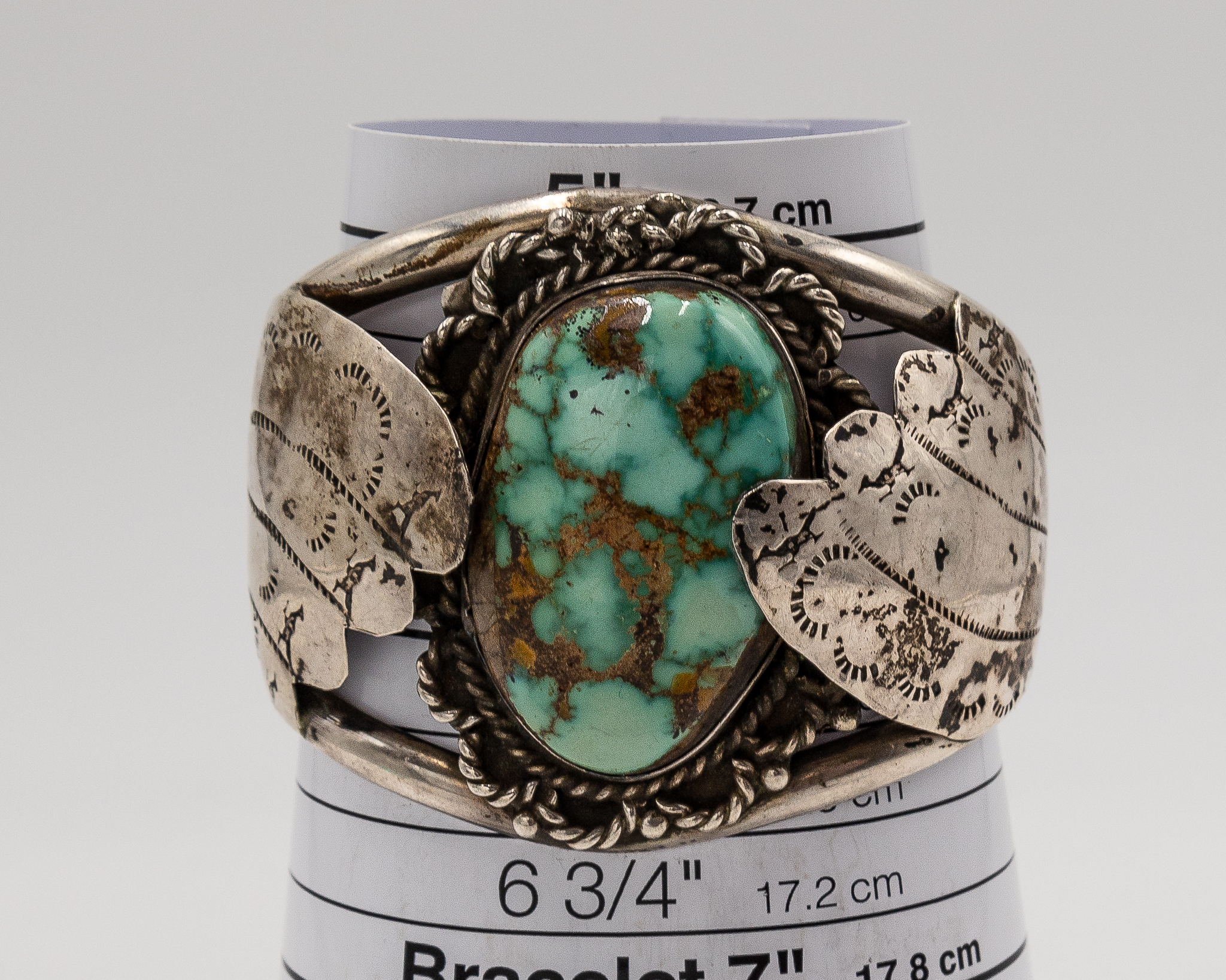 Amazing Vintage Navajo Royston Turquoise Sterling Leaf Cuff Bracelet 83g, Signed L in a Circle