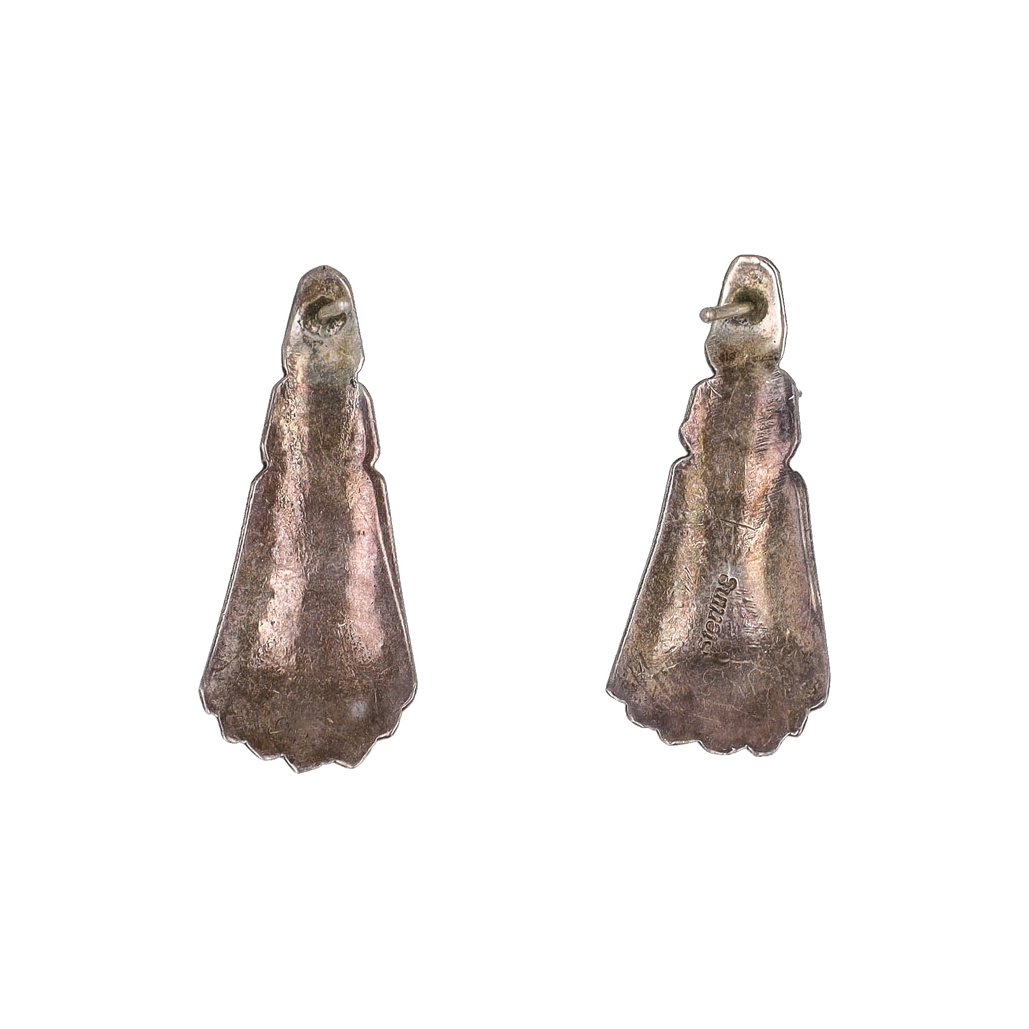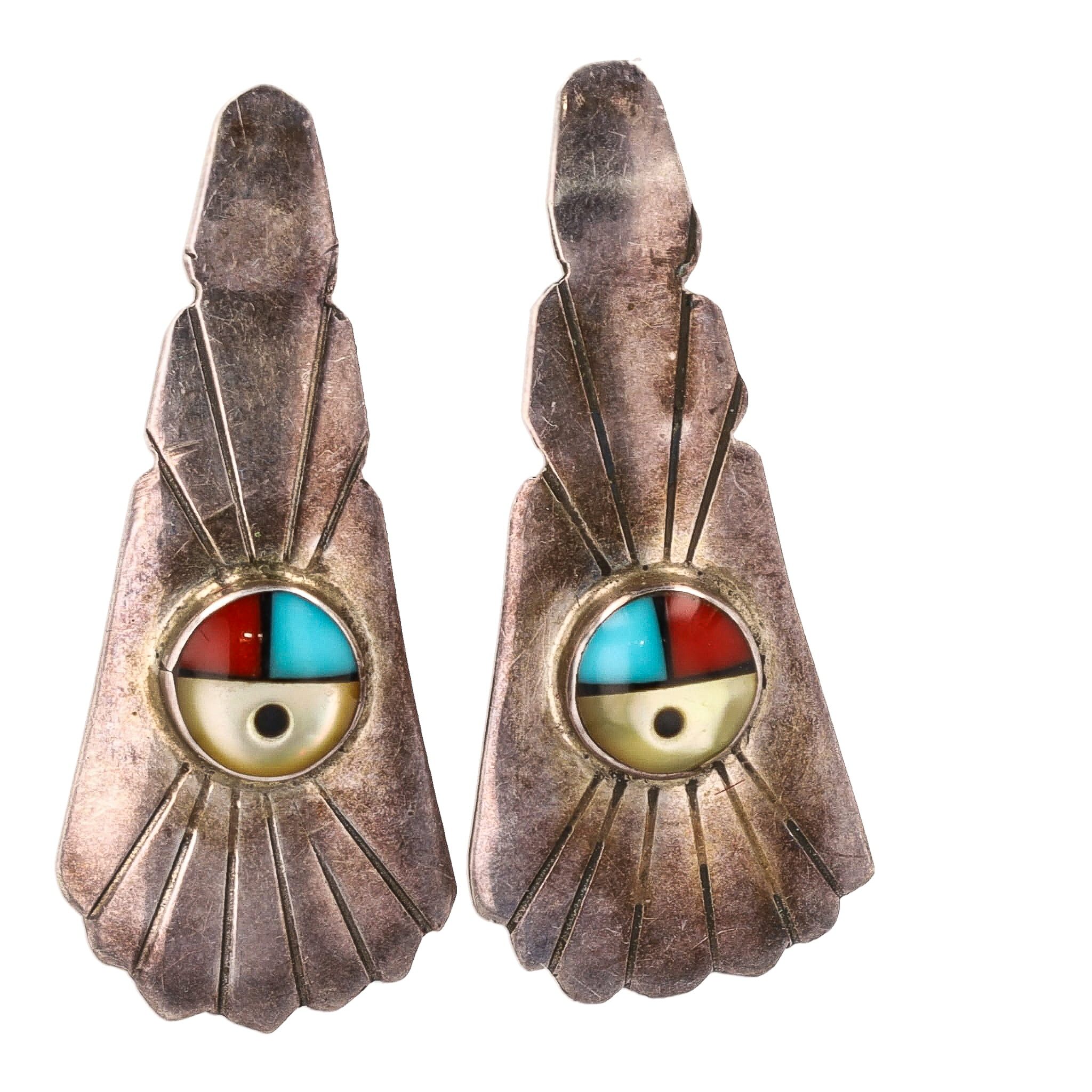 Vintage Zuni Multi Stone Sterling Sunface Inlay Earrings 3g-Coral, Turquoise, Mother of Pearl, Onyx