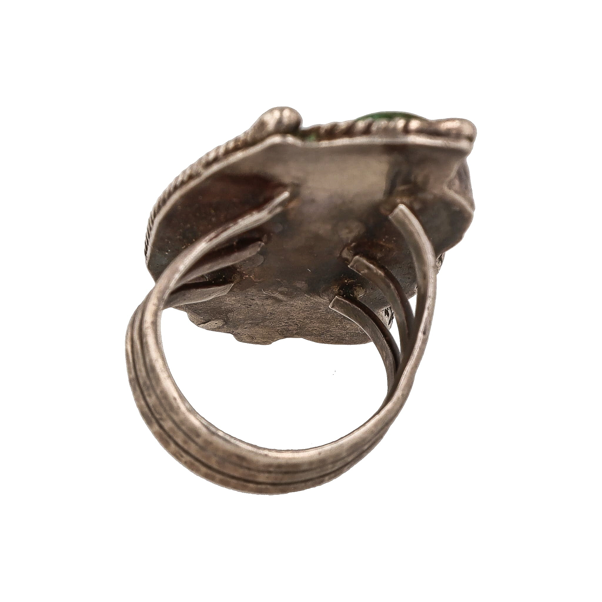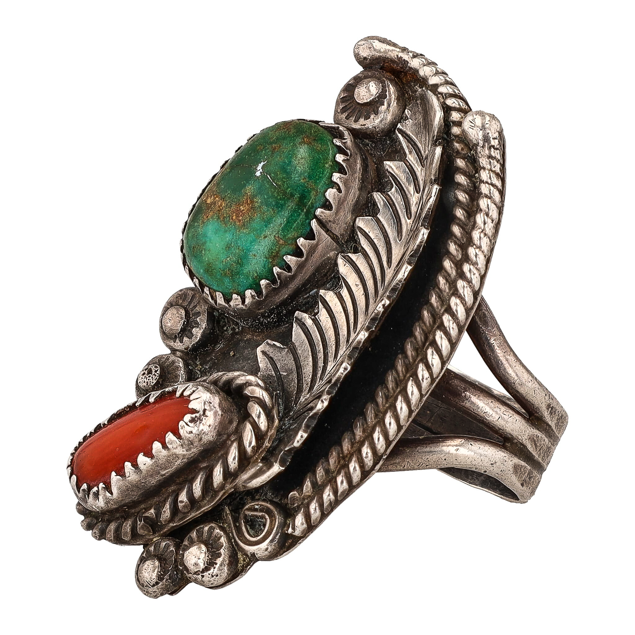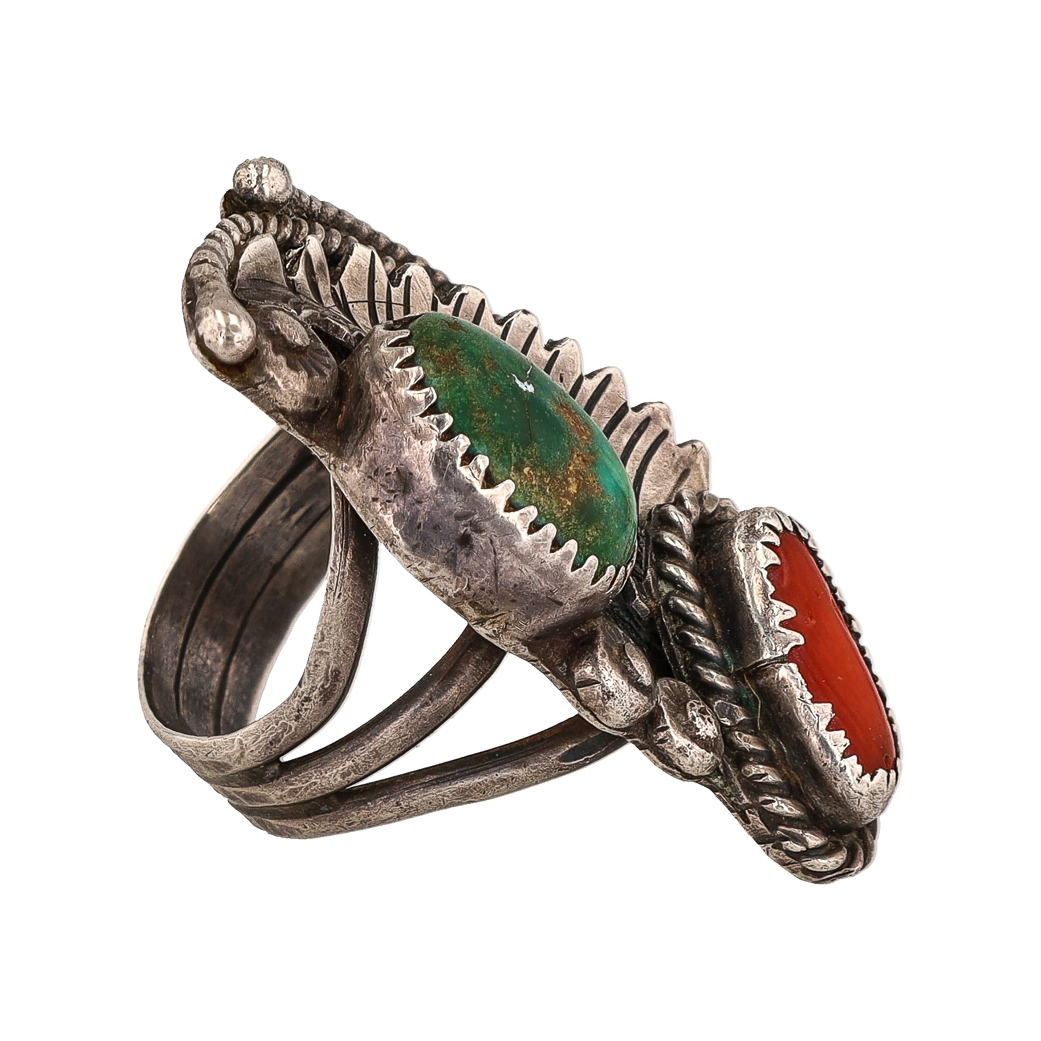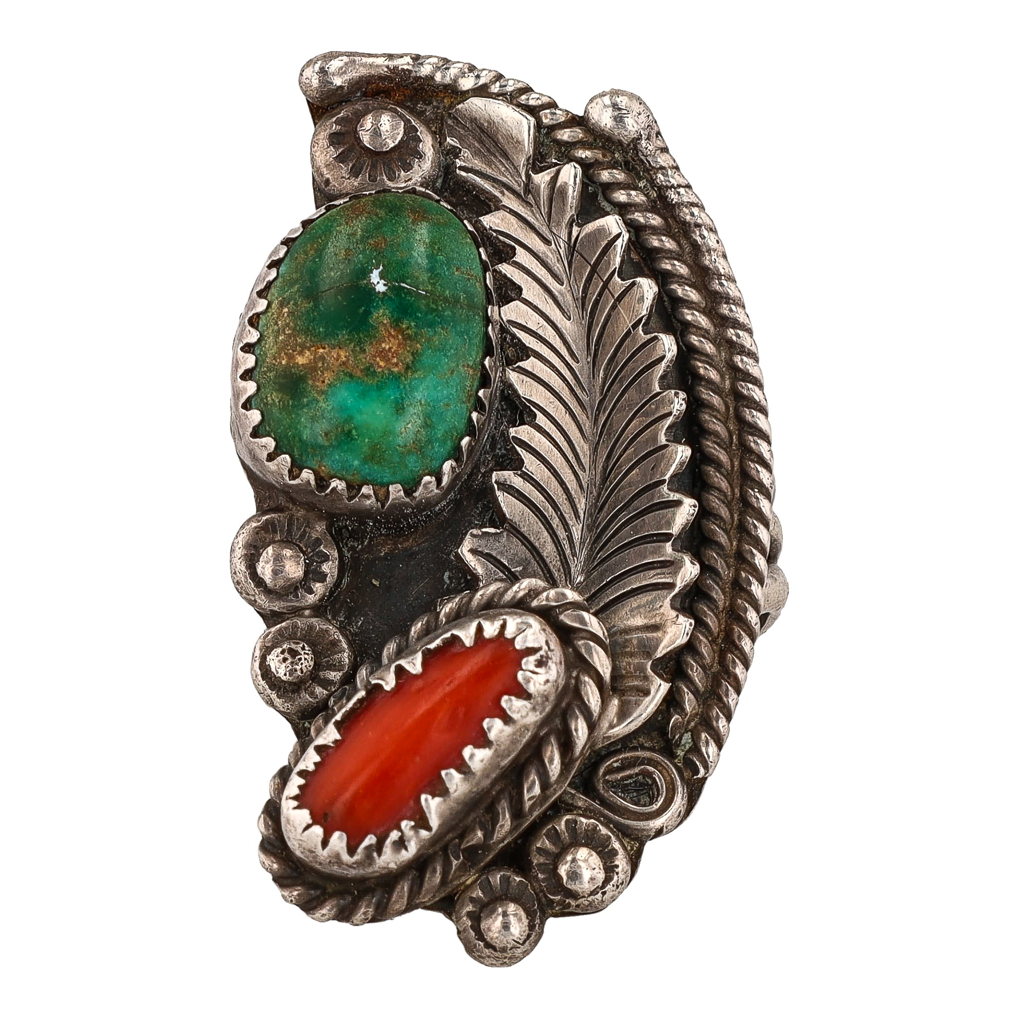 Vintage Navajo Coral Green Turquoise Sterling Leaf Ring Sz. 4.75 As Is, 12g-Band is Bent