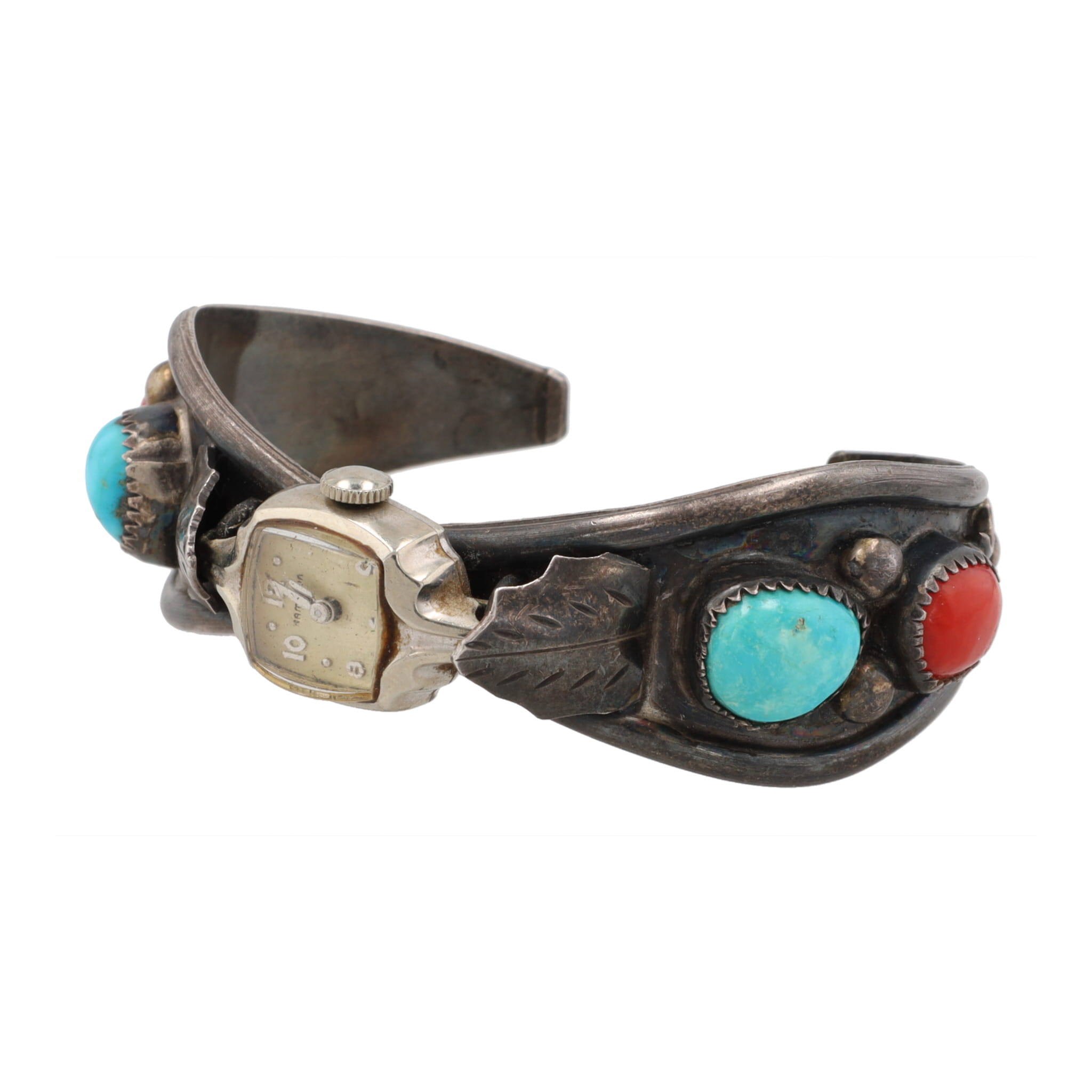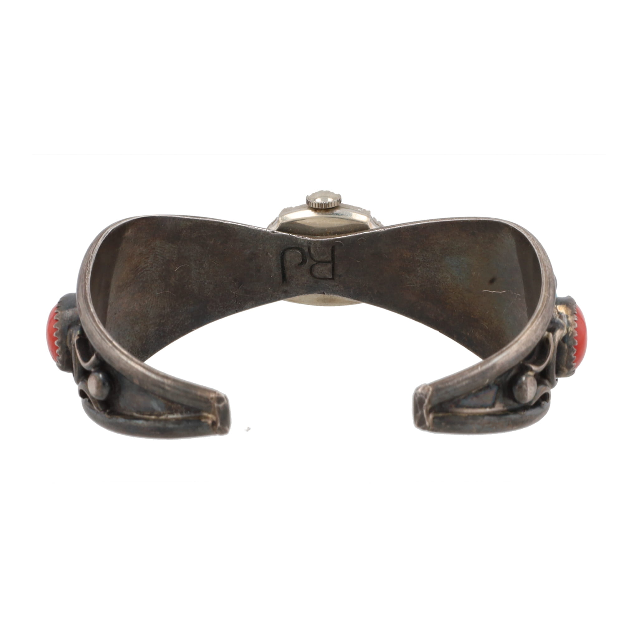 Roger Jones Navajo Turquoise Coral Sterling Hamilton Watch Cuff Bracelet 36.5g