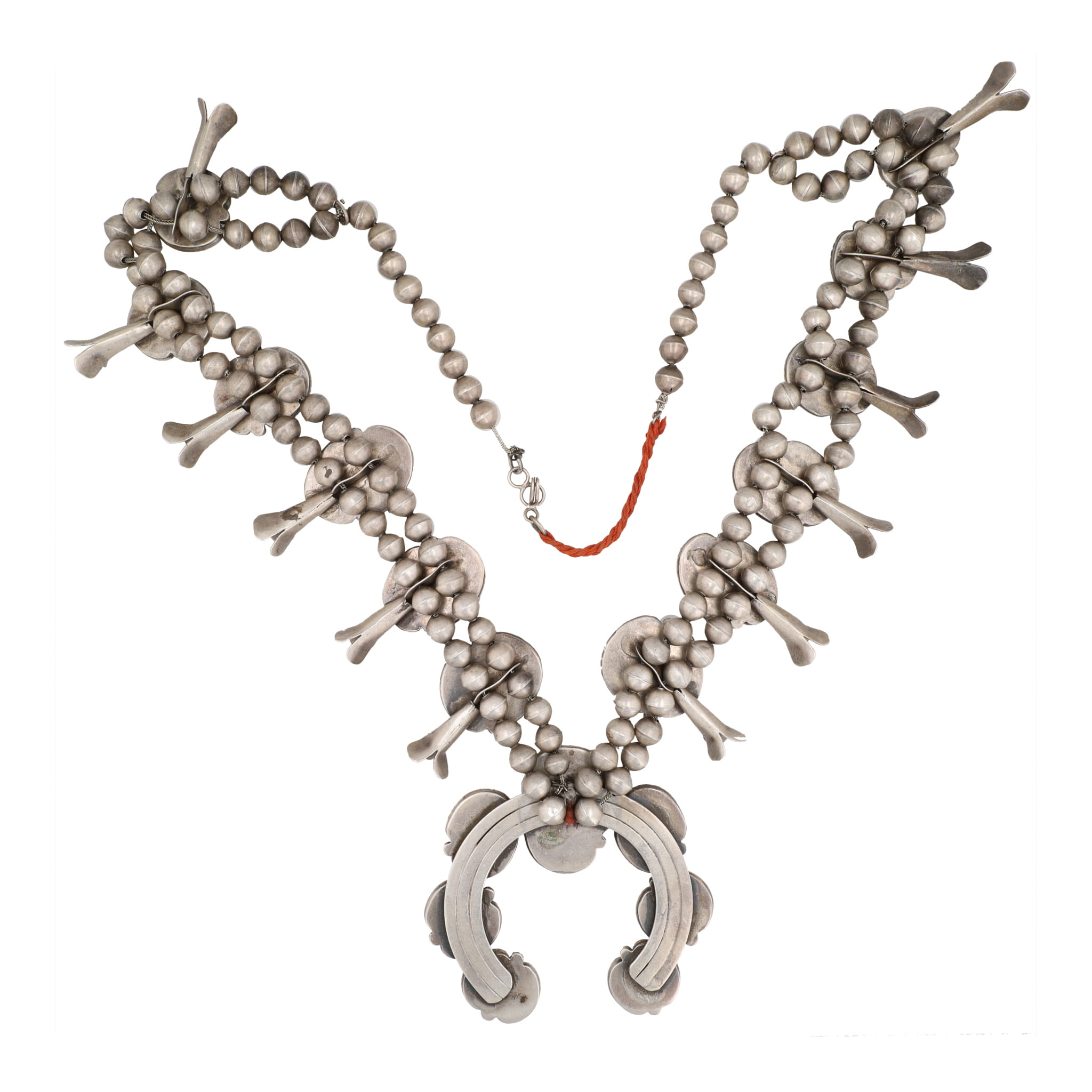 Huge Navajo Turquoise Sterling Bead Squash Blossom Necklace 224.5g, red string appears to be an extender for the necklace