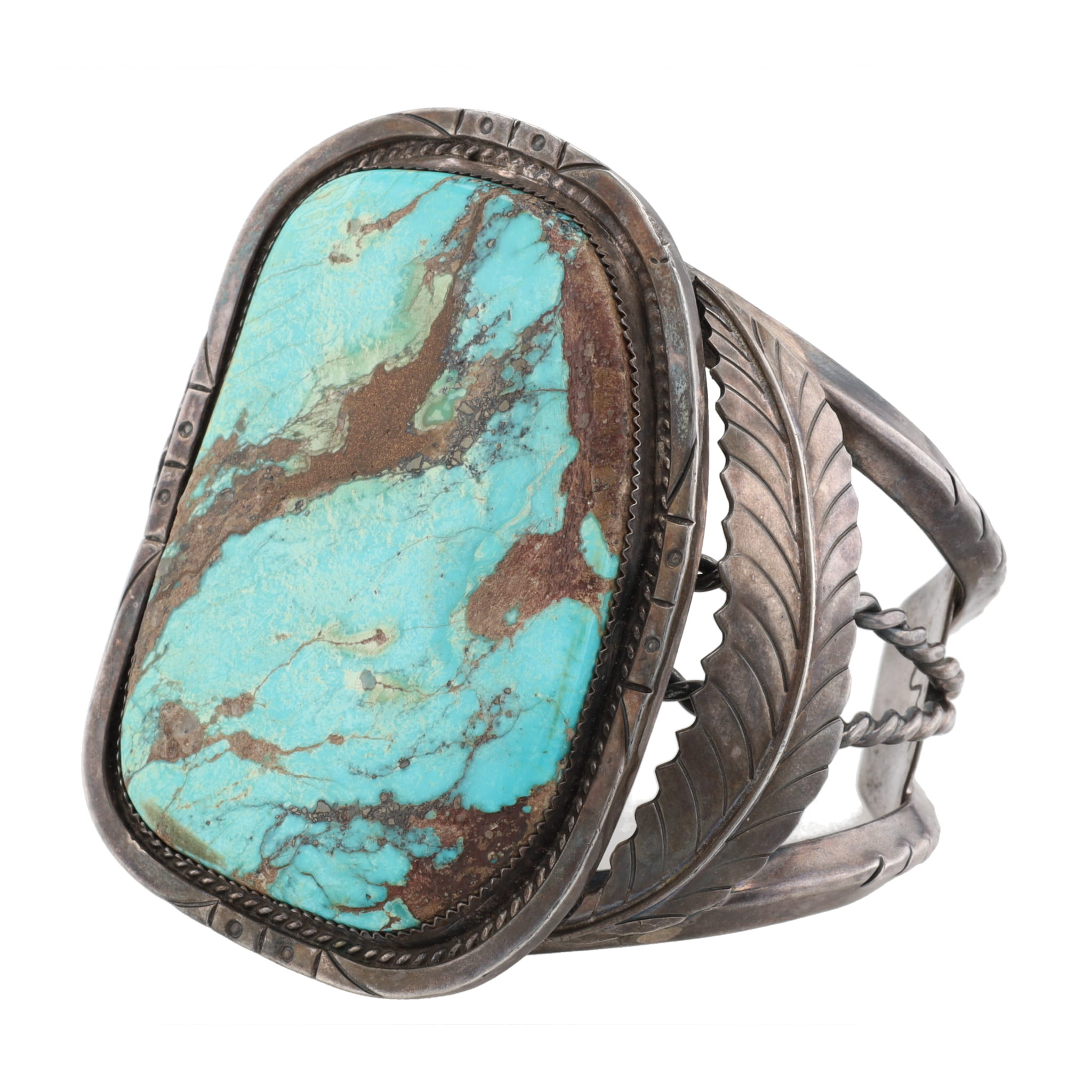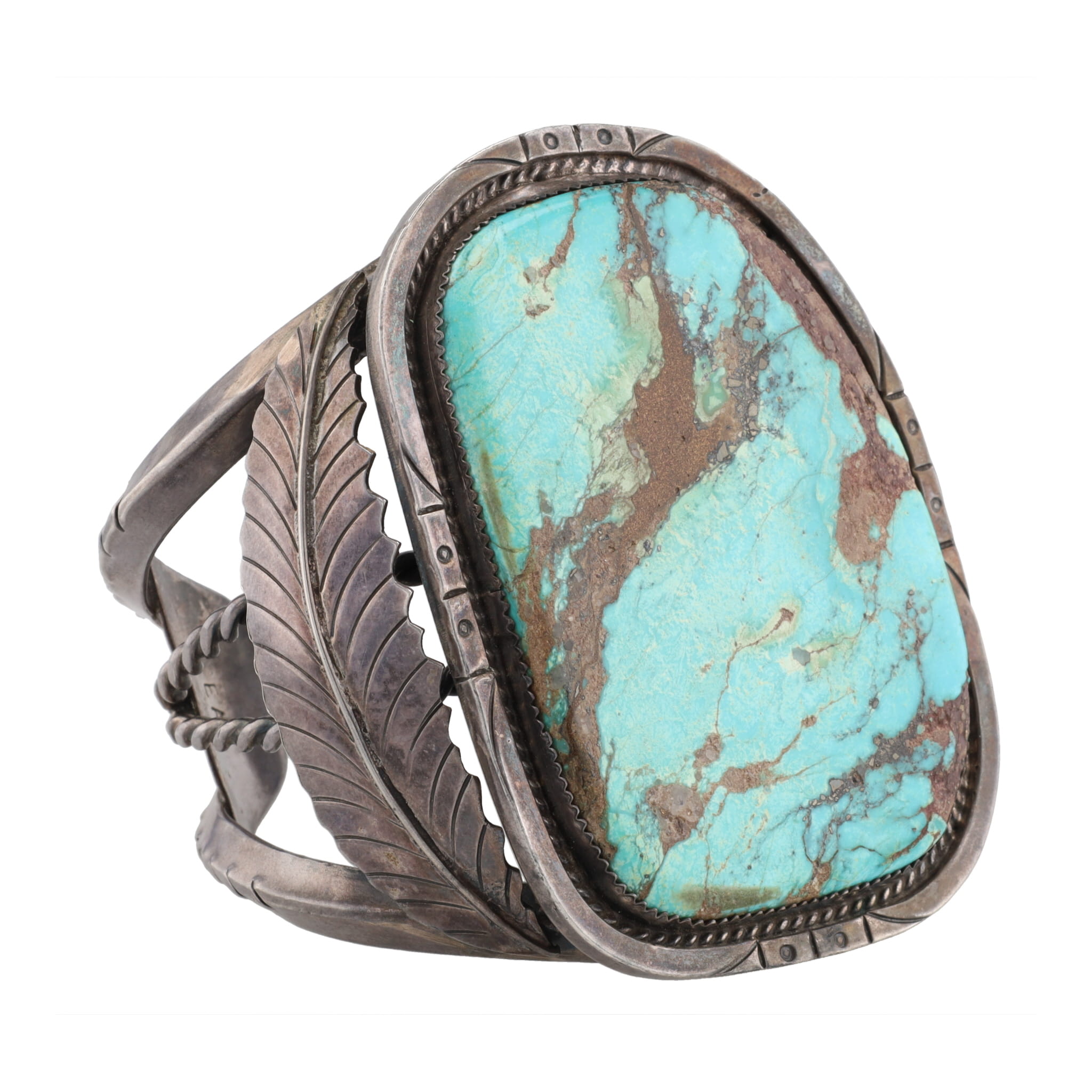 Signed EA Pictograph Navajo Huge Chunk Royston Turquoise Sterling Leaf Cuff Bracelet 173.5g
