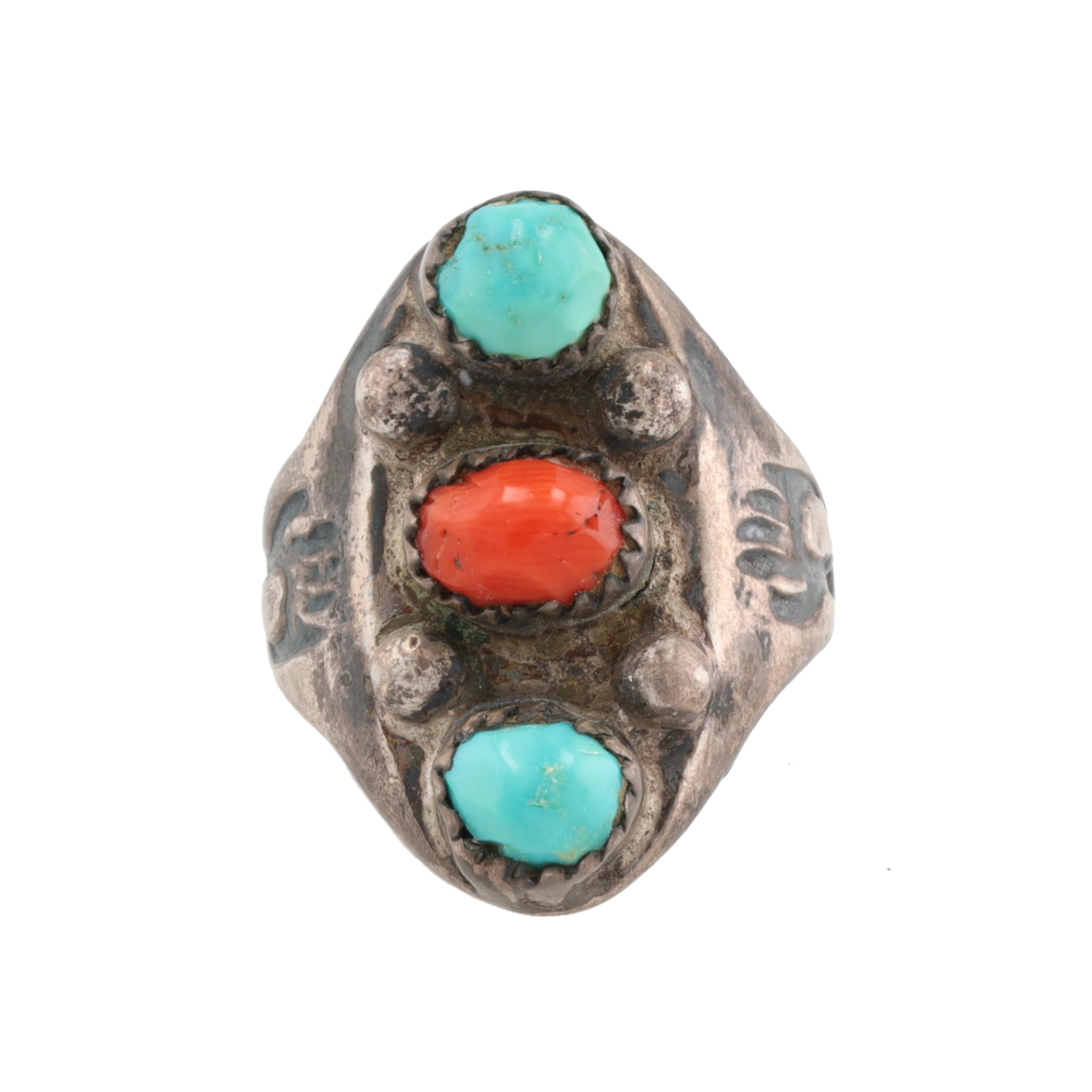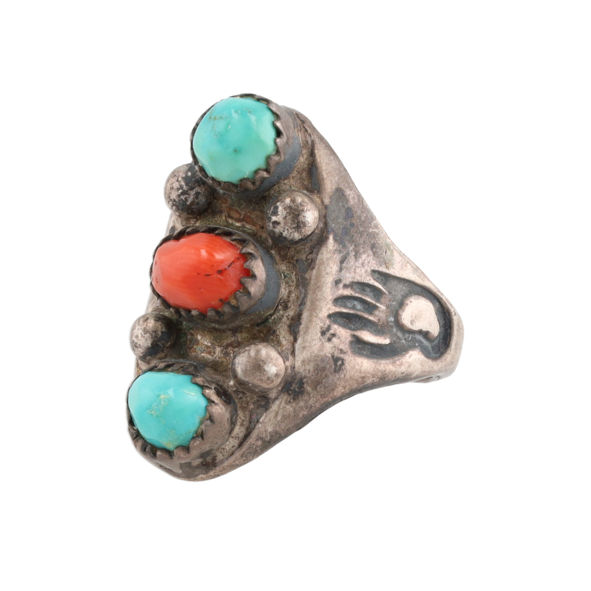 Navajo Turquoise Coral Sterling Bear Paw Ring Sz. 7.75, 13g