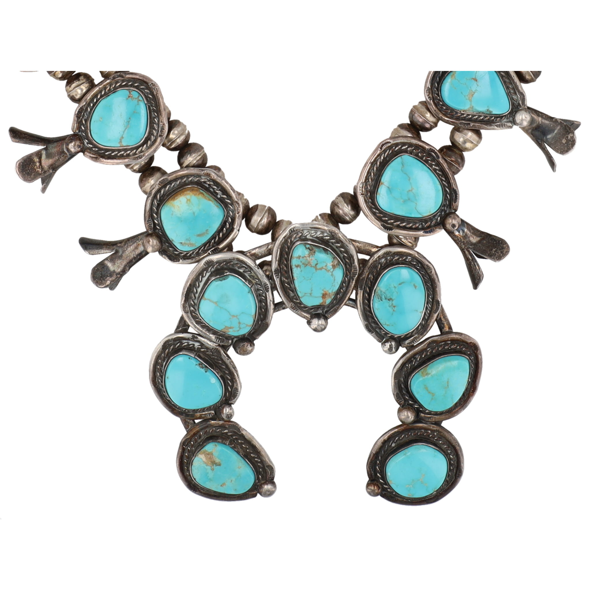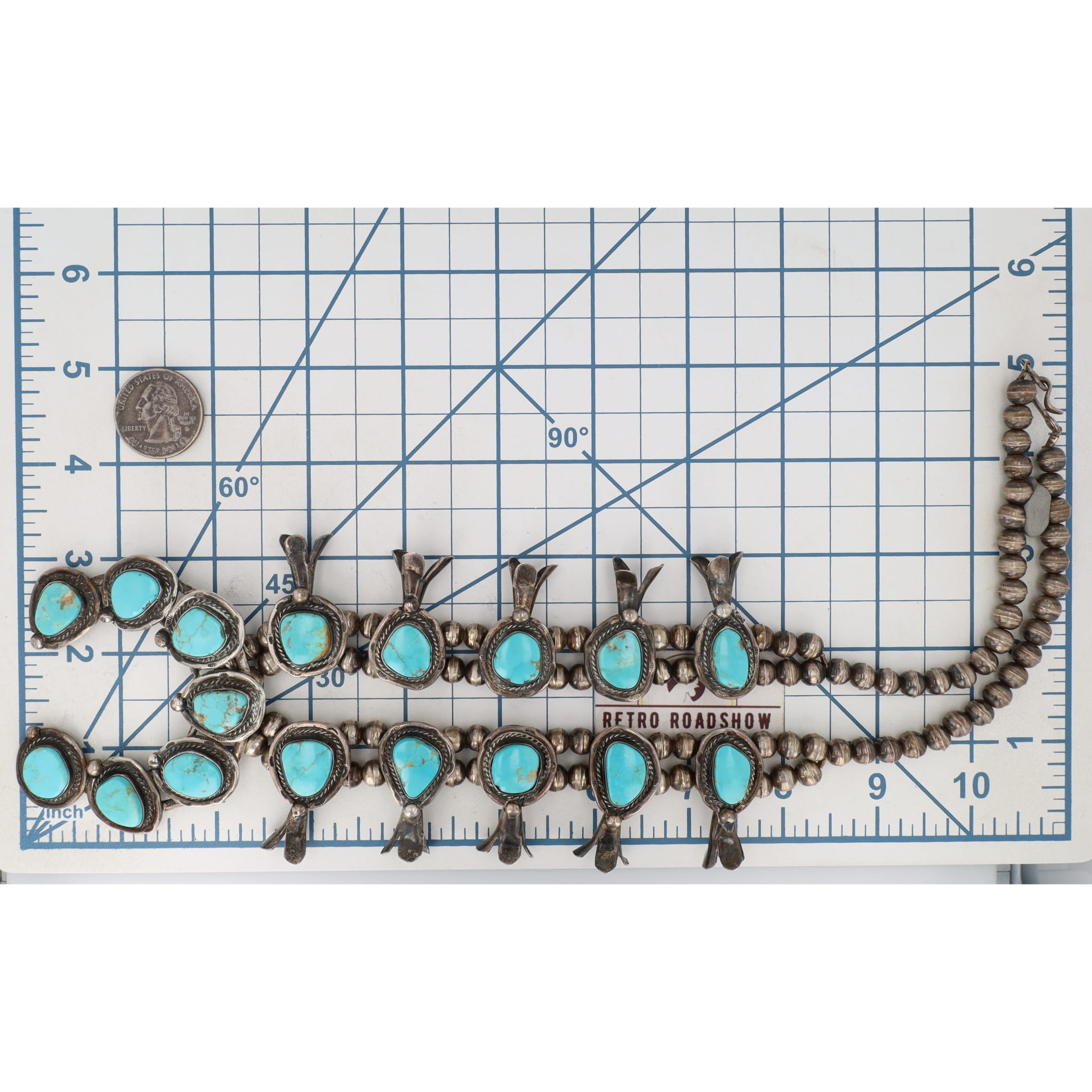 Navajo Turquoise Sterling Squash Blossom Necklace 148.5g. Approximately 23″ long end-to-end.