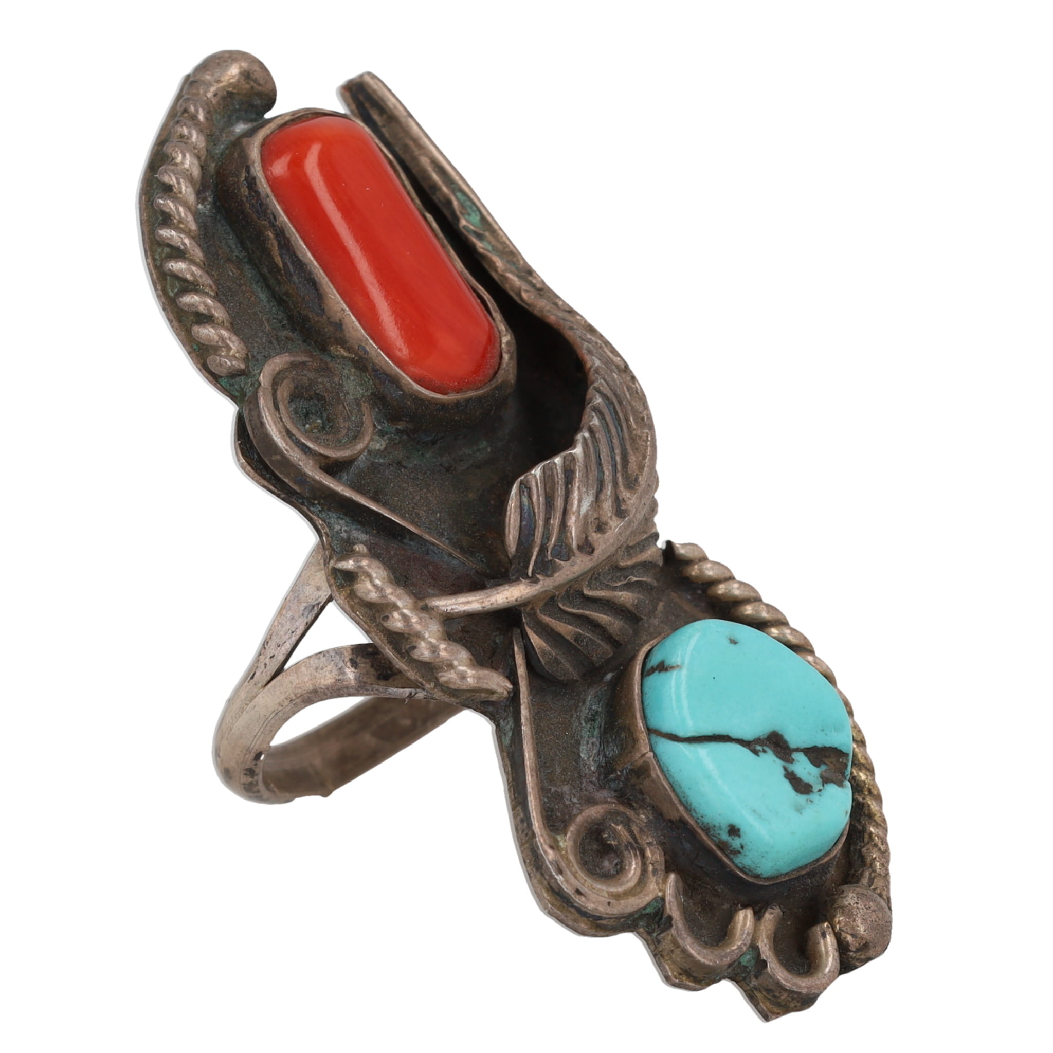 Signed JD Navajo Turquoise Coral Sterling Leaf Ring Sz. 5.25, 13.5g