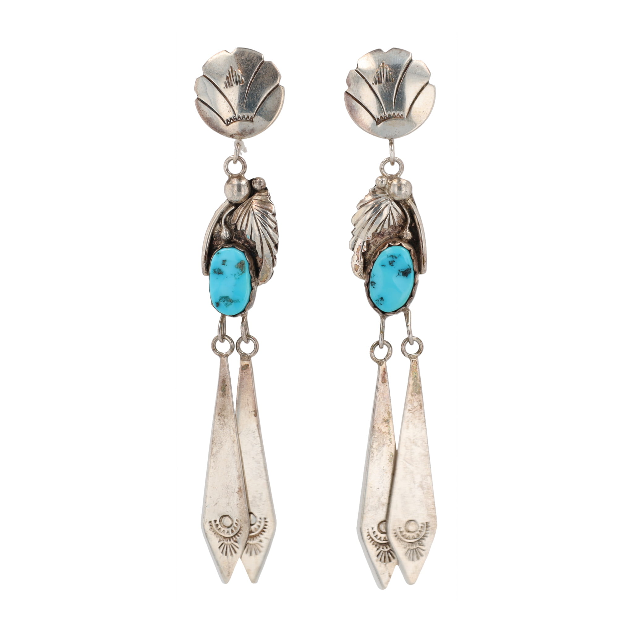 Juan Guerro Navajo Turquoise Sterling Feather Dangle Earrings