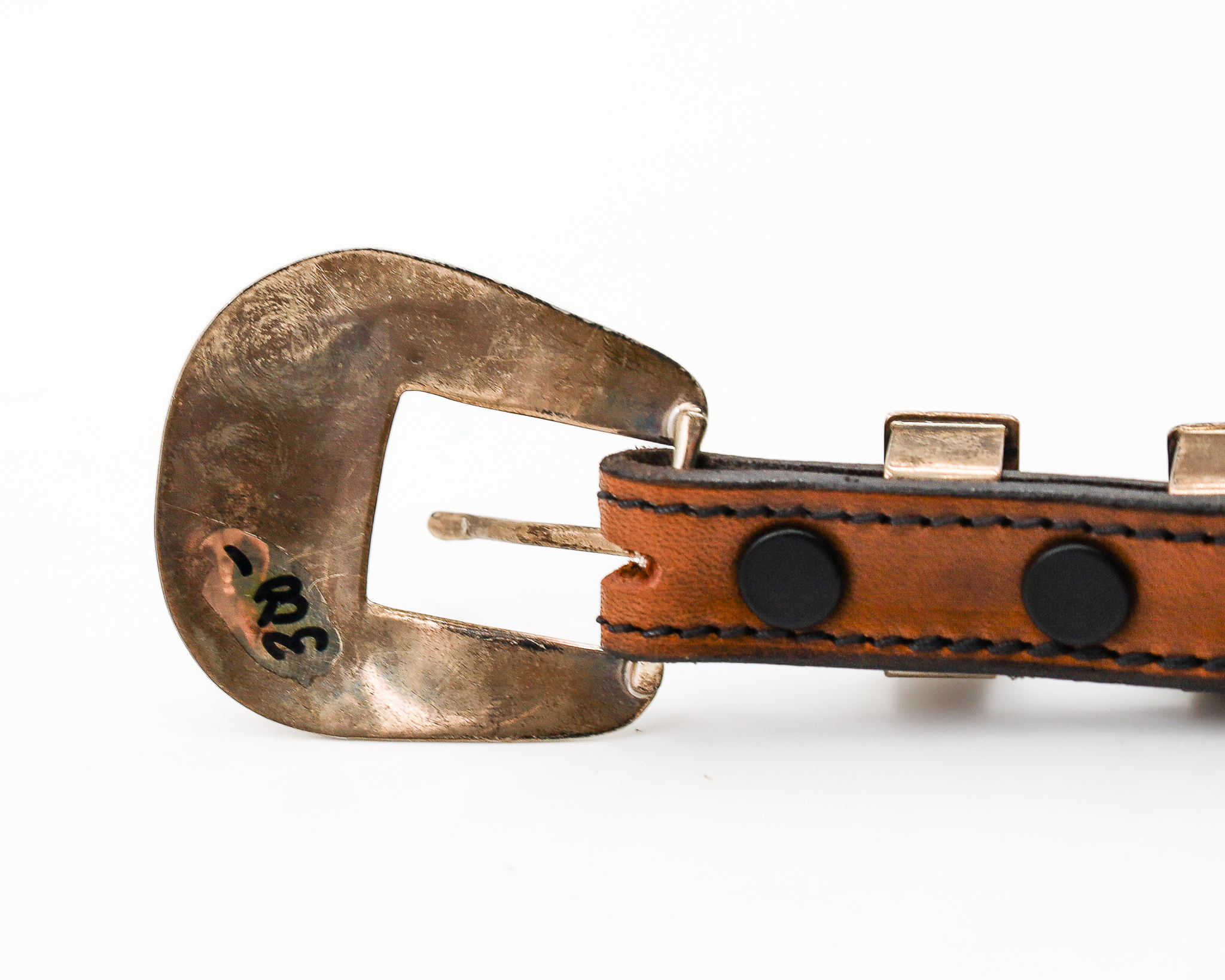 Jeremy Delgarito Navajo Sterling Stamped Belt Pieces on Leather Belt. Pieces Approx. 40g. Belt tip not weighed. Approximately 38″ long end-to-end.