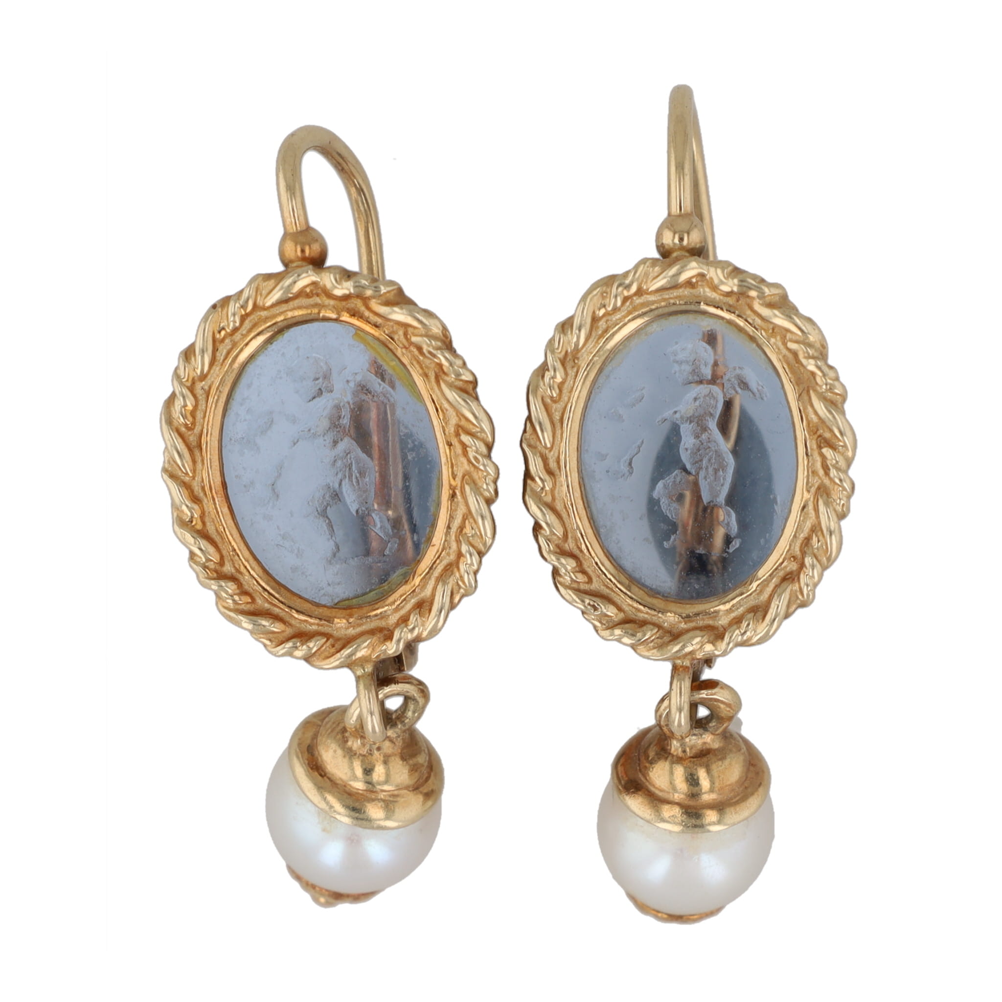 14k Gold Tagliamonte Venetian Glass intaglio Pearl Drop Earrings Signed 5.6g