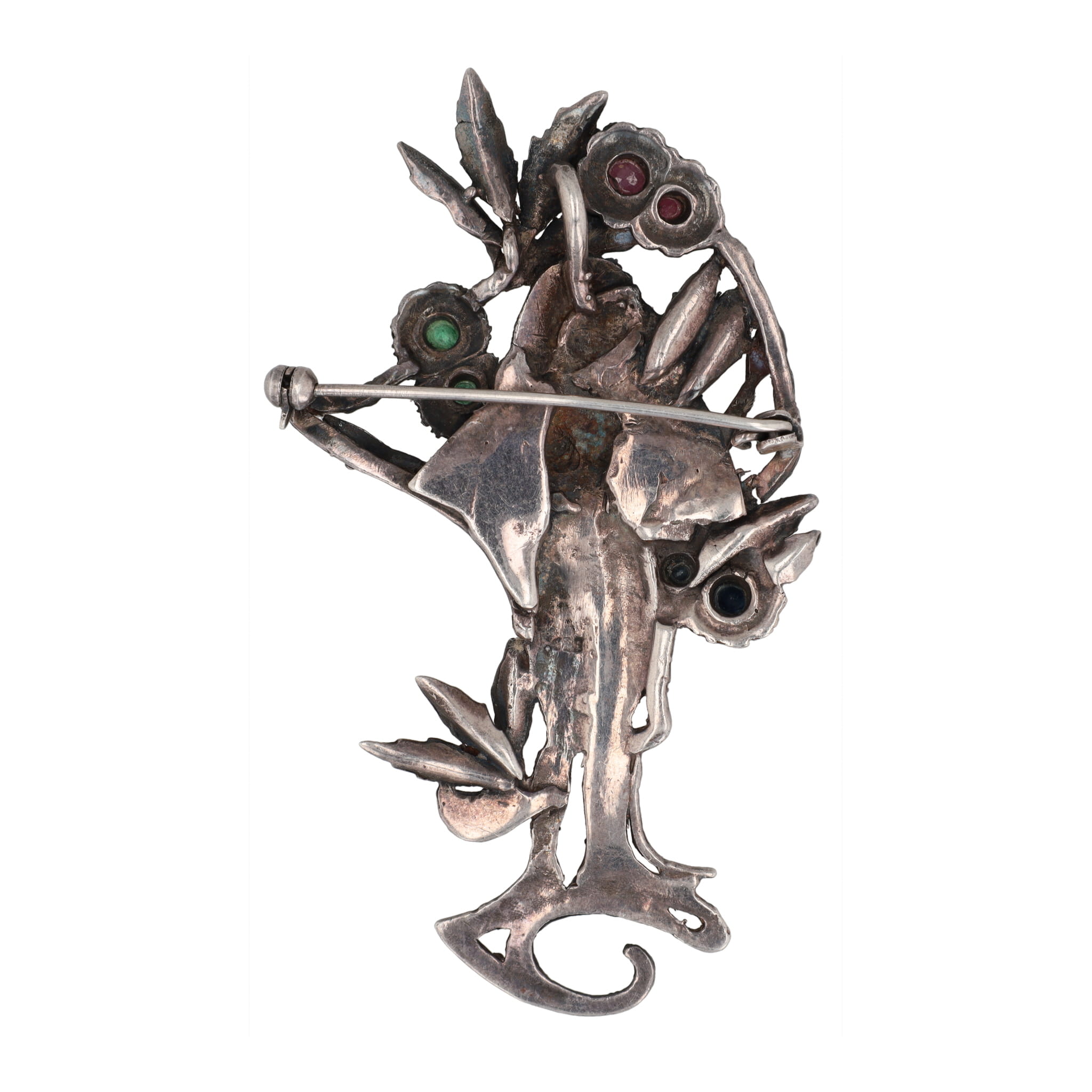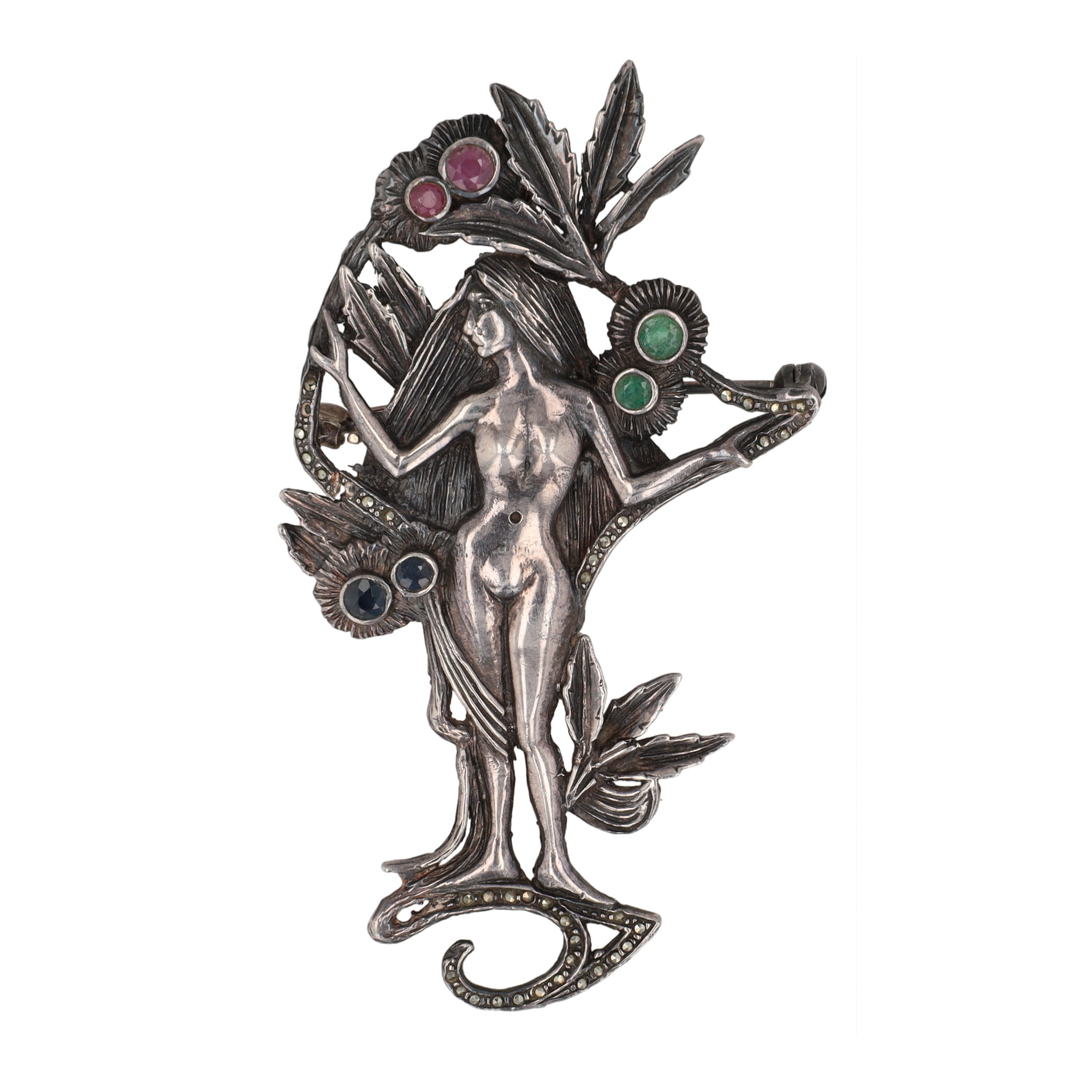 Art Nouveau Sterling Nude Woman Rubies Emeralds Sapphires Marcasite Brooch, 20.9g, 8cm Tall