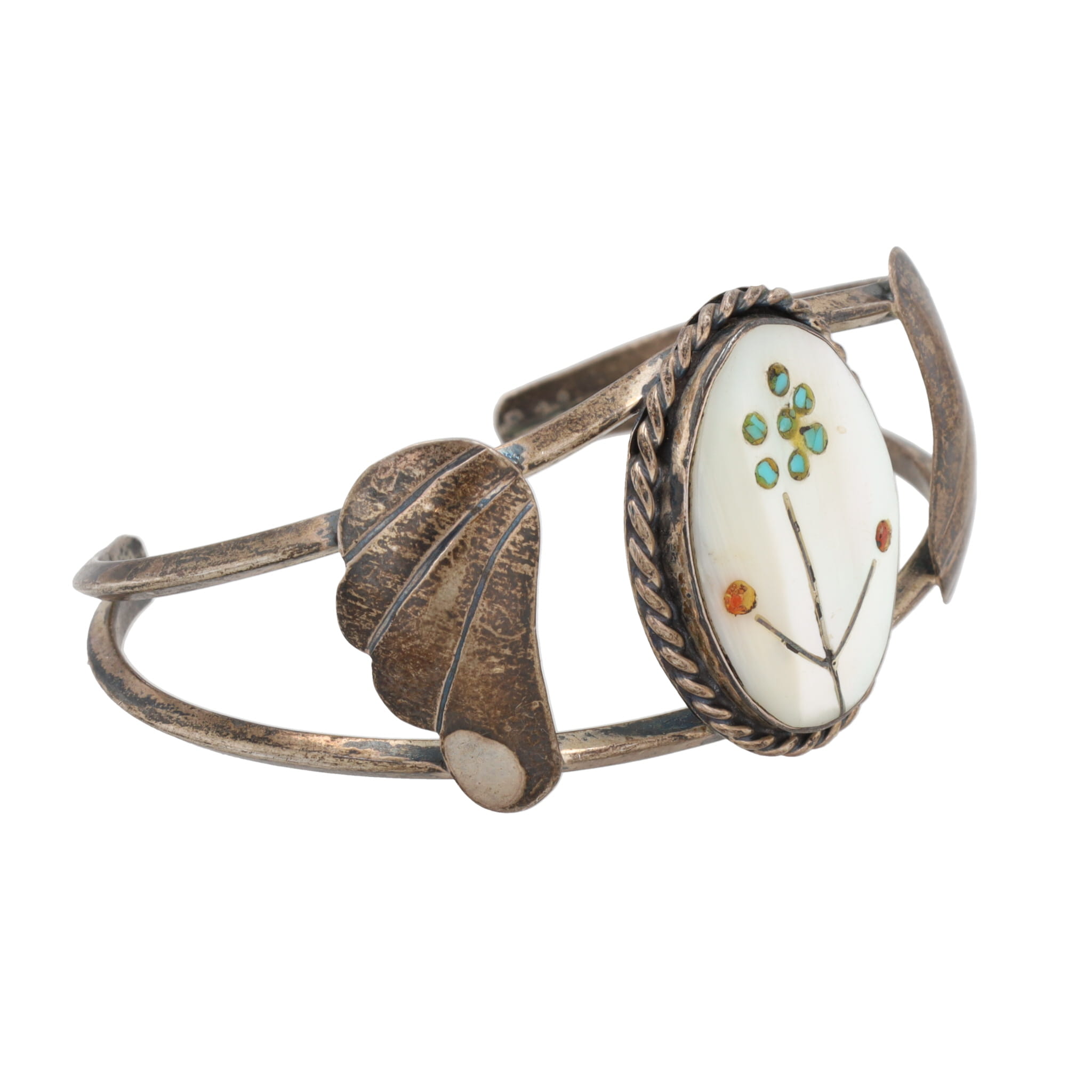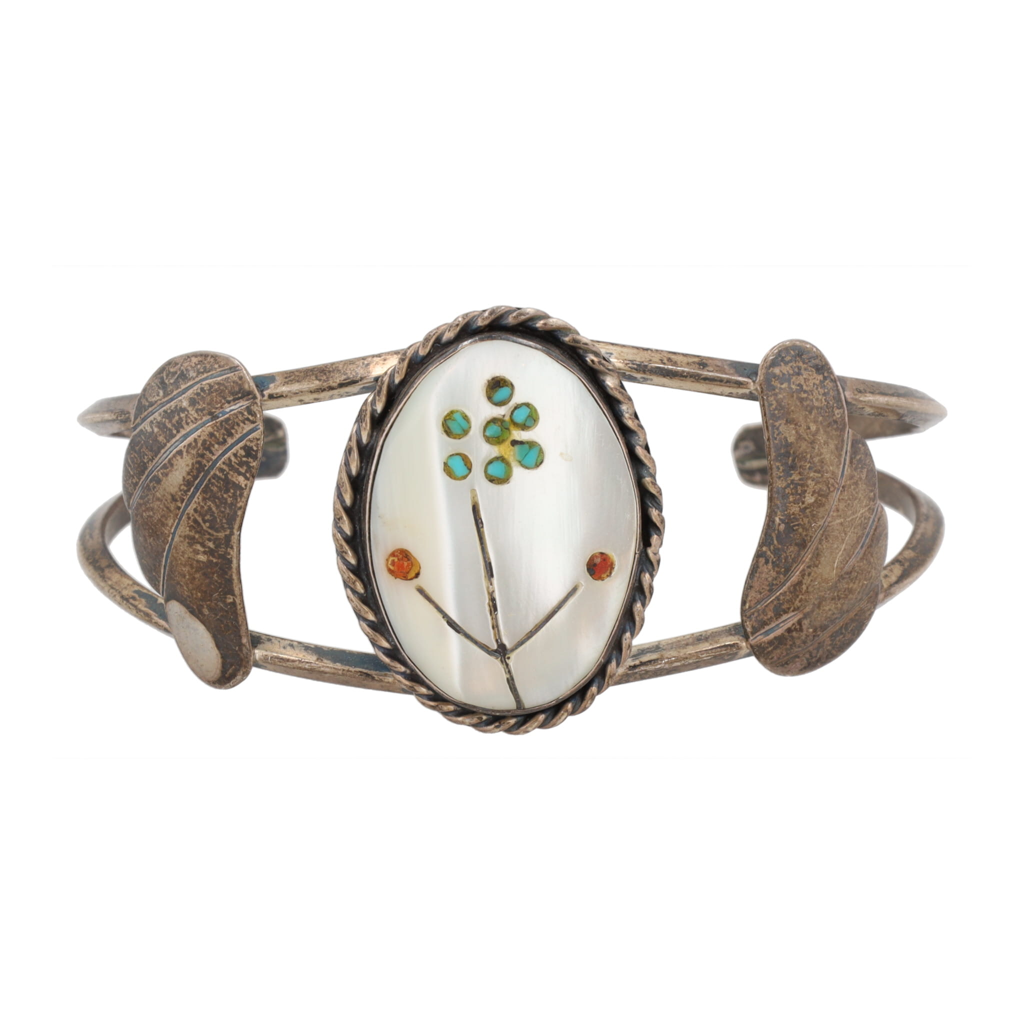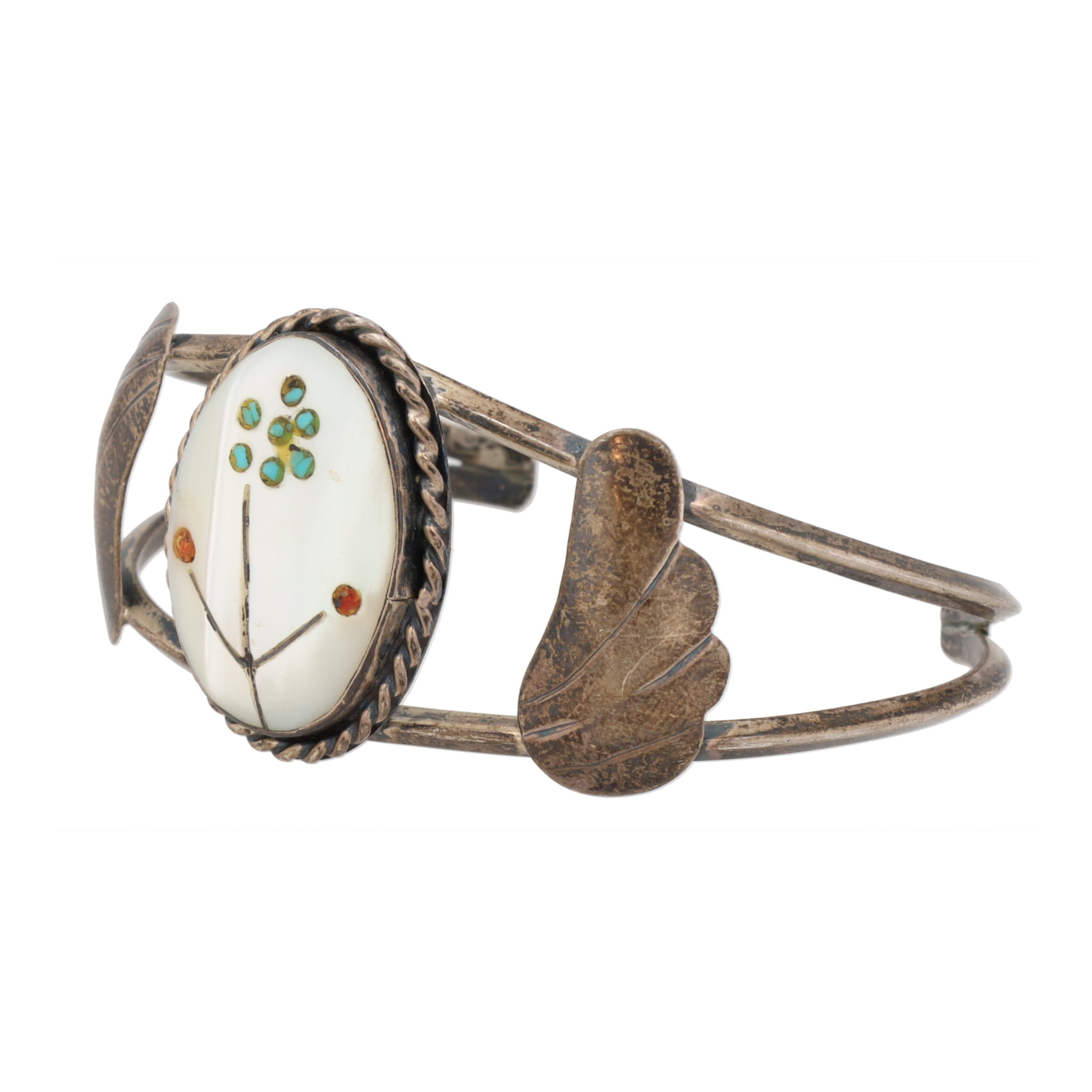 Zuni Coral Turquoise Mother Of Pearl Flower Cuff Bracelet 17g