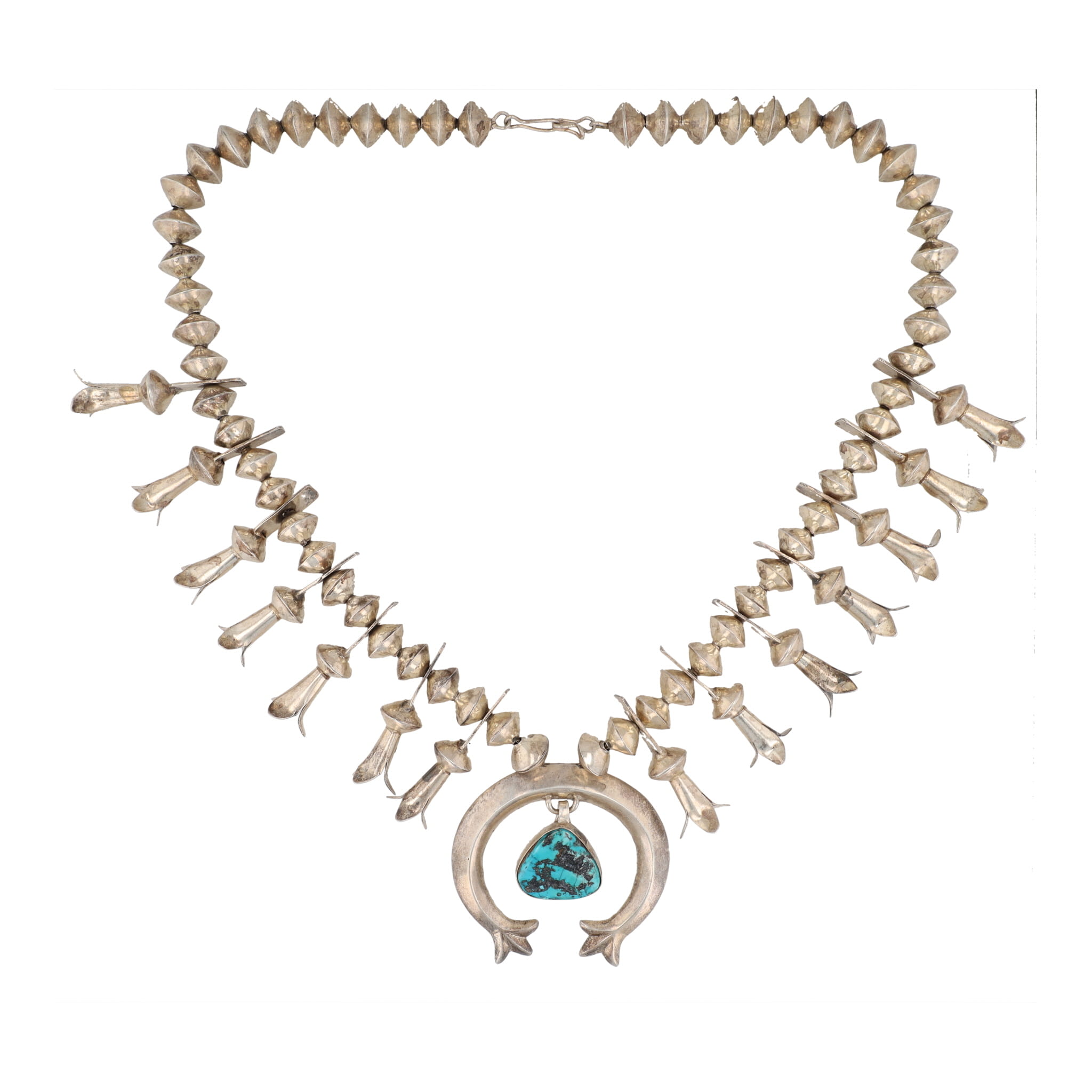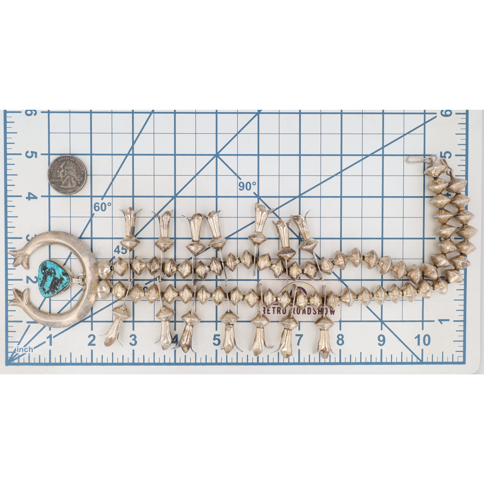 Navajo Turquoise Sand Cast Sterling Squash Blossom Necklace