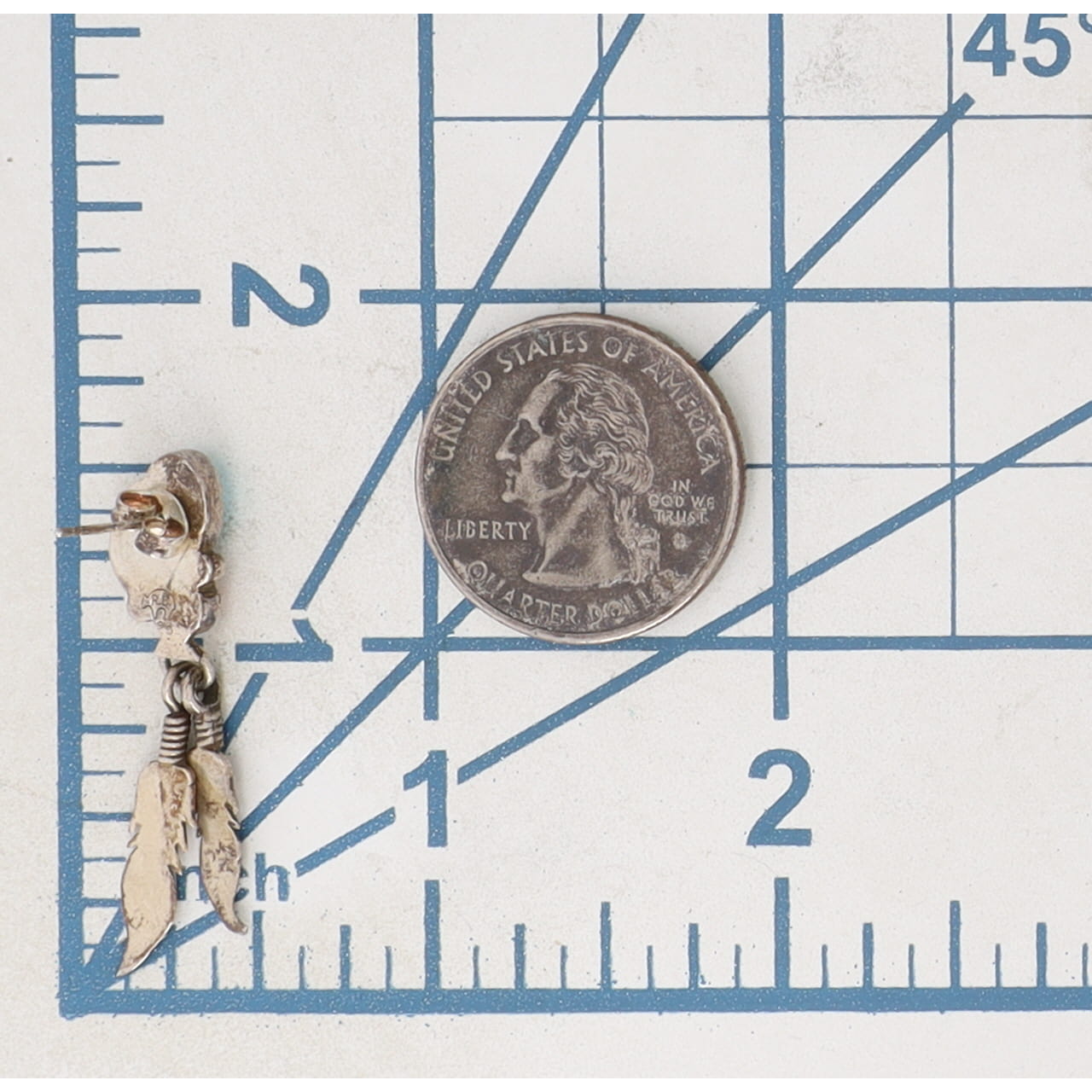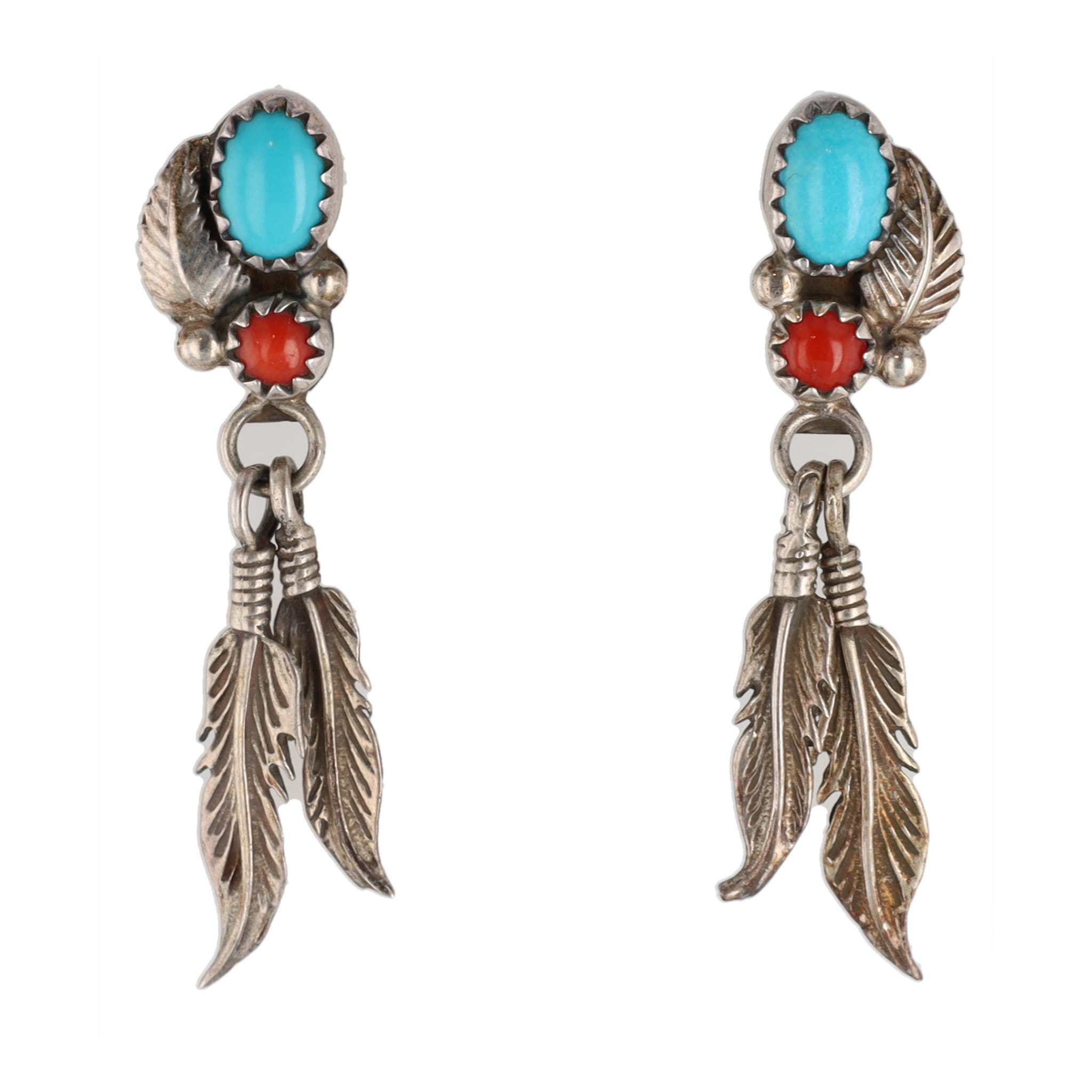 Running Bear Coral Turquoise Sterling Feather Dangle Earrings 4g