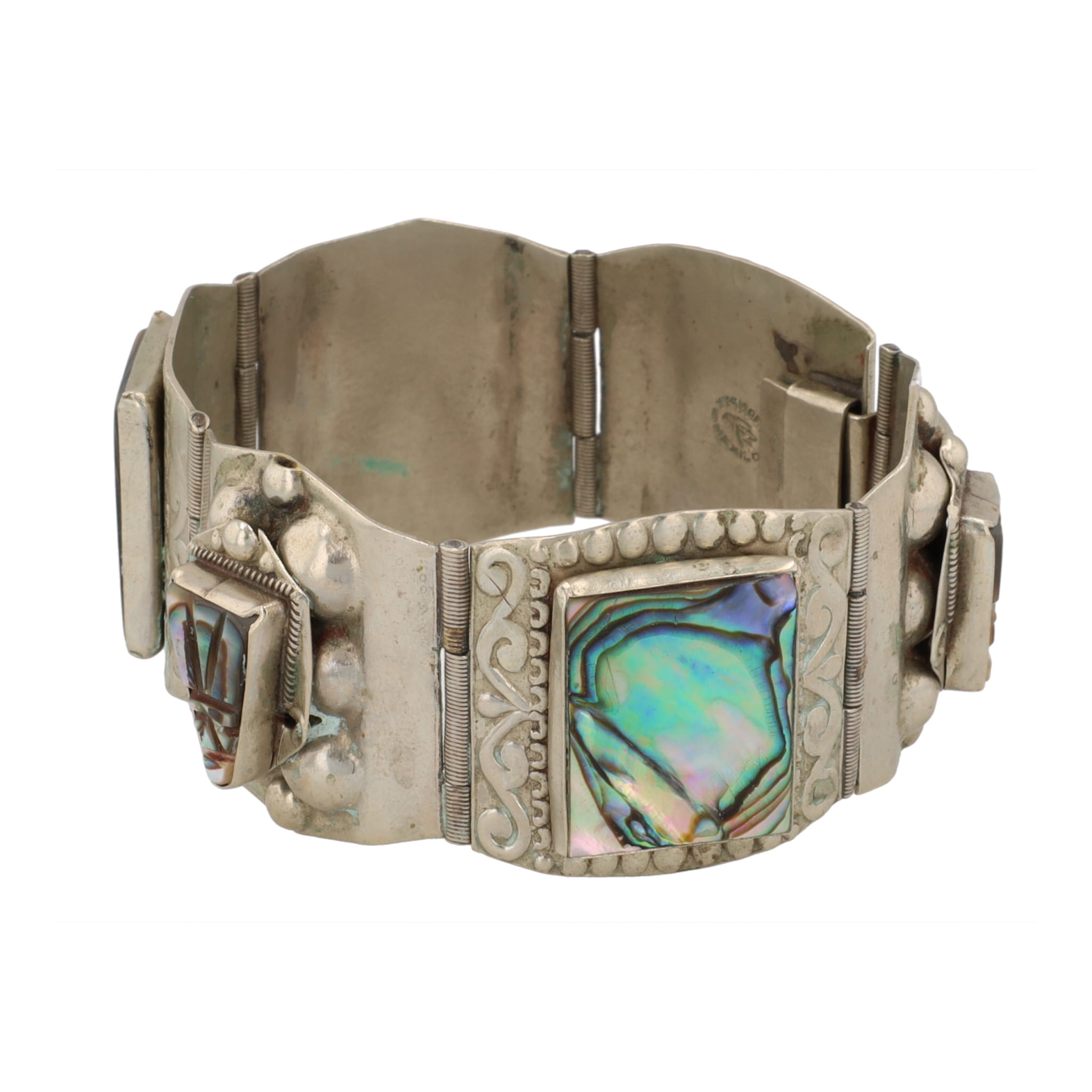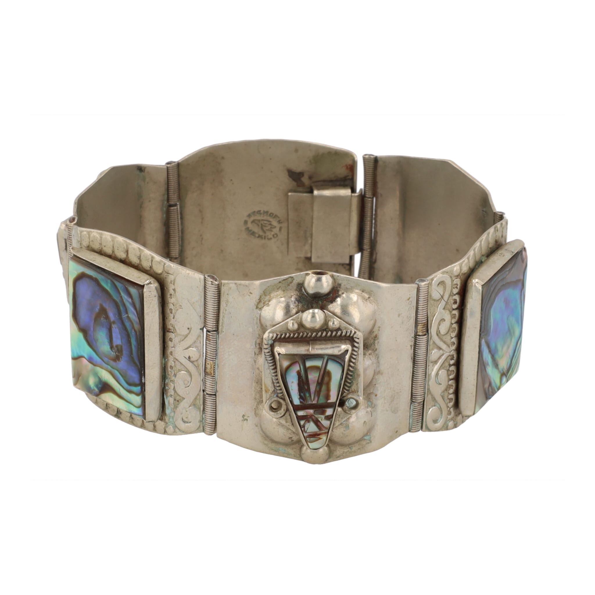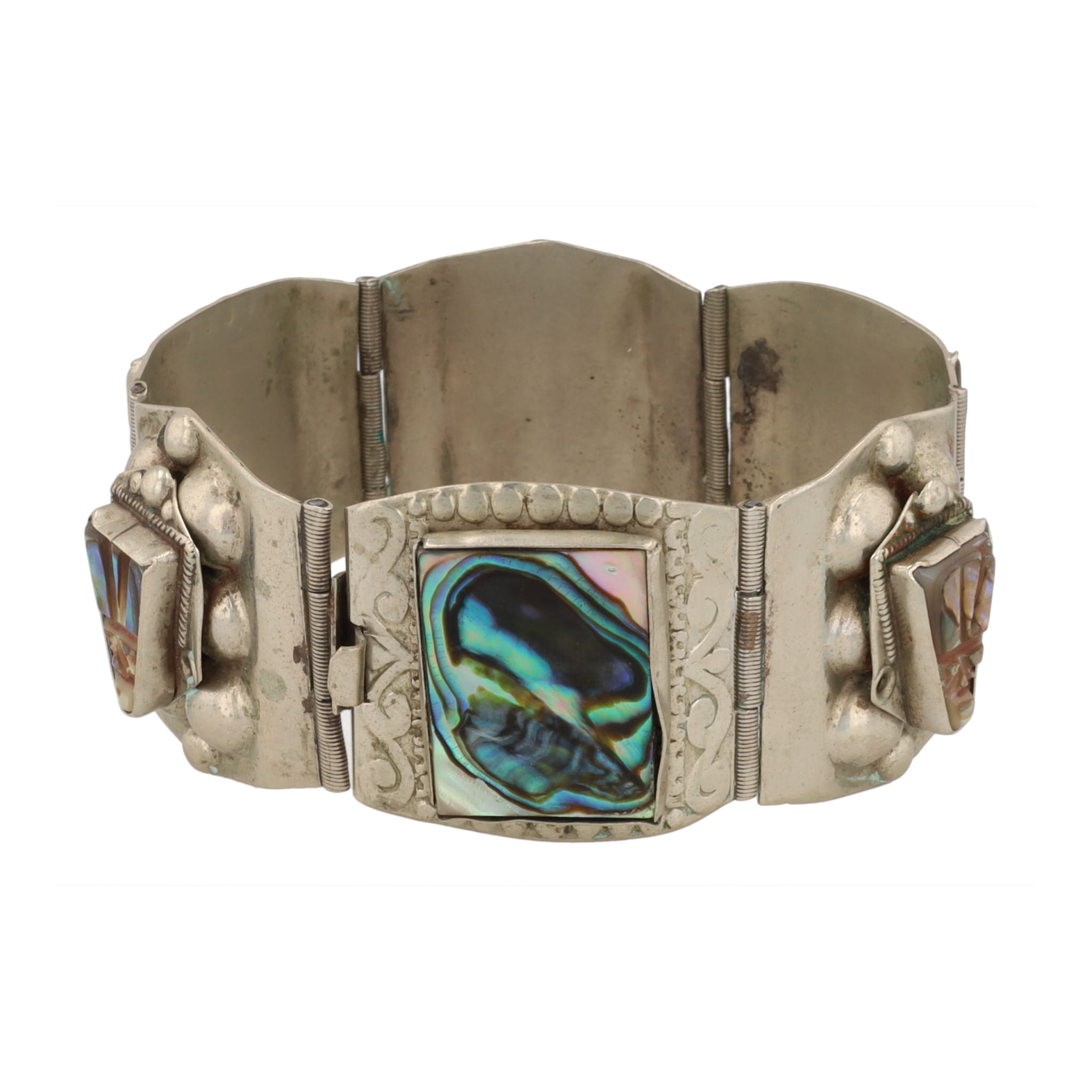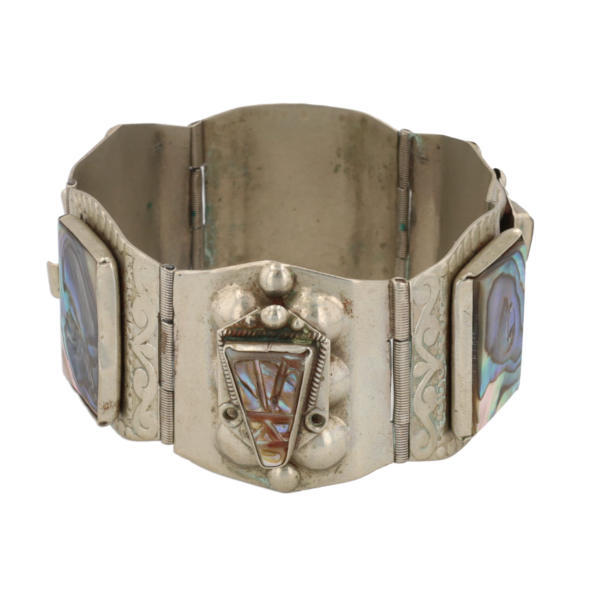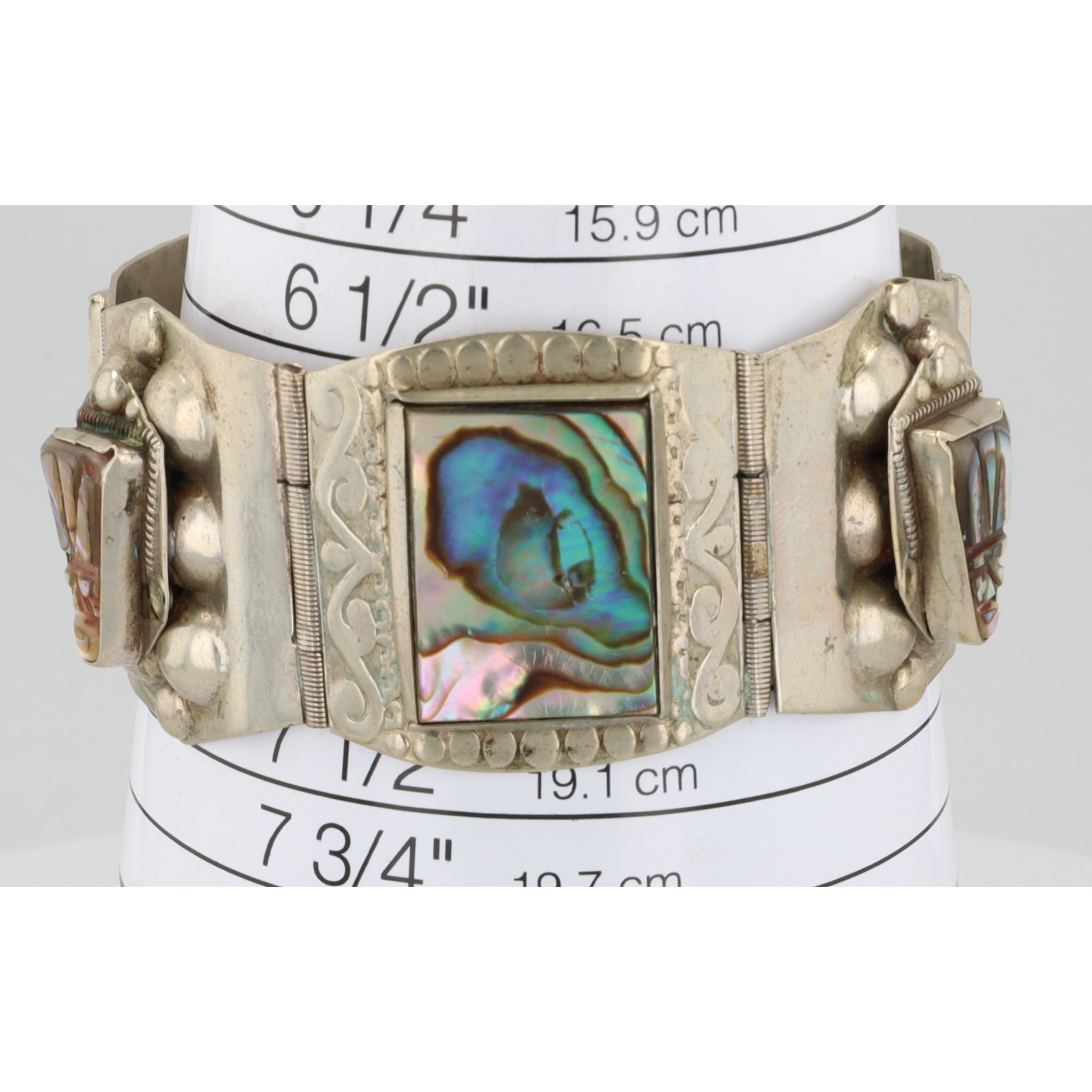 Mexico Carved Abalone Alpaca Silver Panel Bracelet 56.5g