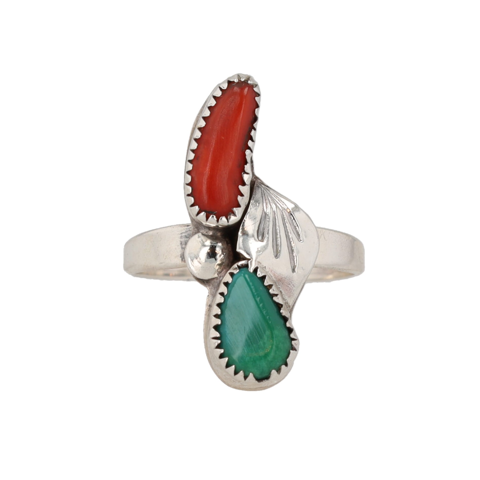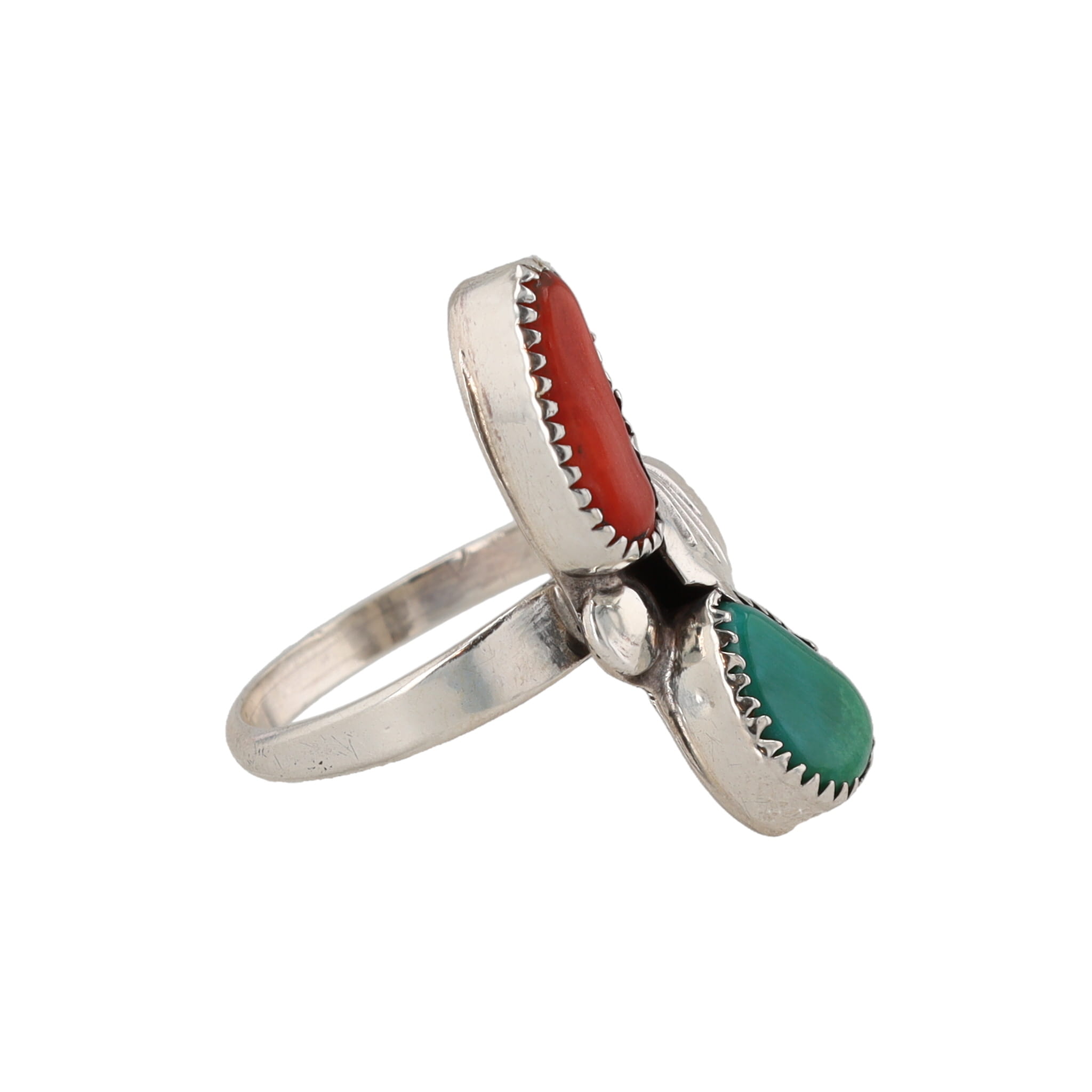 Navajo Green Turquoise Coral Sterling Shadow Box Ring Sz. 5.25, 2.5g