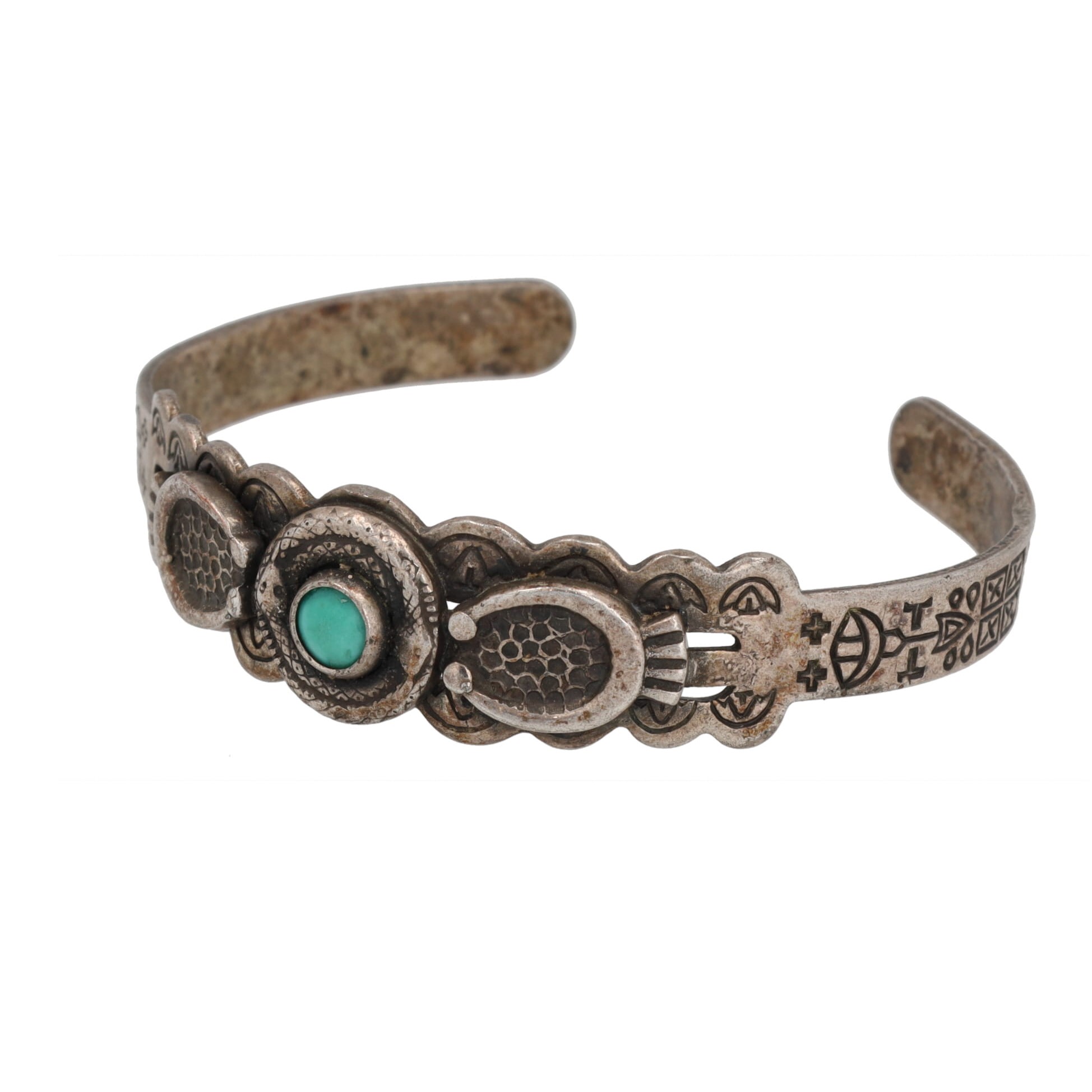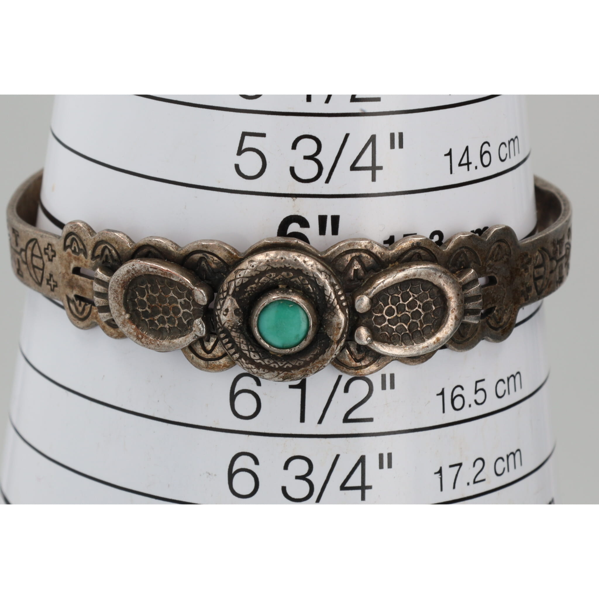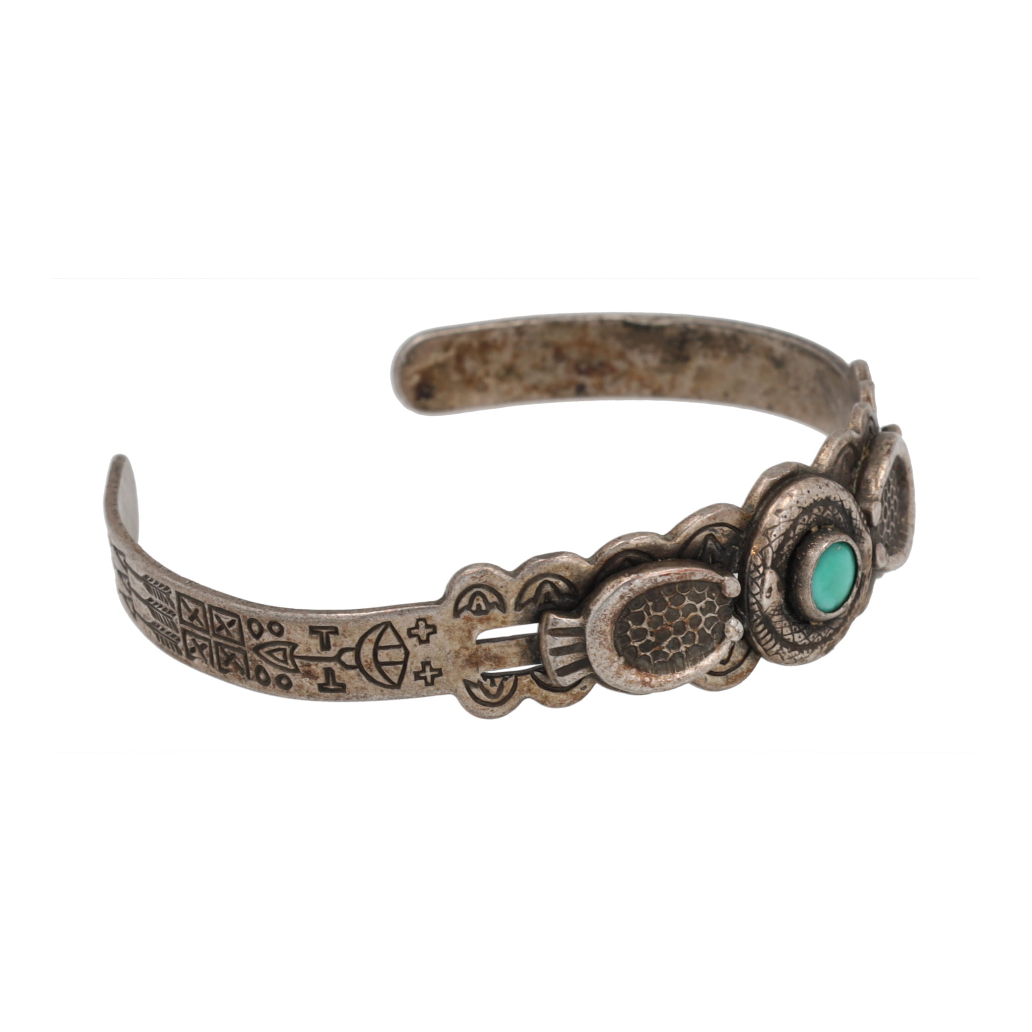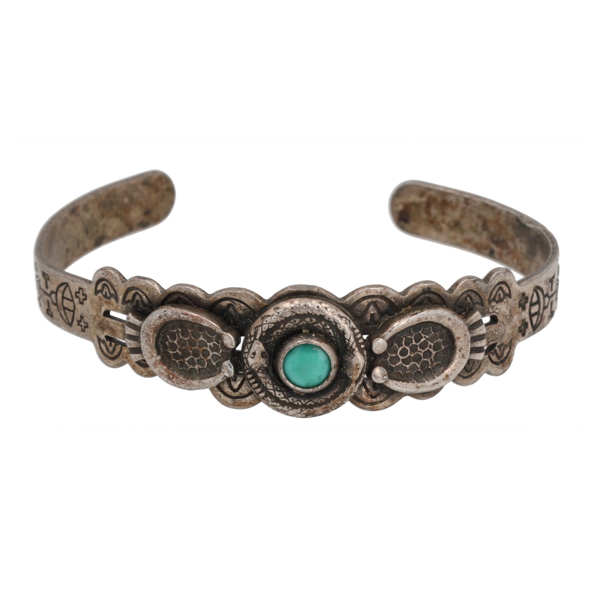 Fred Harvey Era Turquoise Sterling Coiled Snakes Overlay Stamped Cuff Bracelet 15g