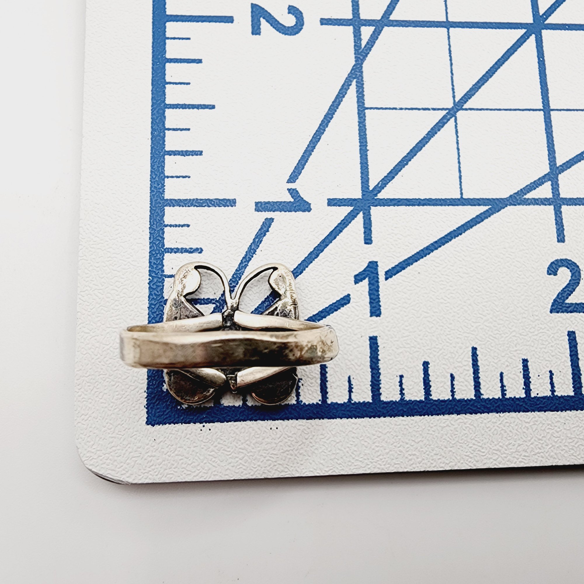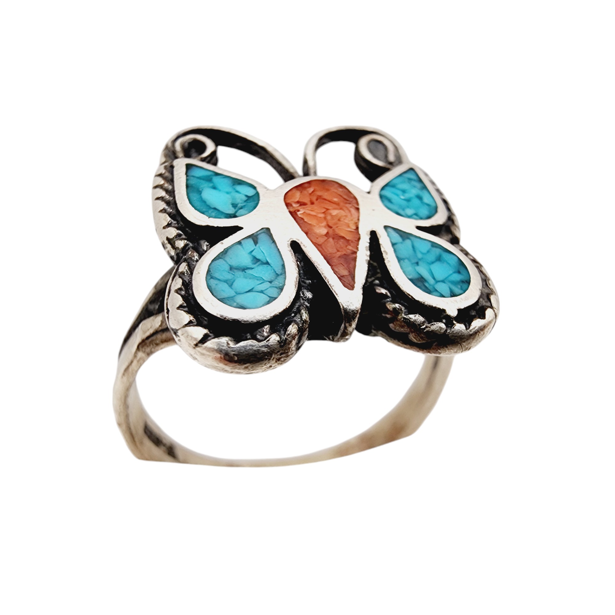 Vintage Signed Tb? Navajo Turquoise Coral Chip Inlay Butterfly Ring Sz 9 4.8g