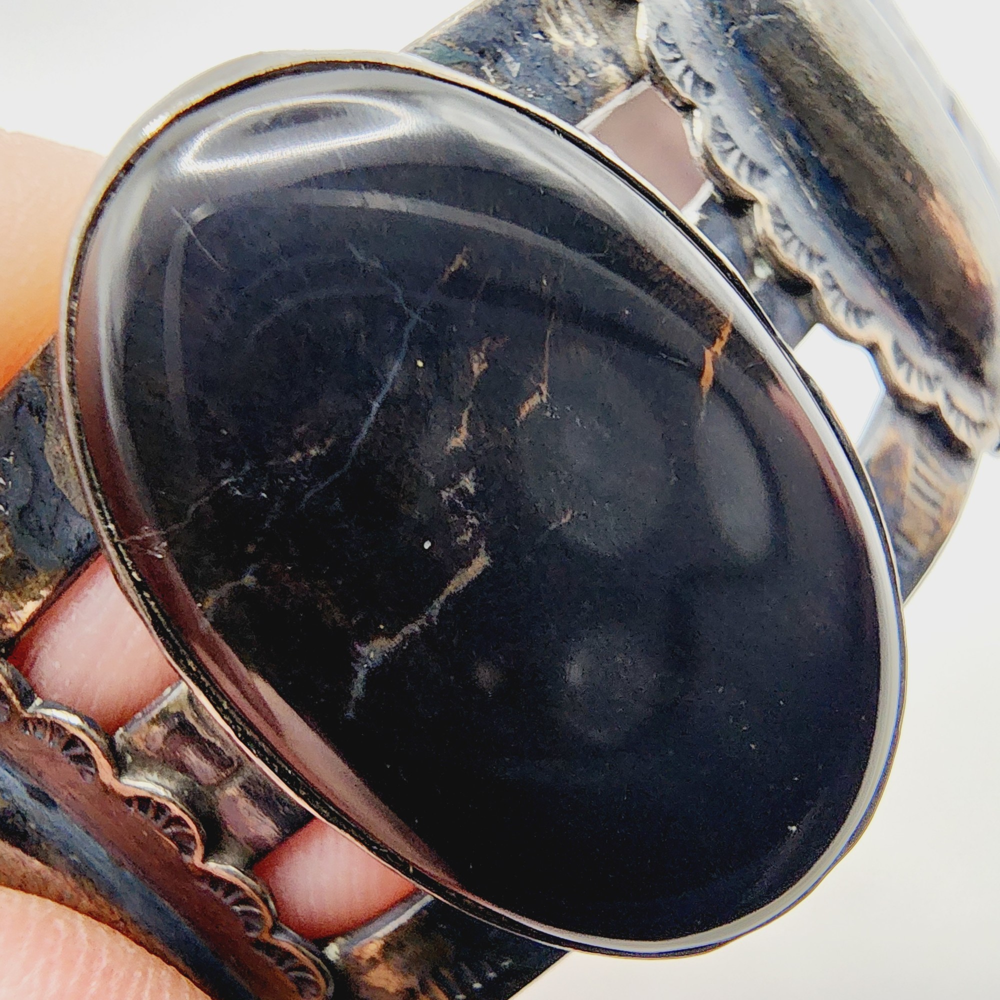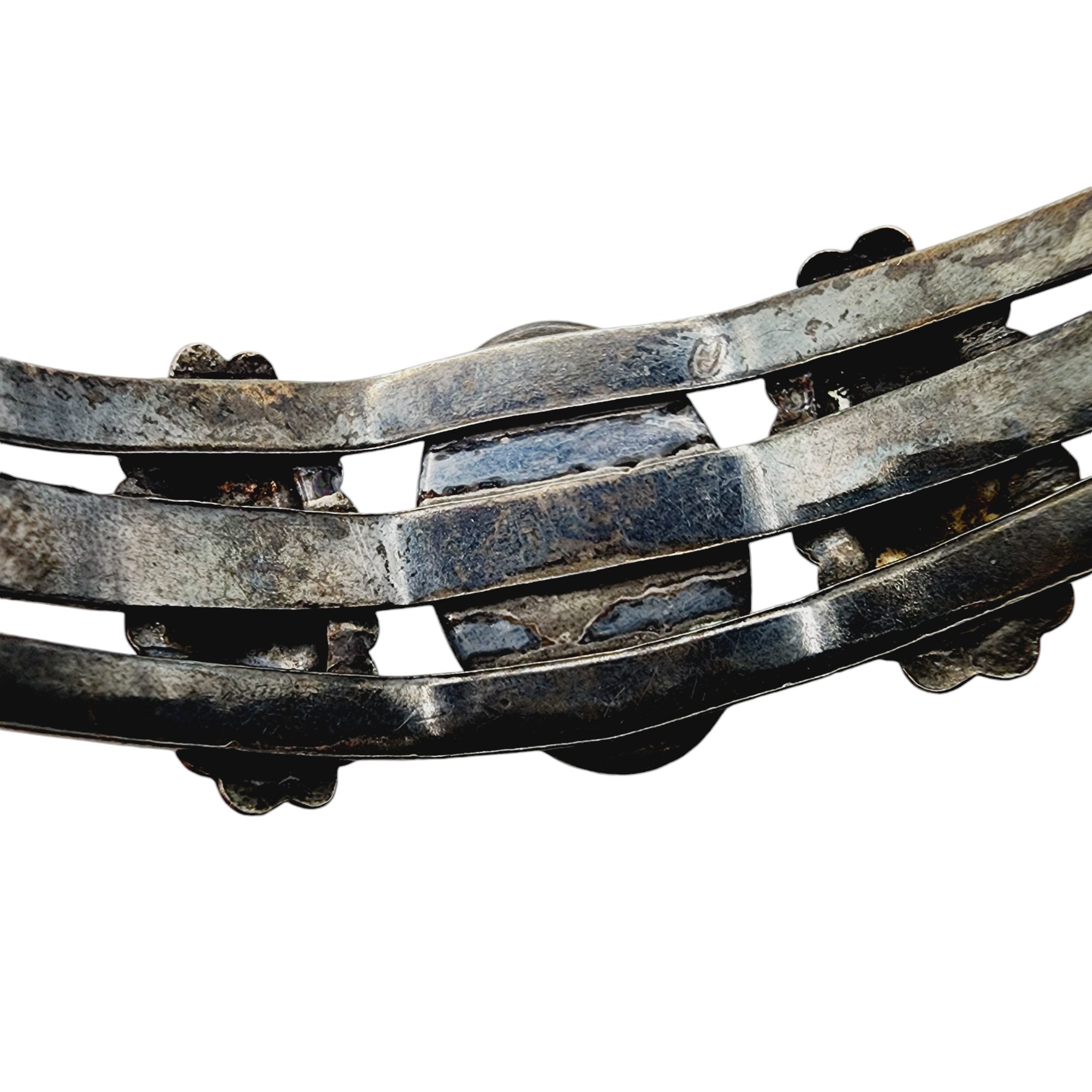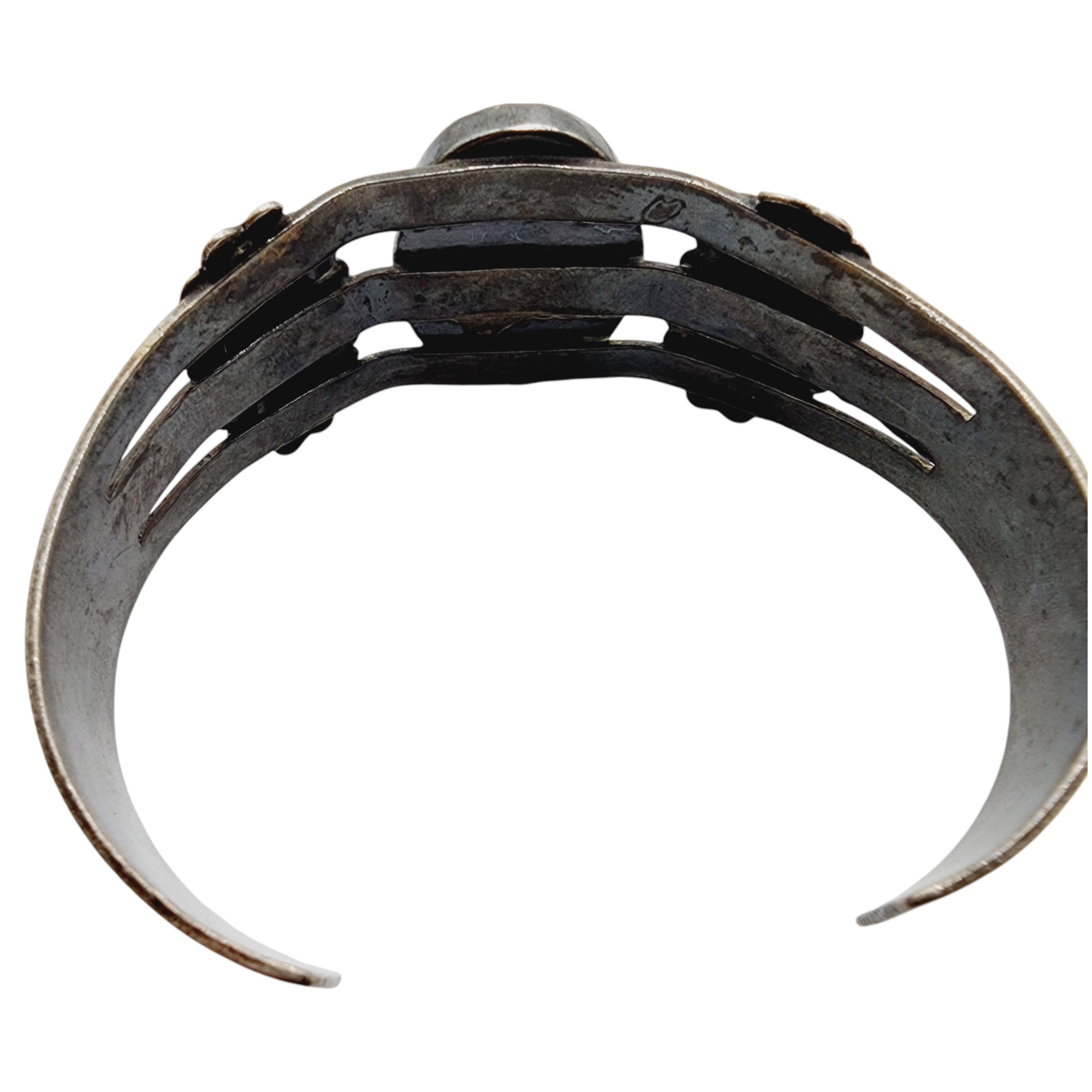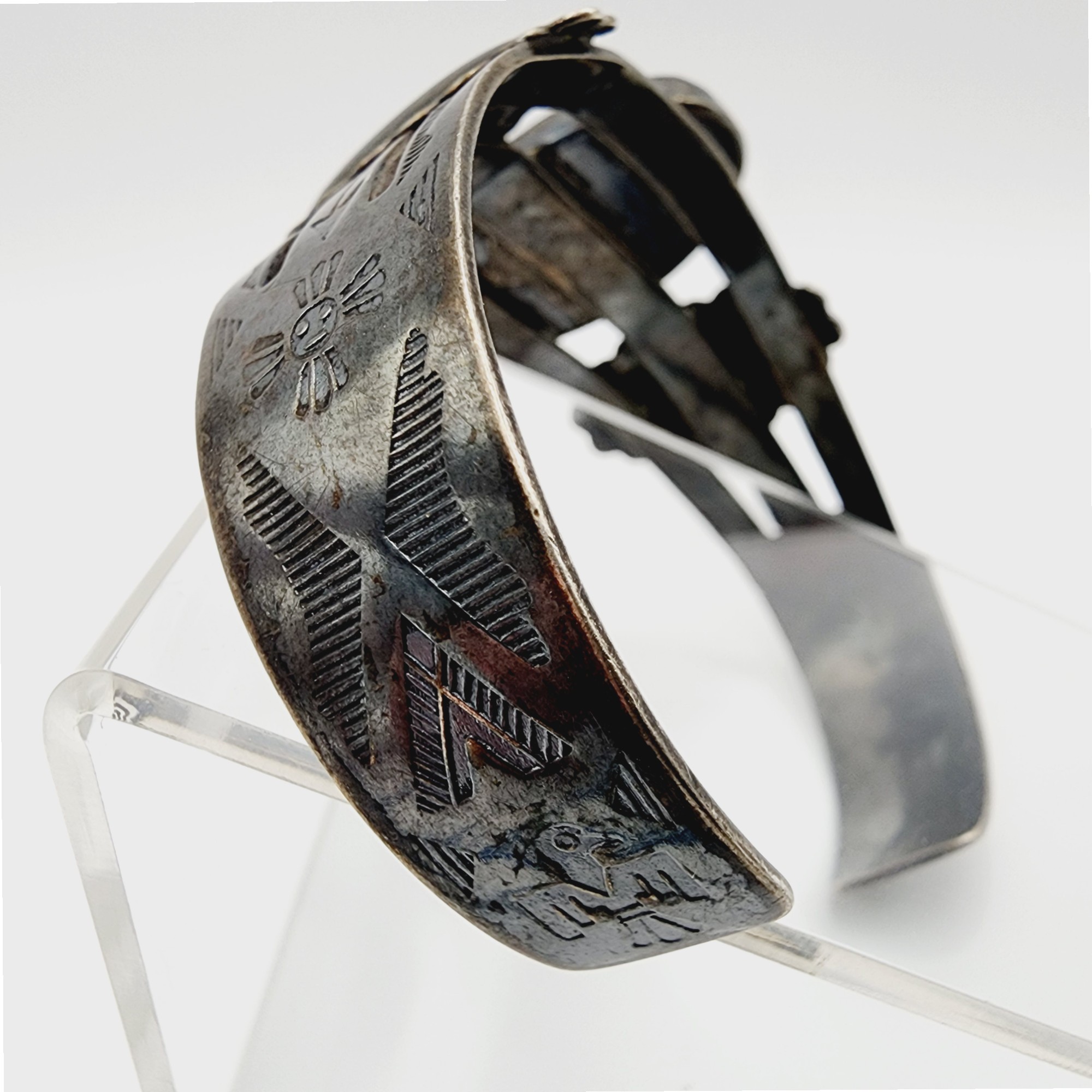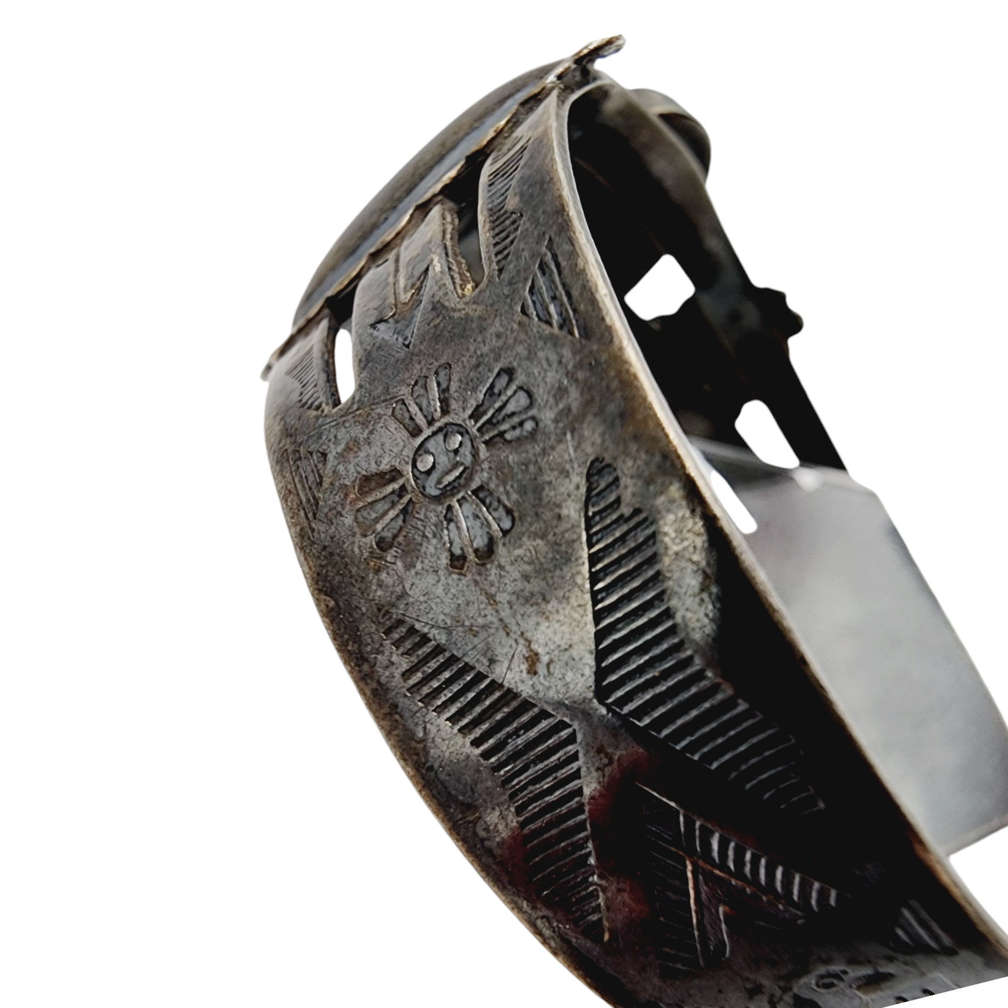 Vintage Fred Harvey Era Navajo Sterling Petrified Wood? Concho Stamped Cuff Bracelet 26.6g – stamped designs include thunderbirds, zia symbols, etc.