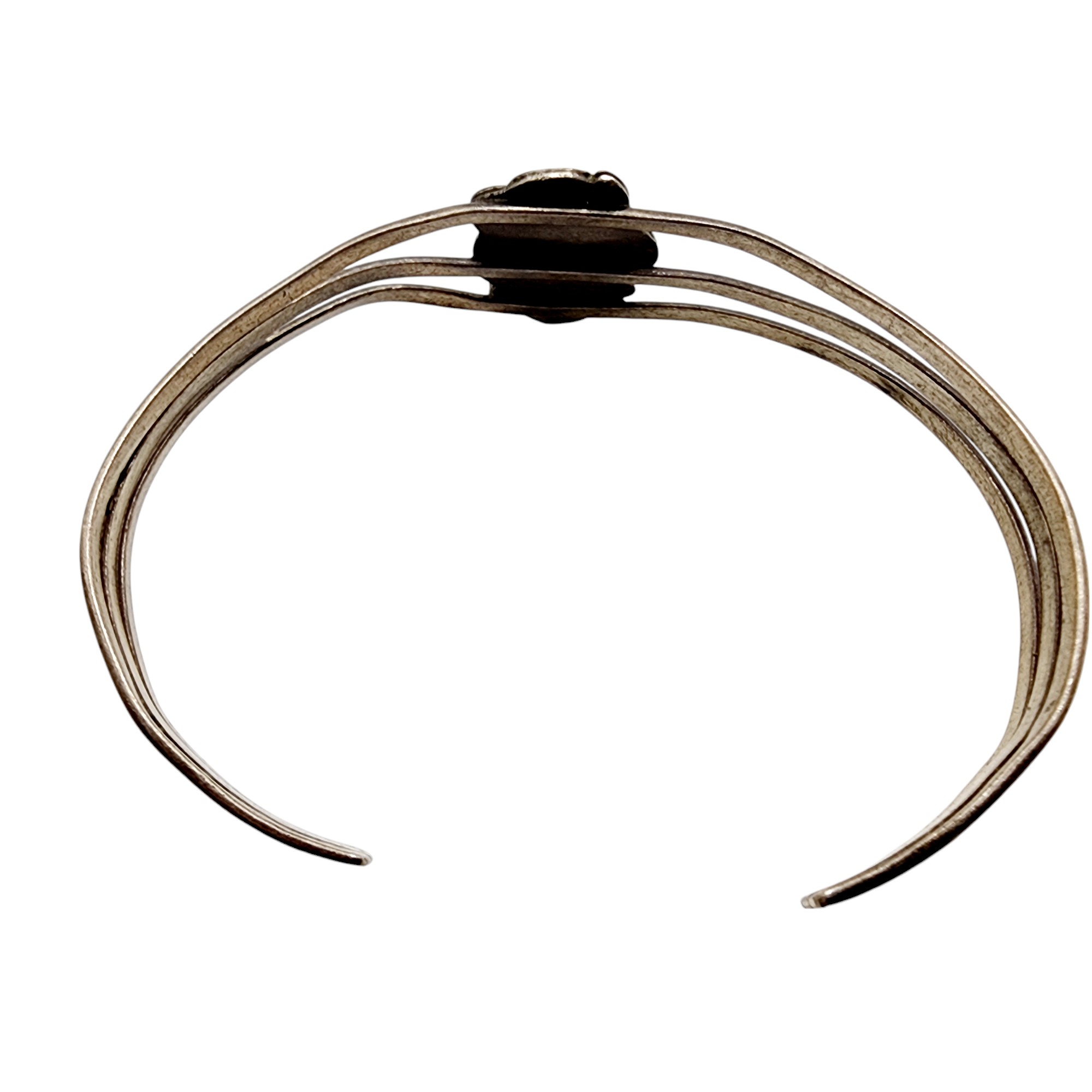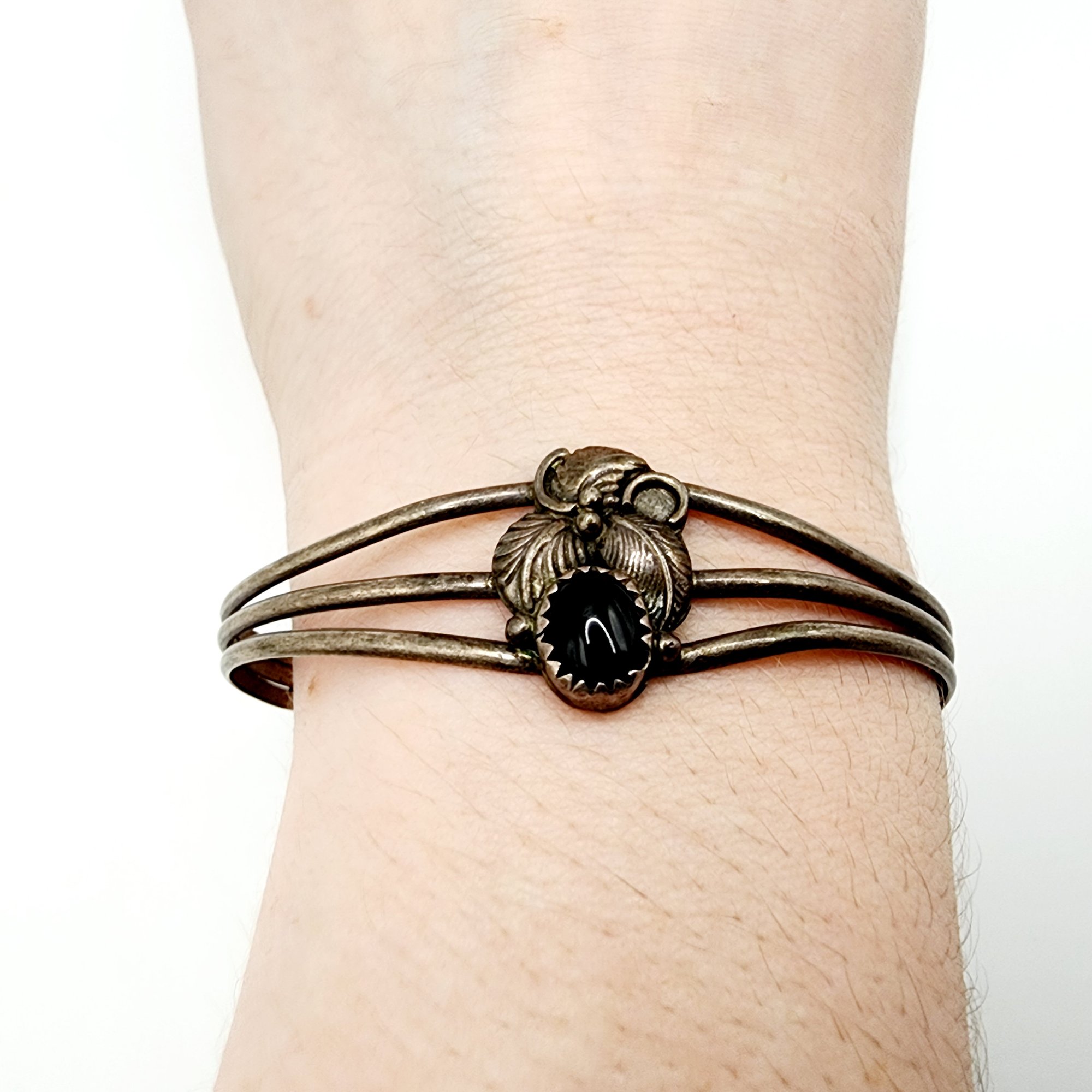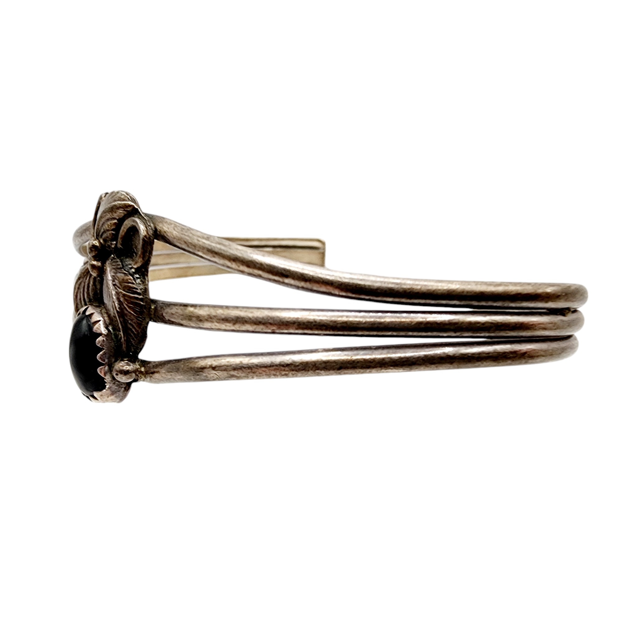 Navajo Sterling Onyx Feather Cuff Bracelet 9.2g as is slight asymmetrical cuff