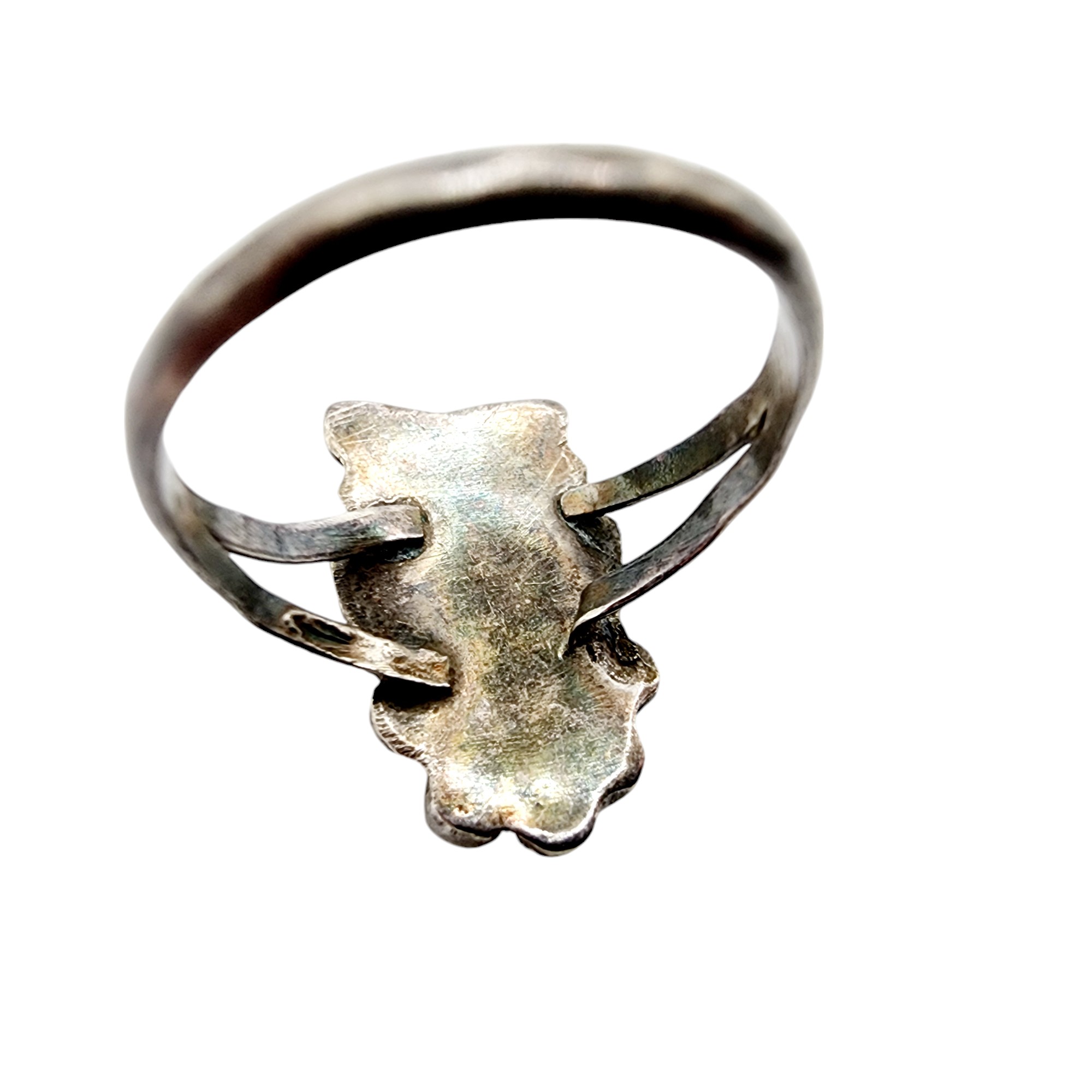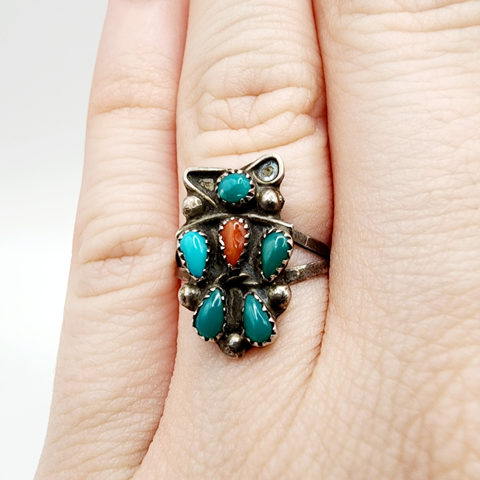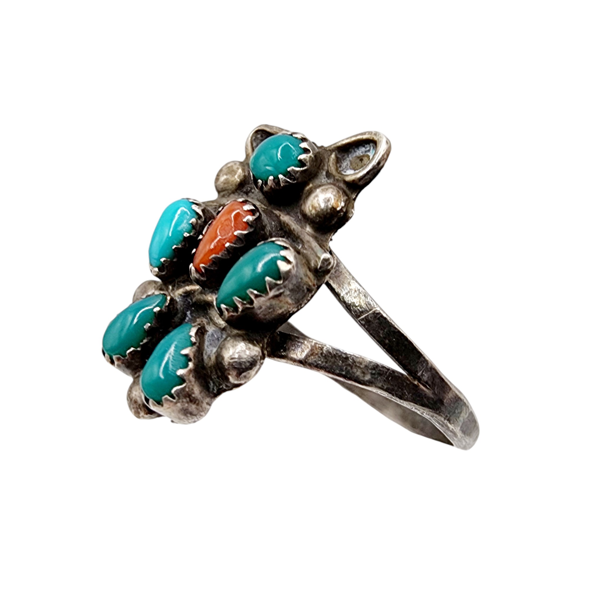 Vintage Navajo Sterling Thunderbird Turquoise Coral Petit Point Ring Sz 6 2.3g