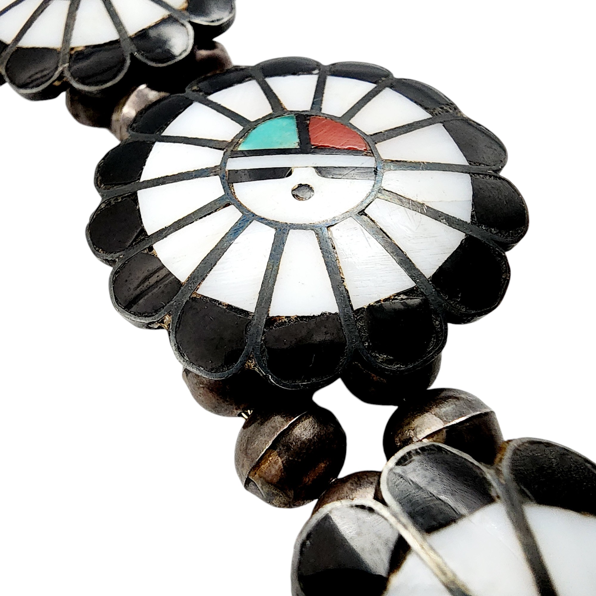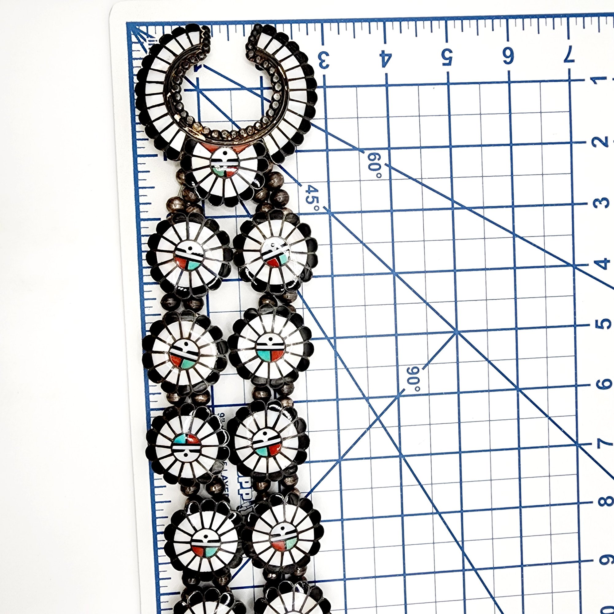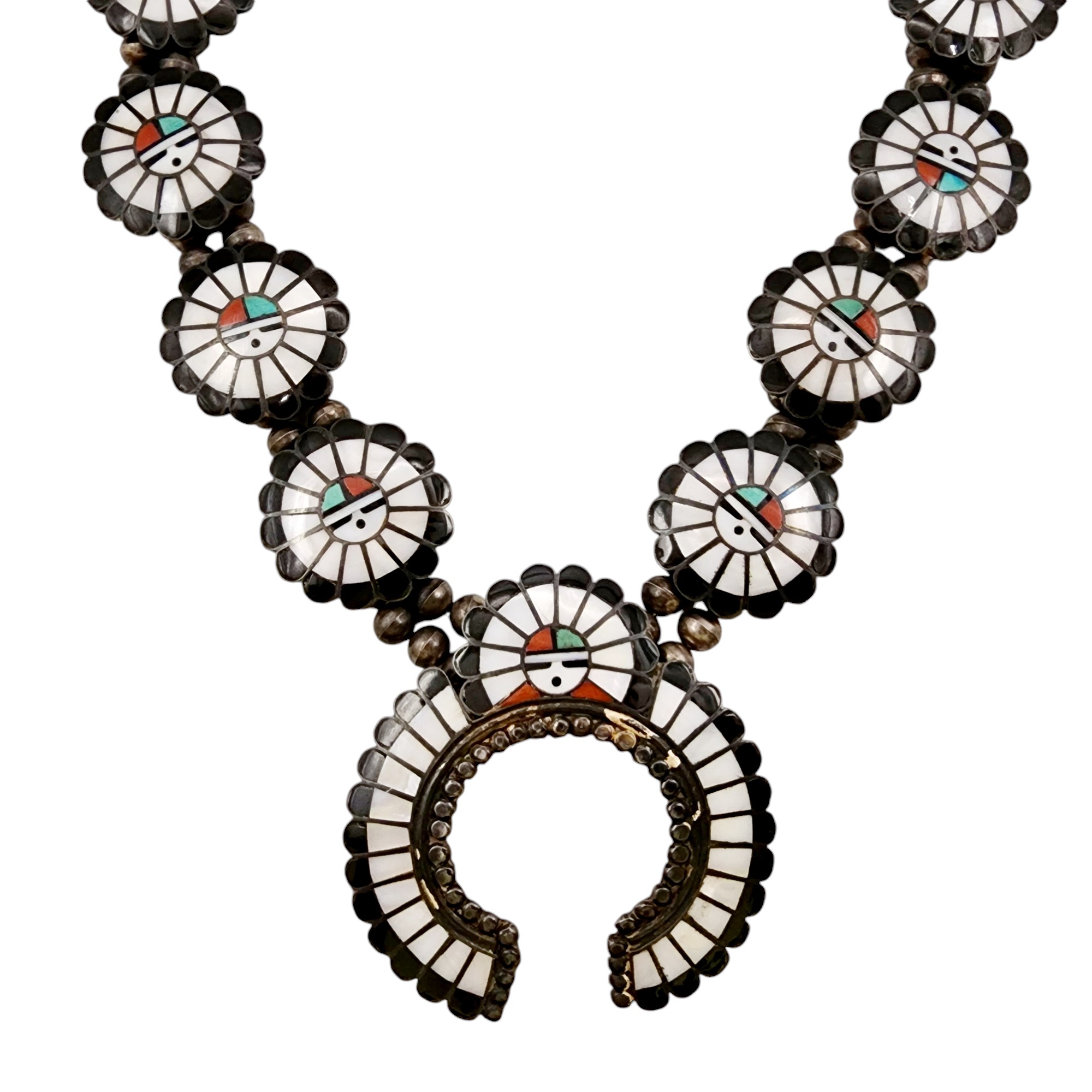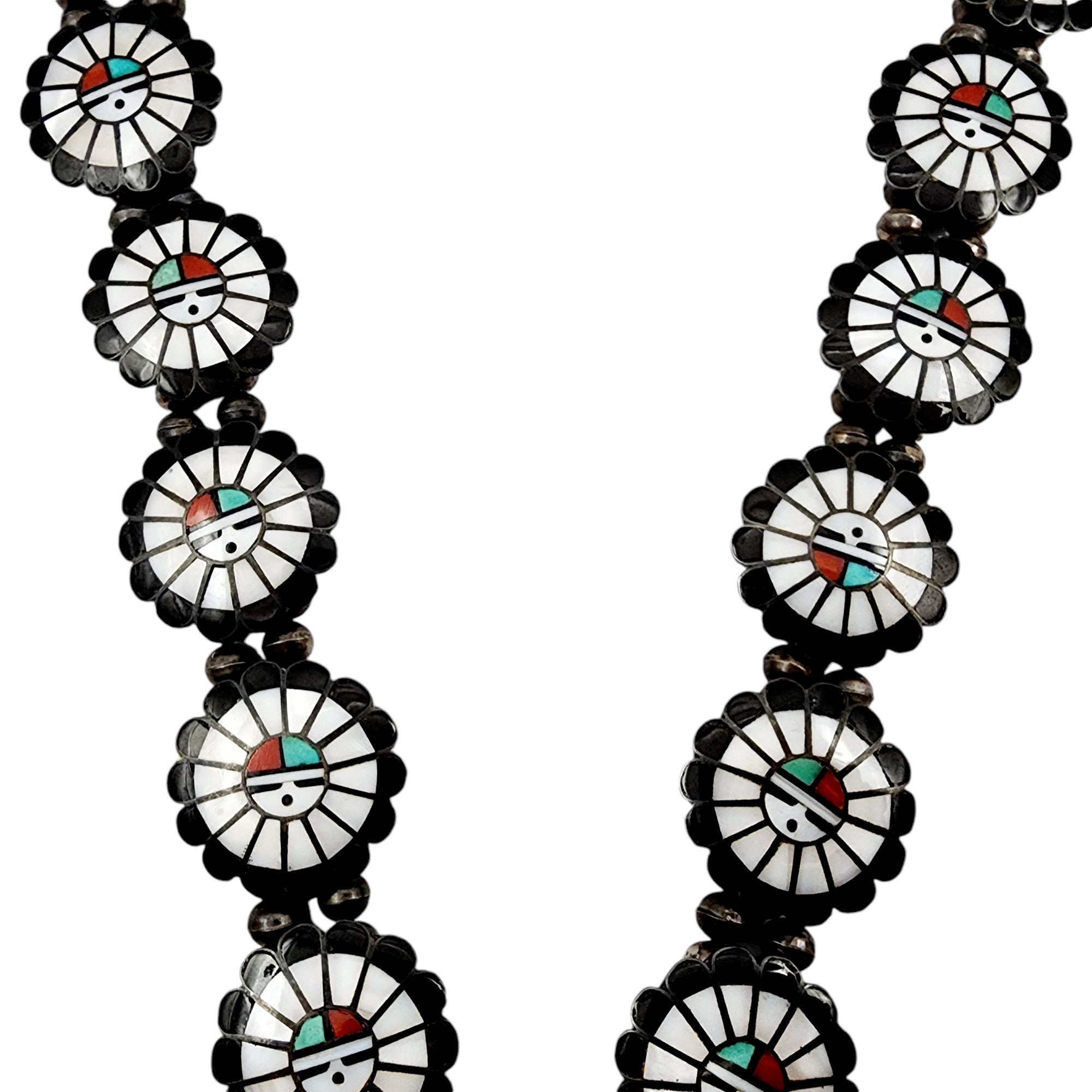 Vintage Zuni Sterling Multi Stone Sun Face Inlay Squash Blossom Necklace 223g
