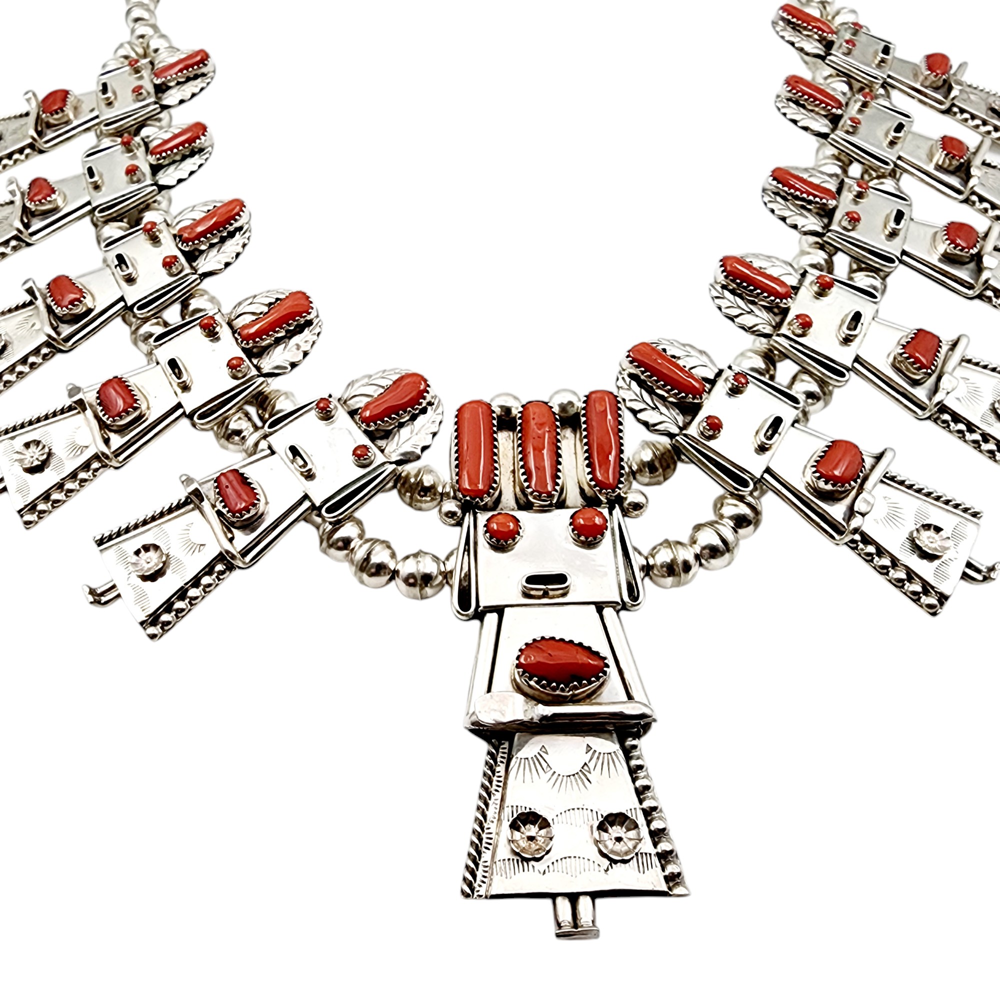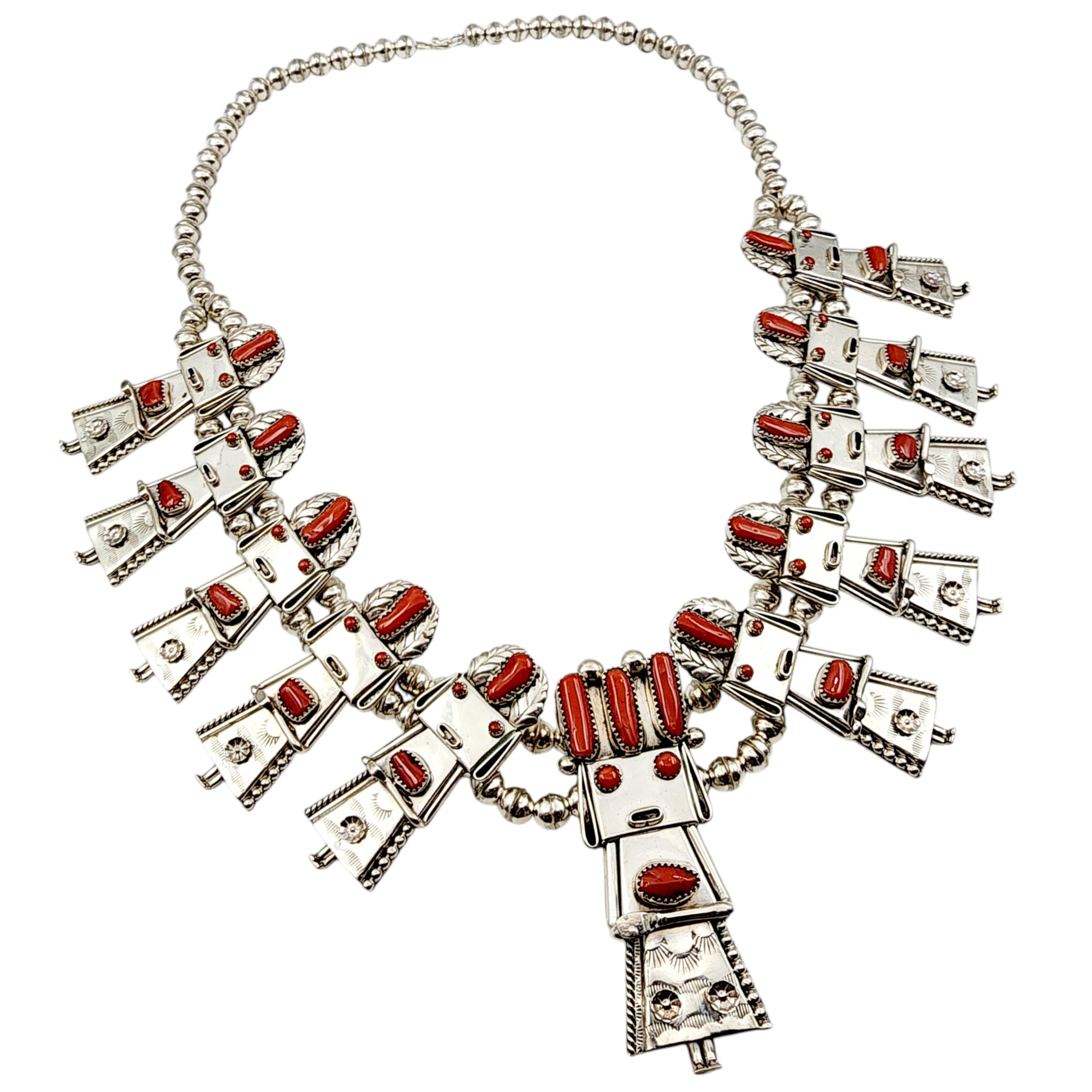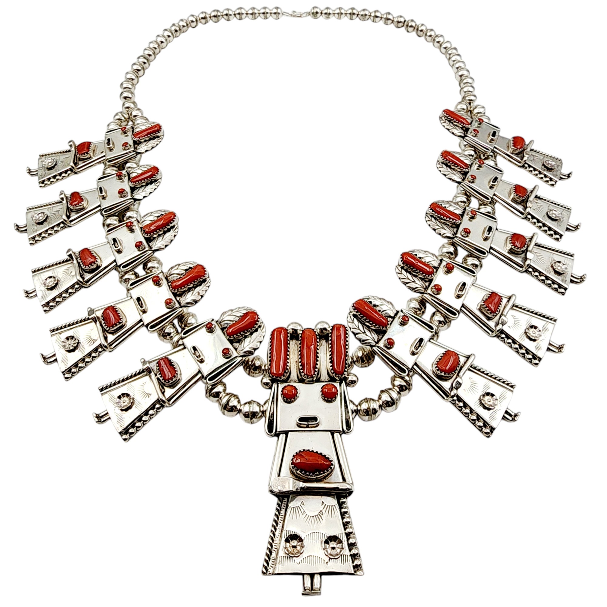 Incredible Frank Yazzie Navajo Sterling Coral Kachina Doll Necklace 173.1g