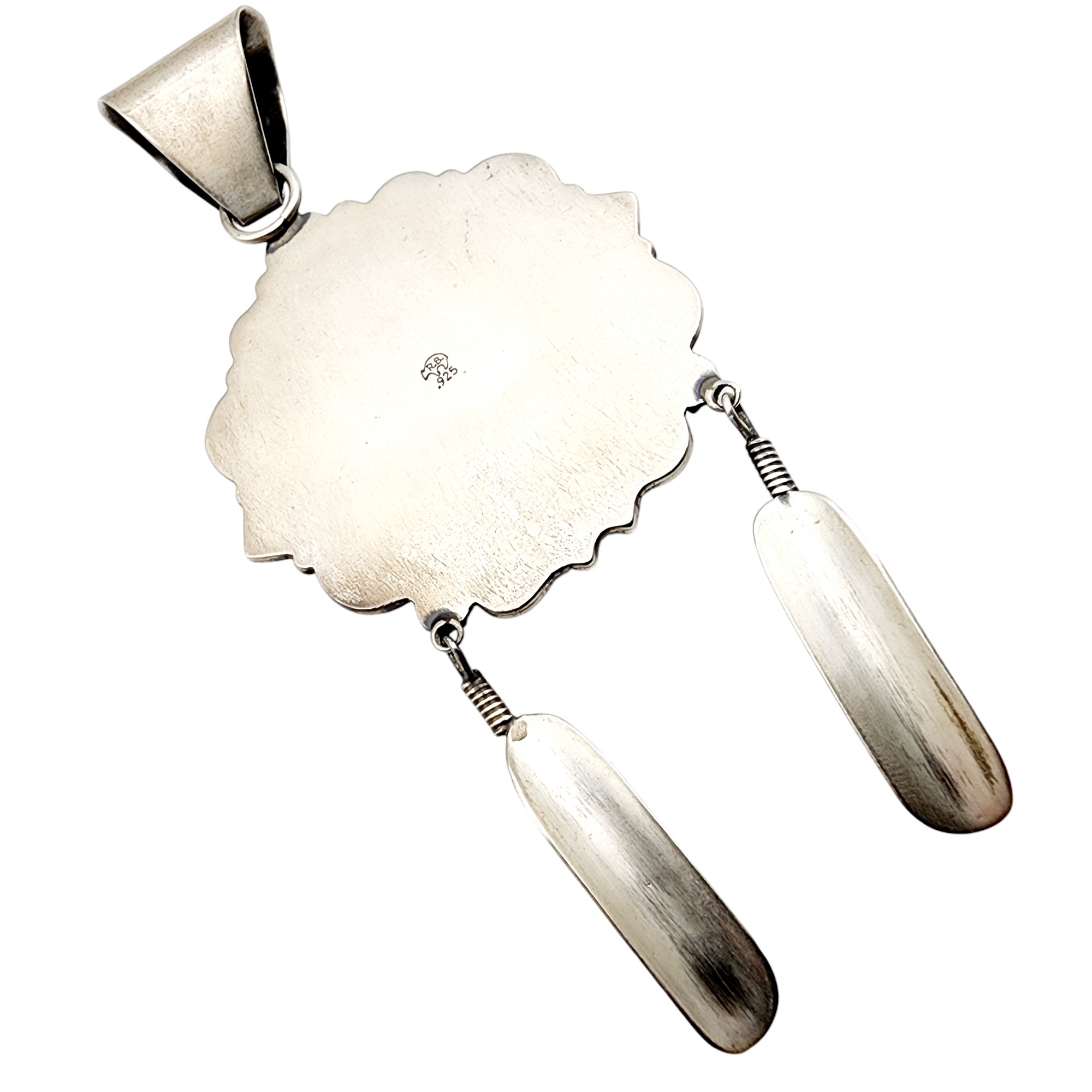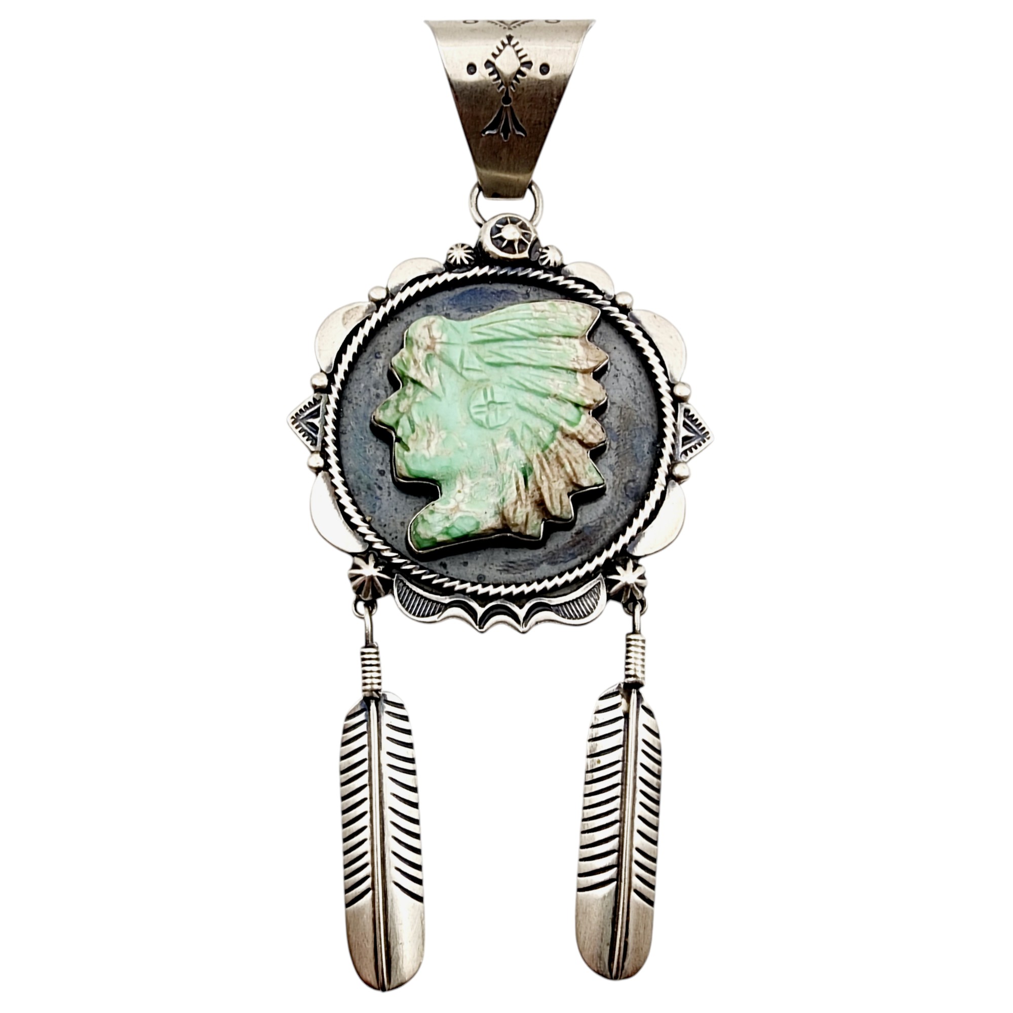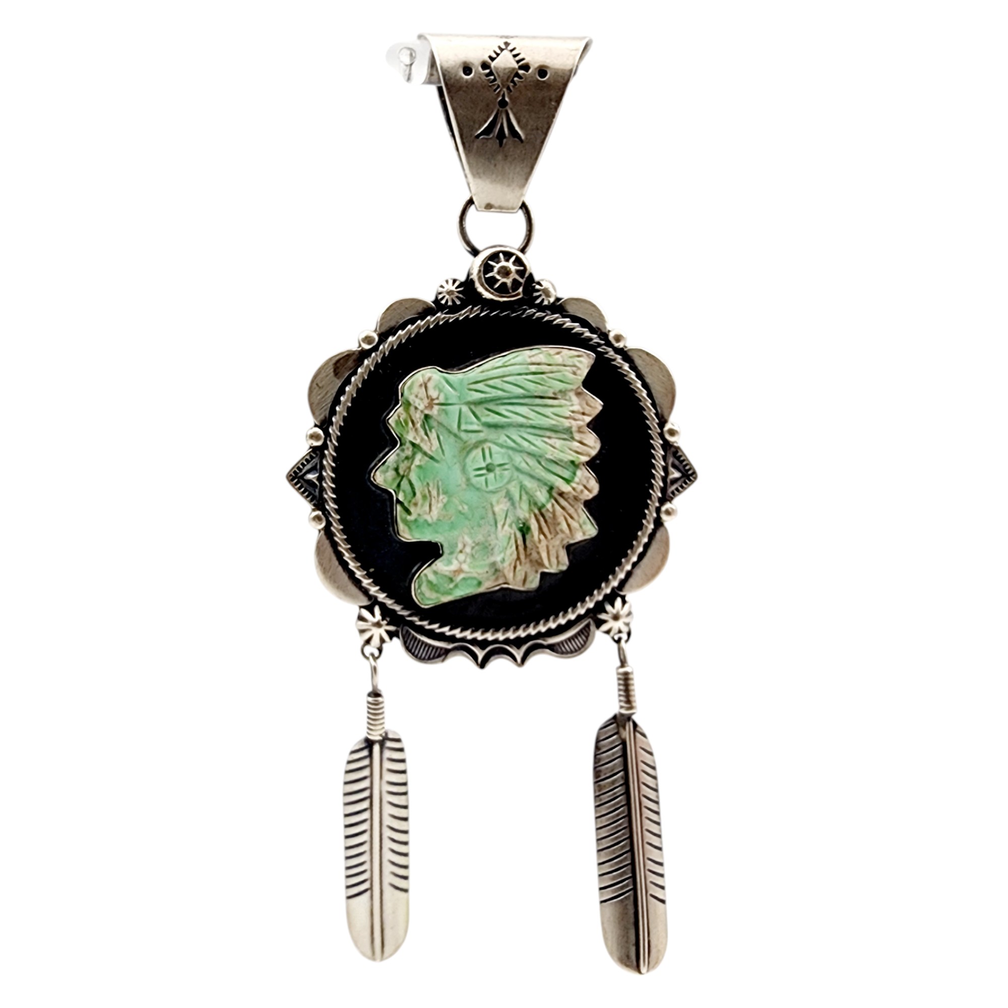 Amazing Running Bear Carved Turquoise Indian Chief Sterling Feather Dangle Pendant 33.3g *Previous owner cleaned/polished this item*
