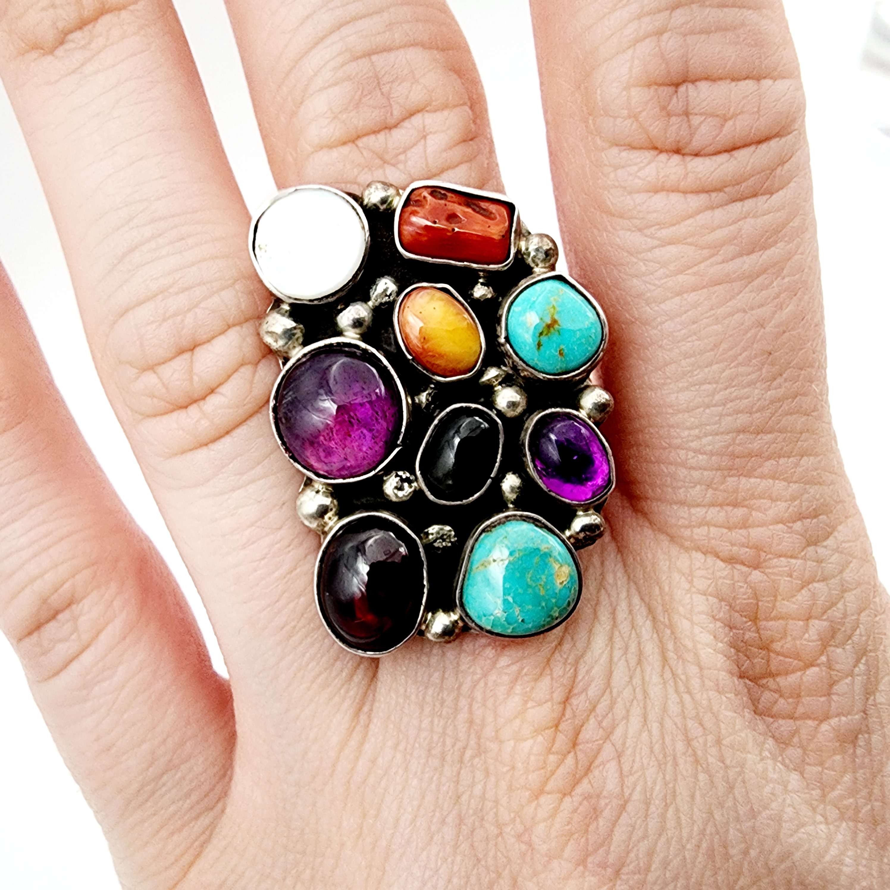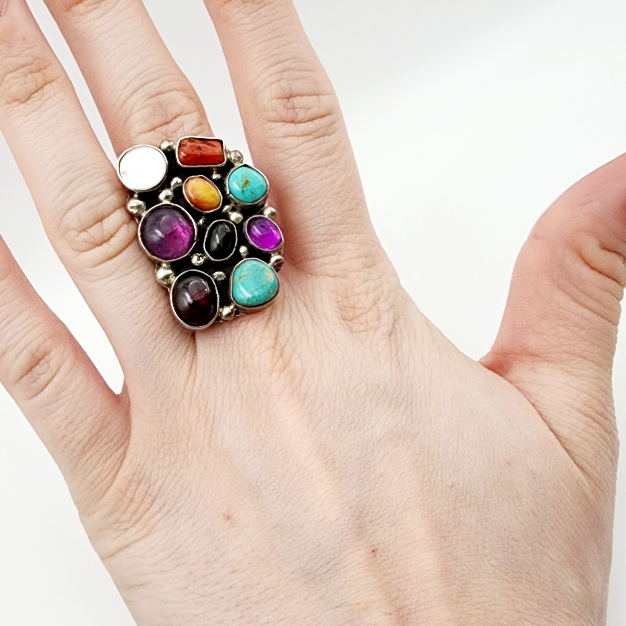 WOW Lee Bennett Navajo Multistone Sterling Ring Sz Adjustable 15.4g stones appear to be coral turquoise amethyst onyx spiny oyster MOP ruby etc