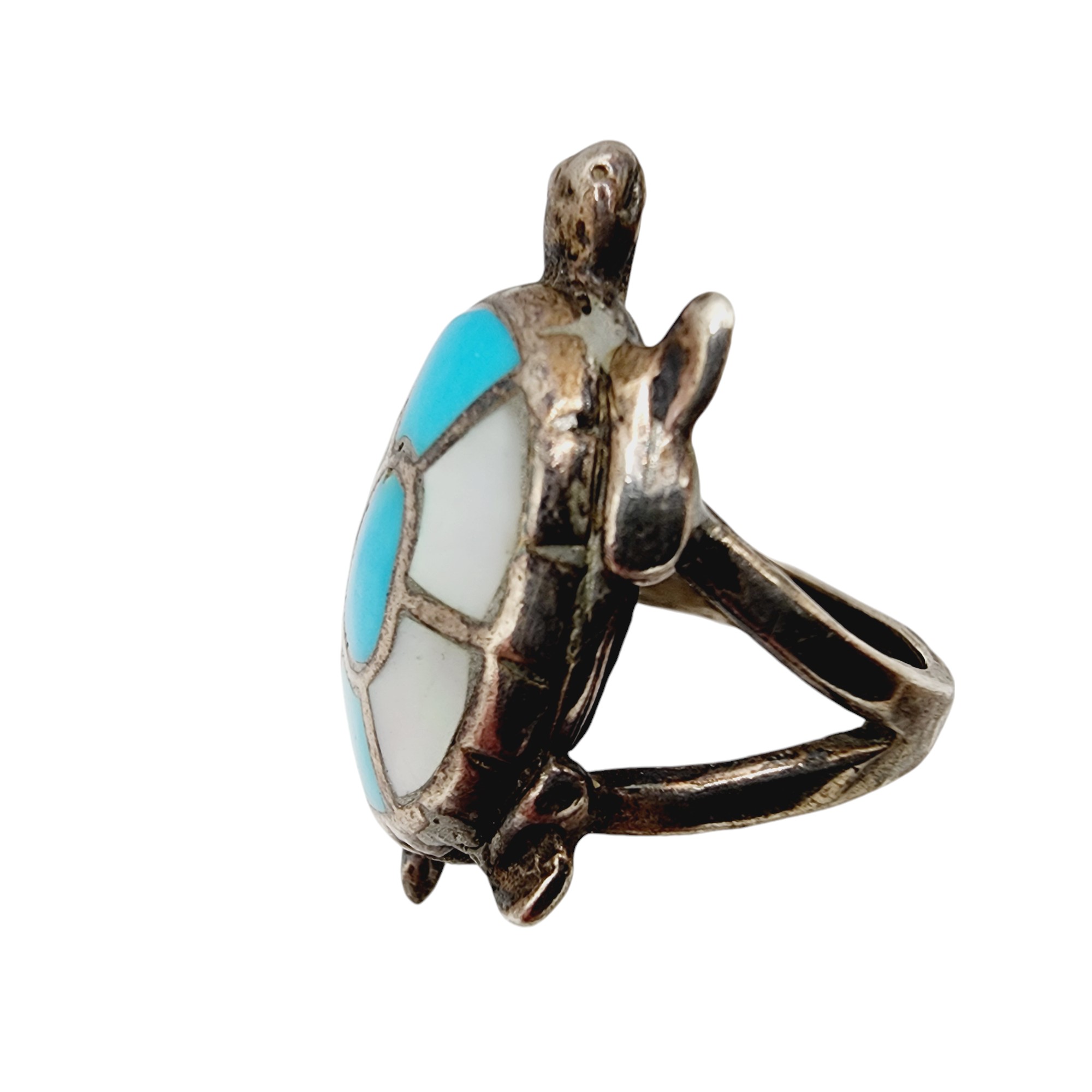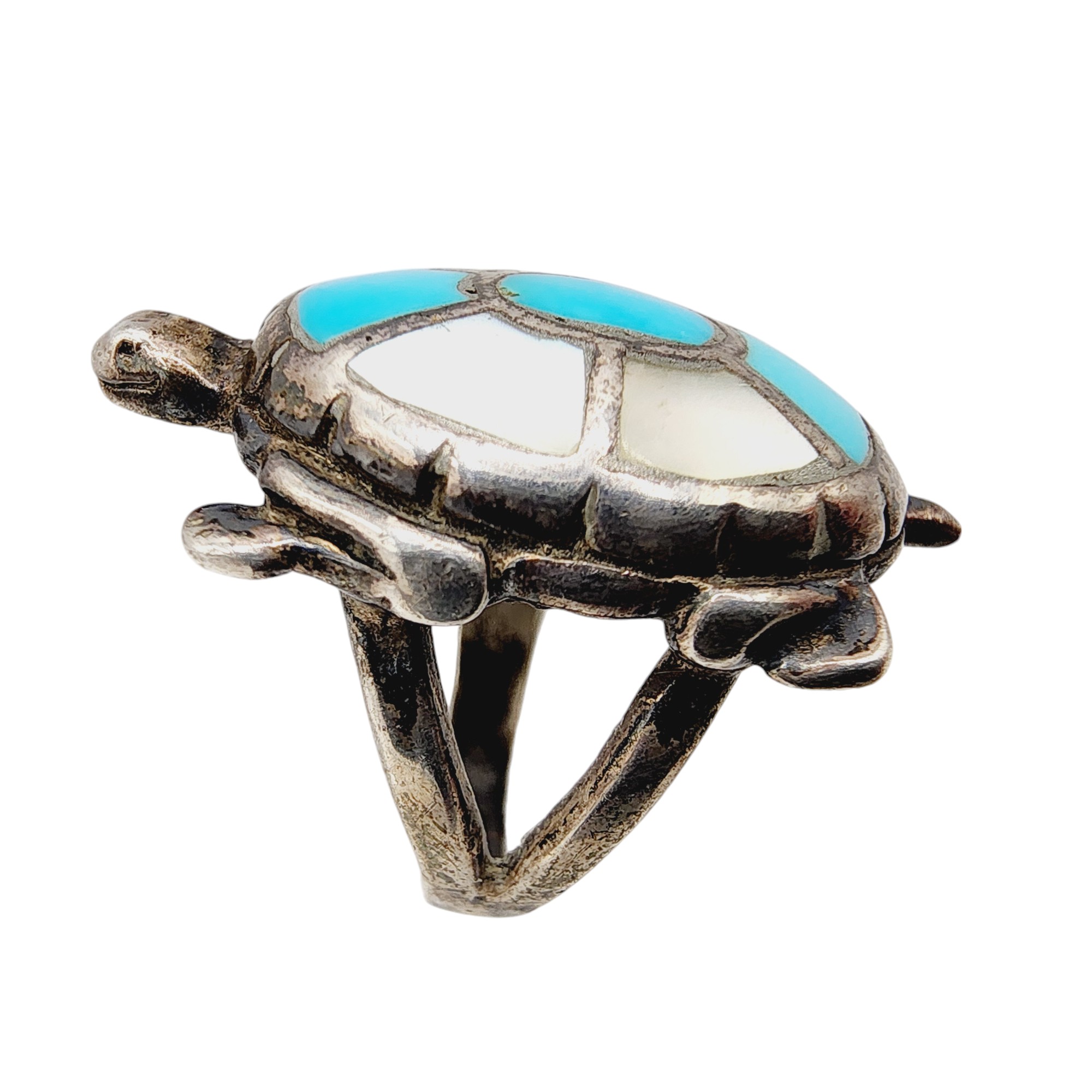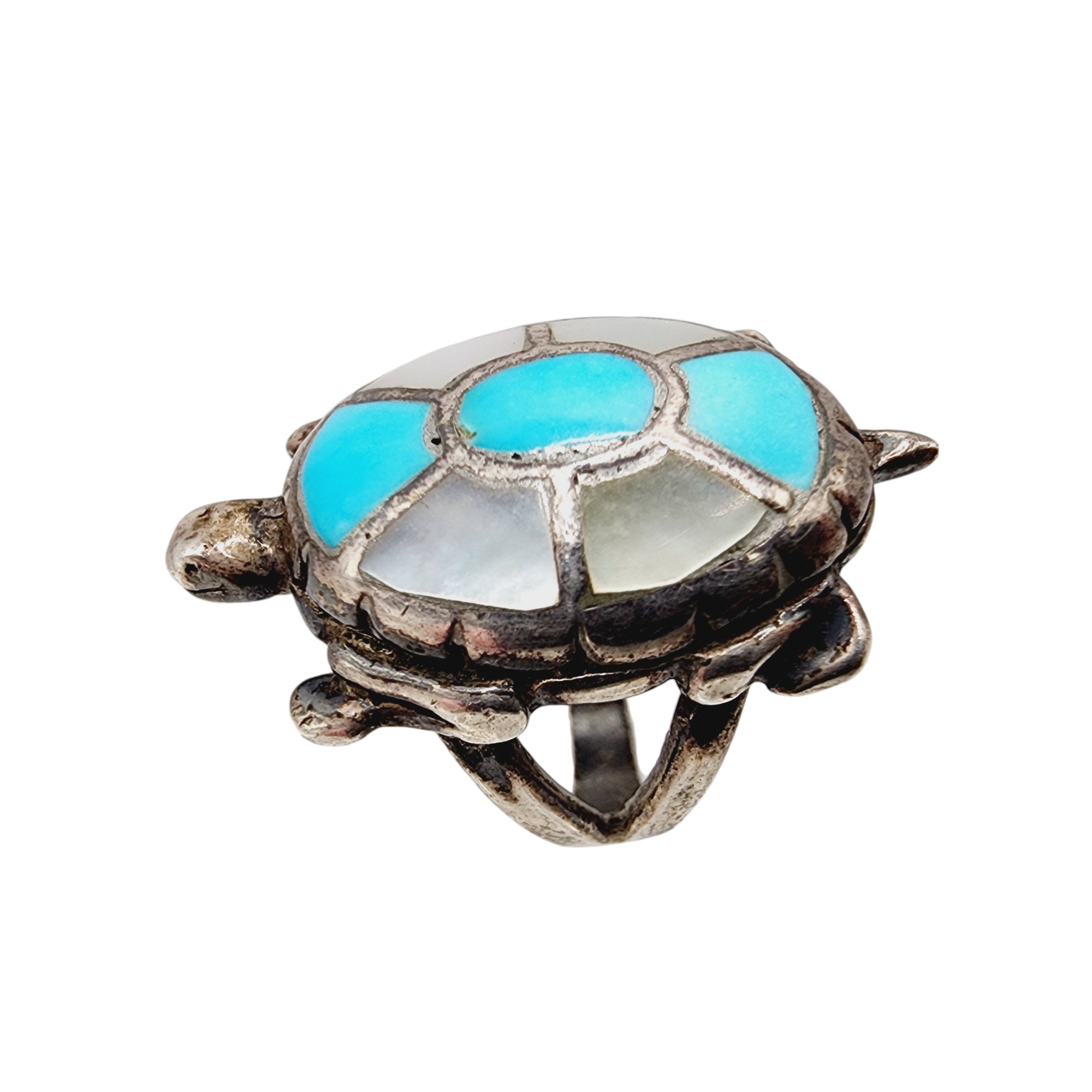 Zuni Sterling Turquoise Mother of Pearl Turtle Ring Sz 4.5 6.4g