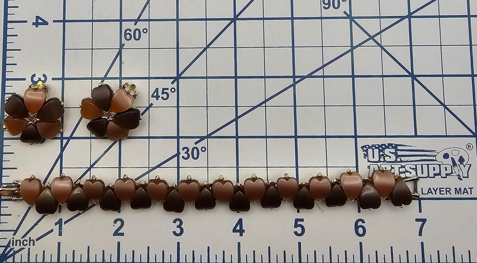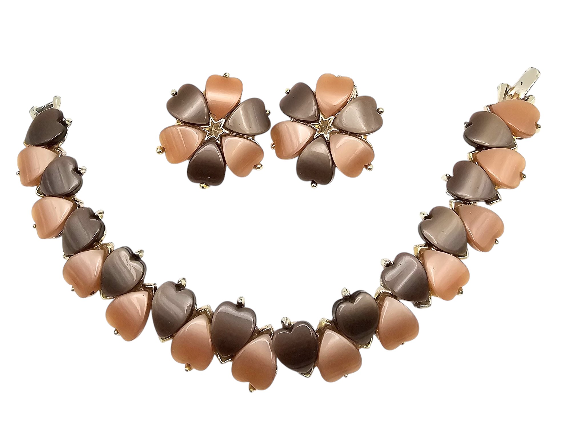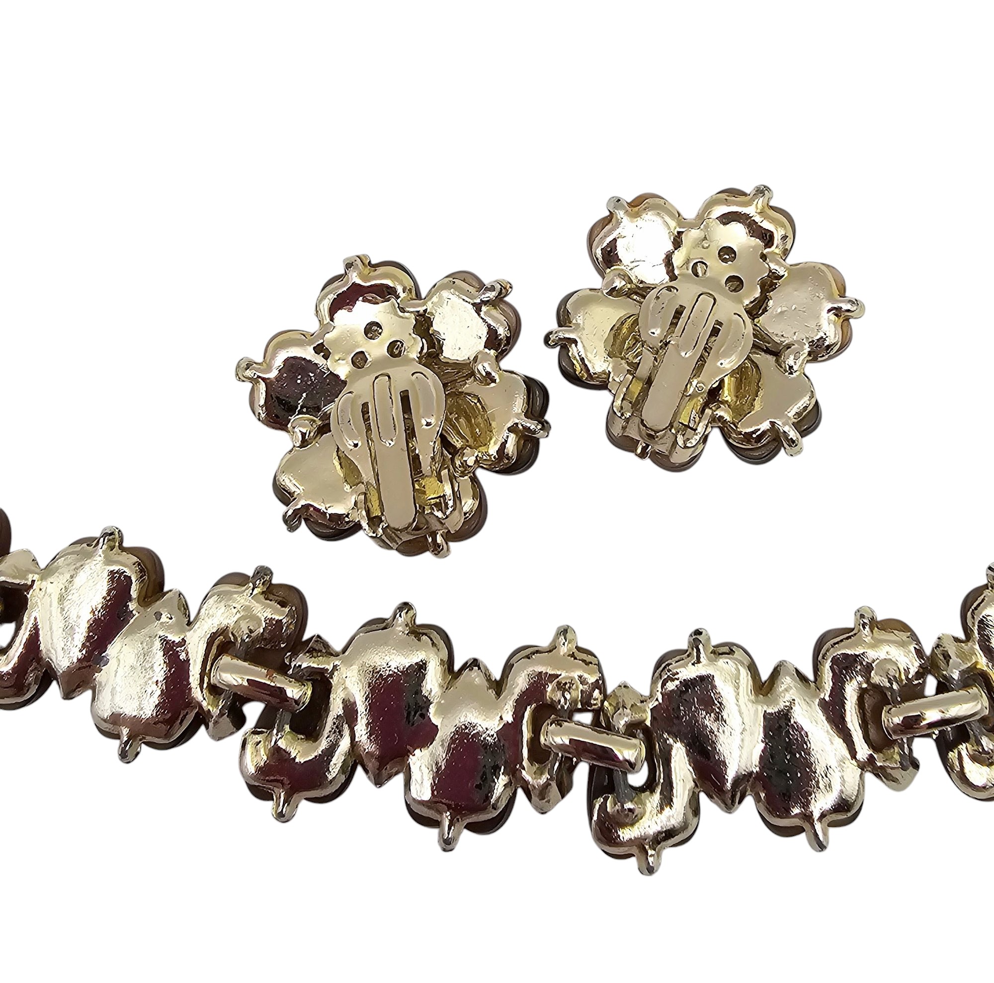 Vintage Chocolate Tope Thermoset Gold Tone Floral Bracelet Earrings Set
