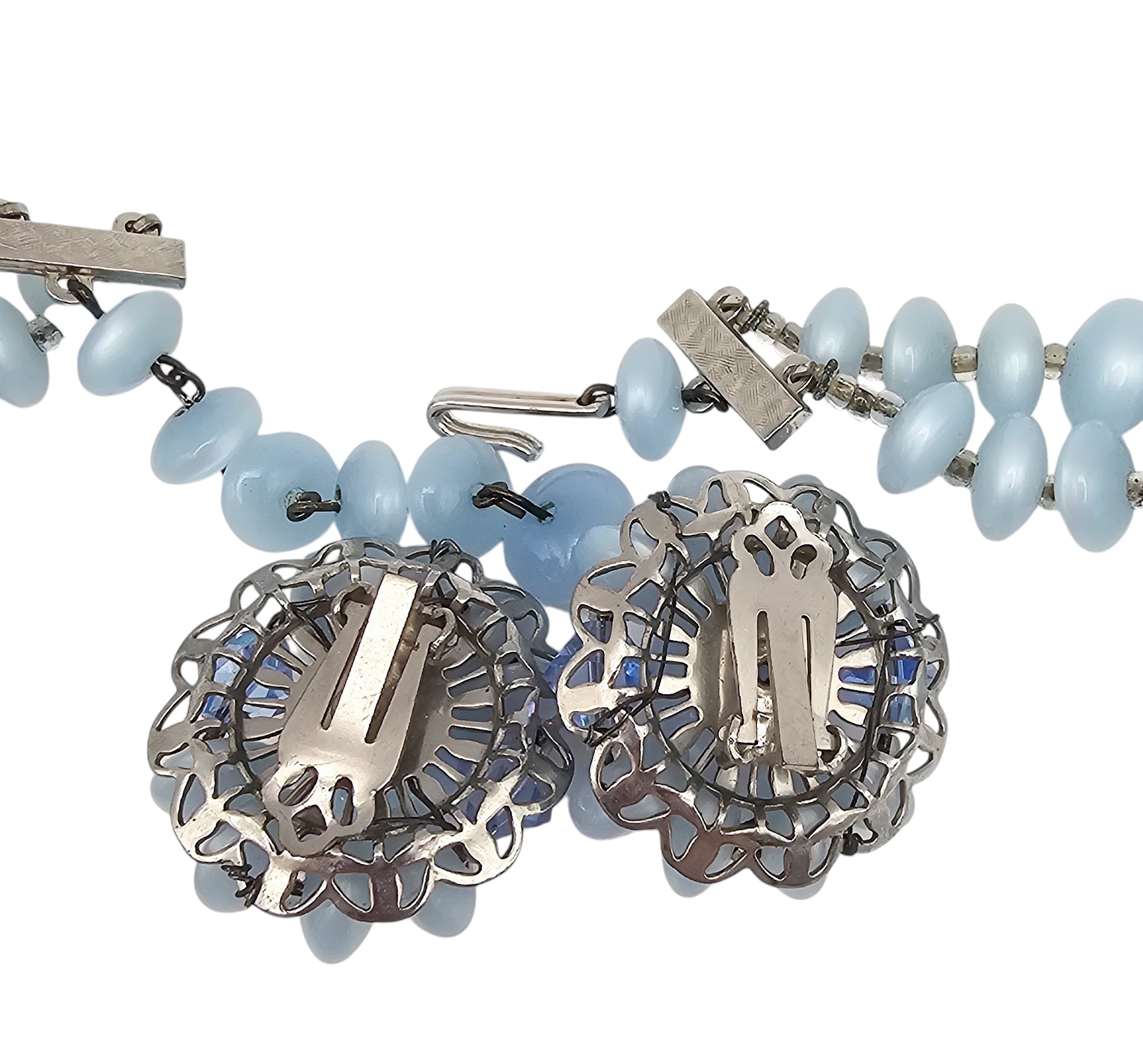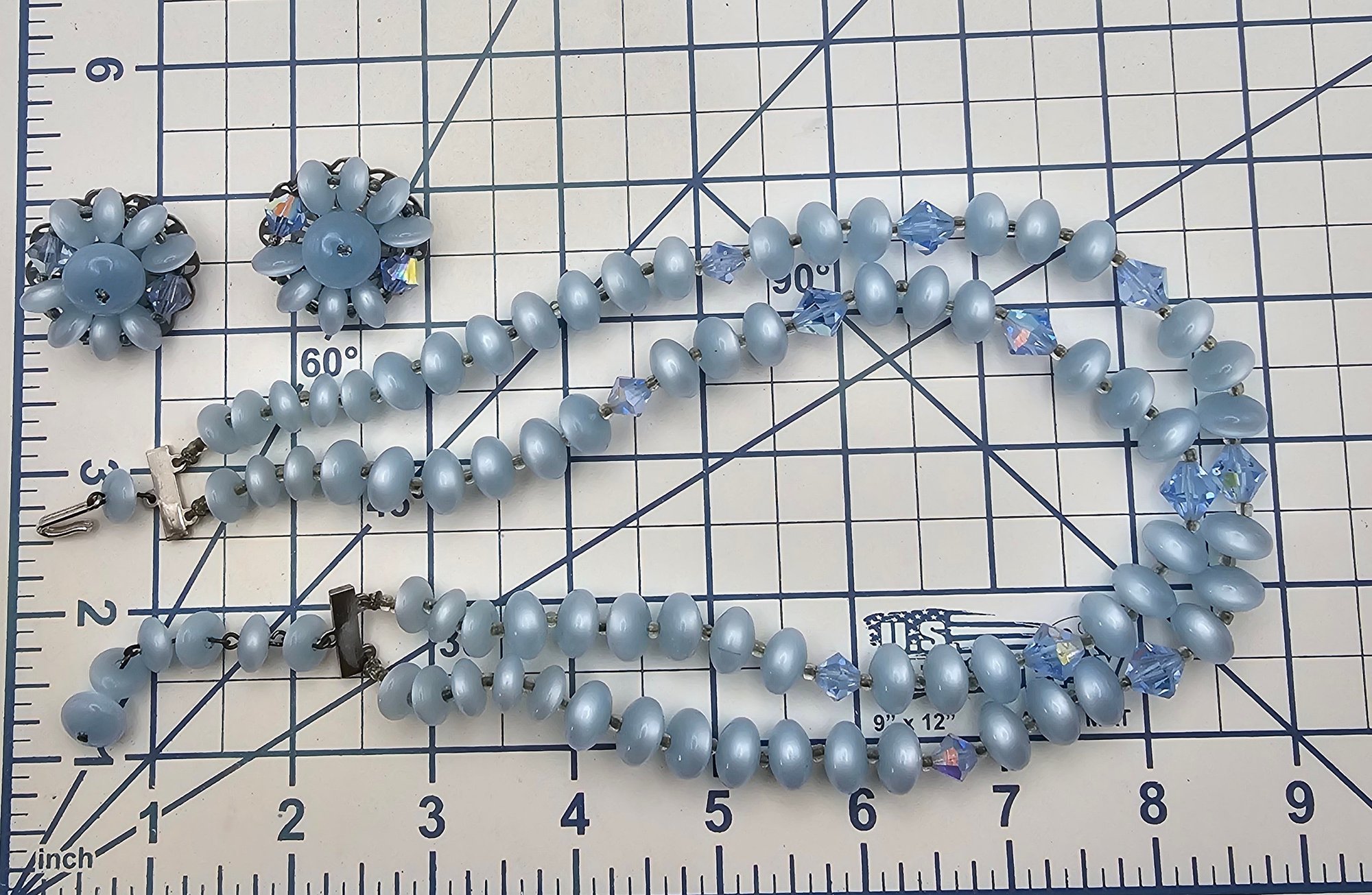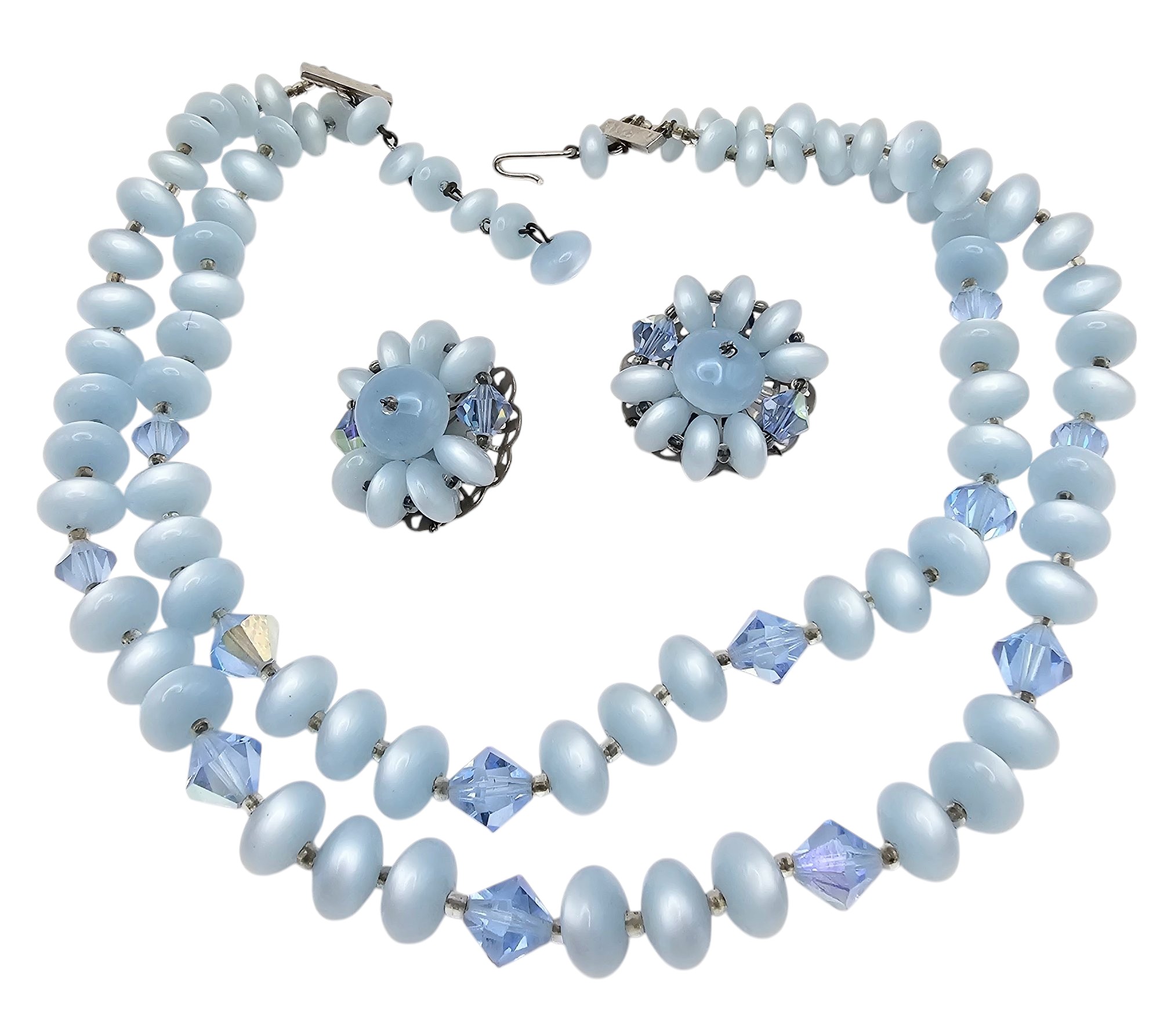 Vintage Country Blue Moonglow Lucite Bead 2 Strand Necklace Earrings Set