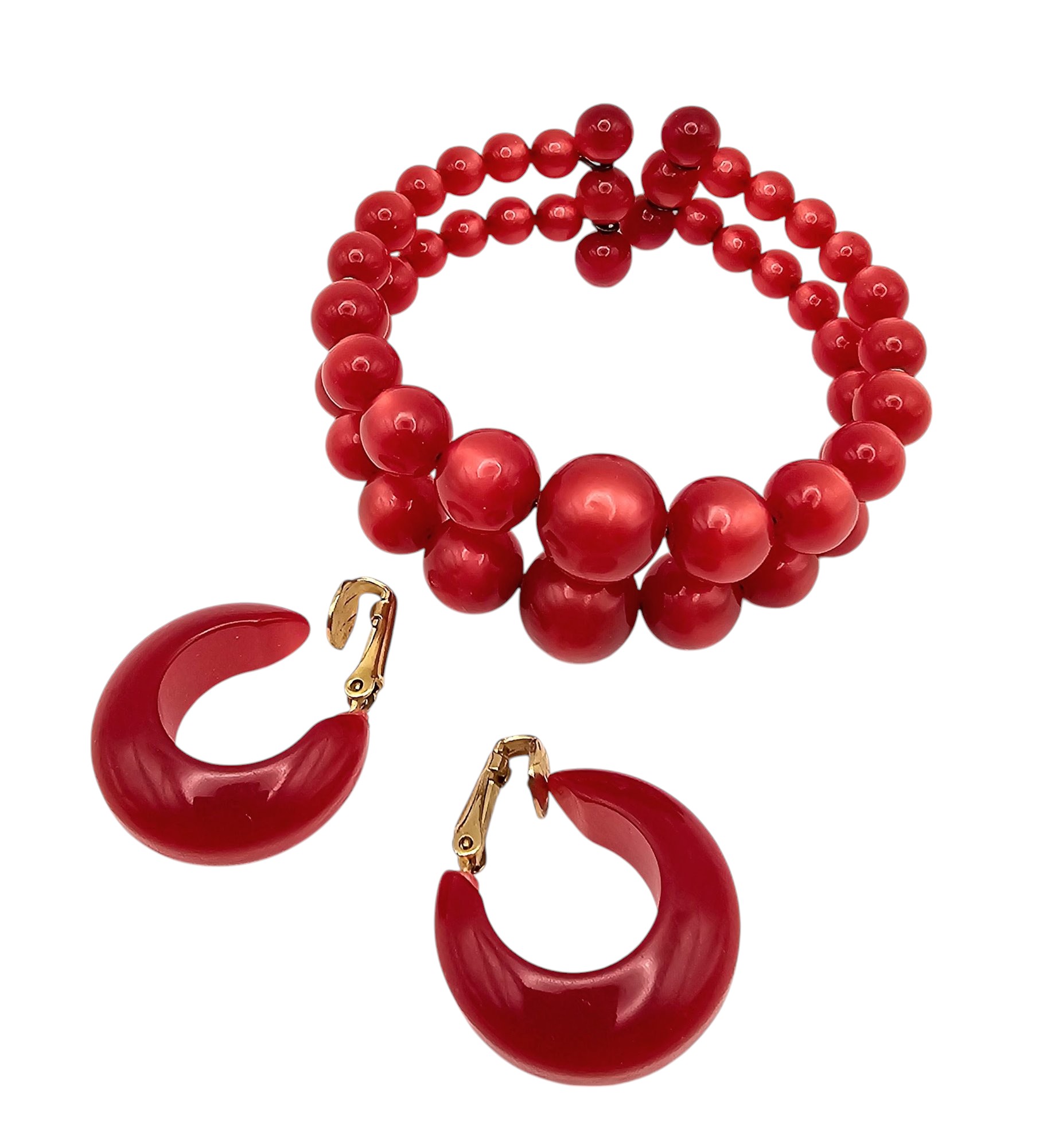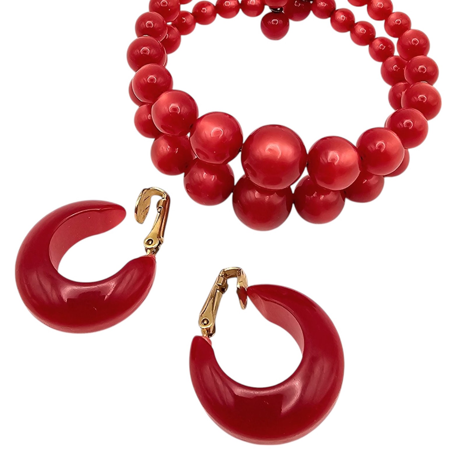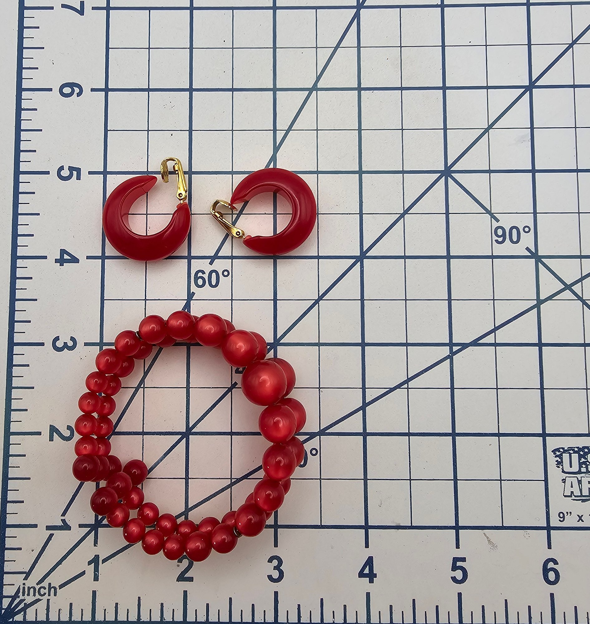 Vintage Red Moonglow Lucite Bead Bracelet Earrings Set