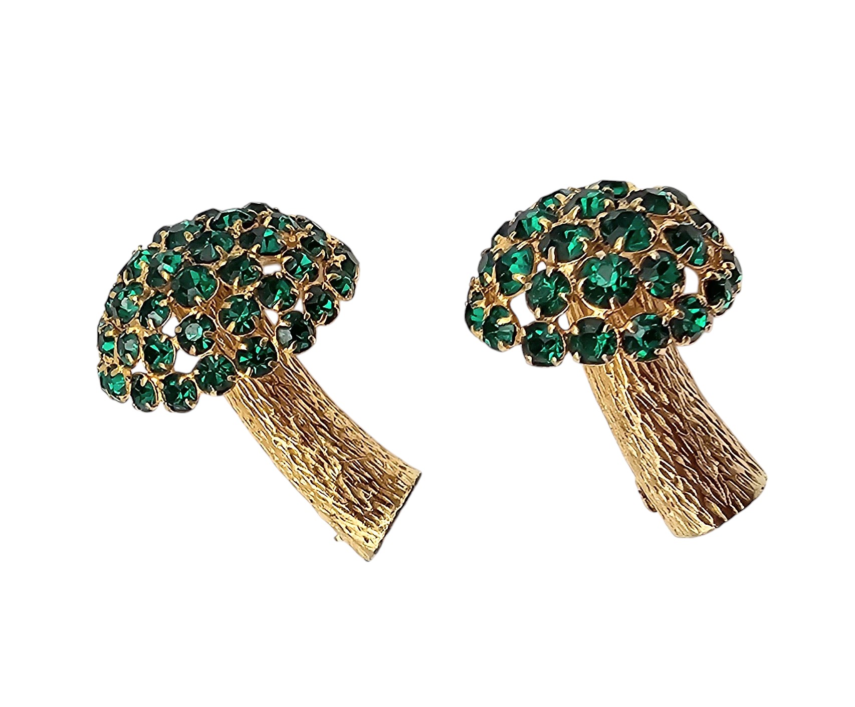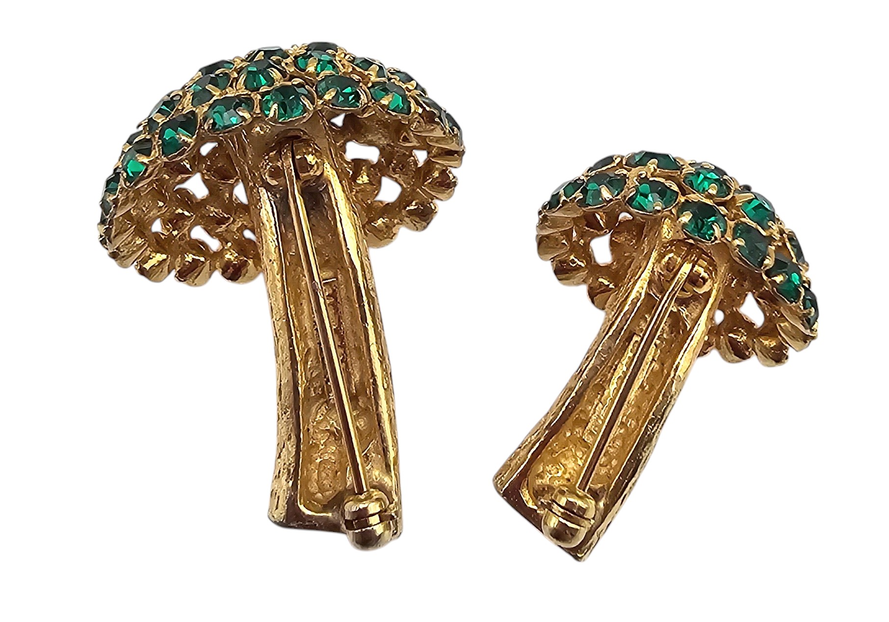 1960’s Castlecliff Green Rhinestone Brushed Gold Tone Mushroom Brooches