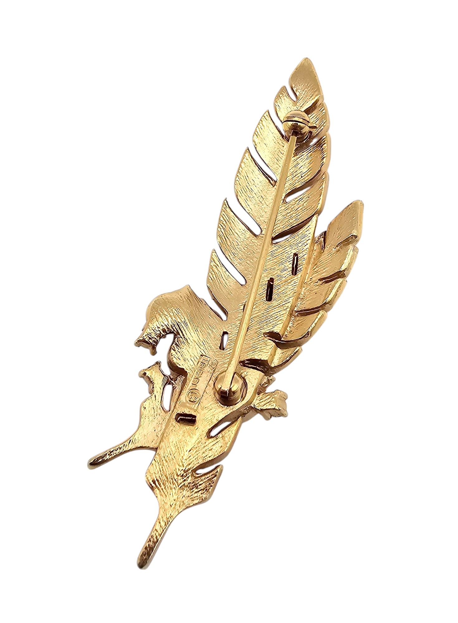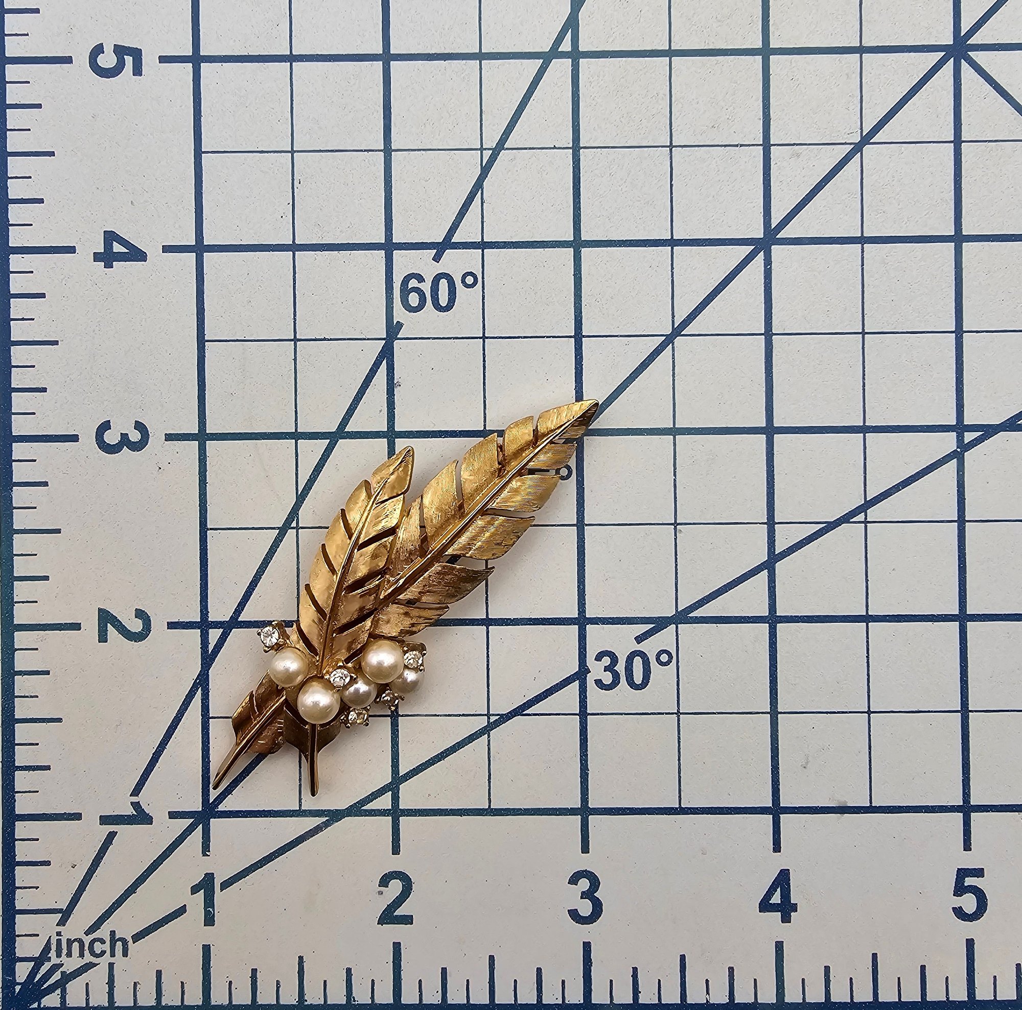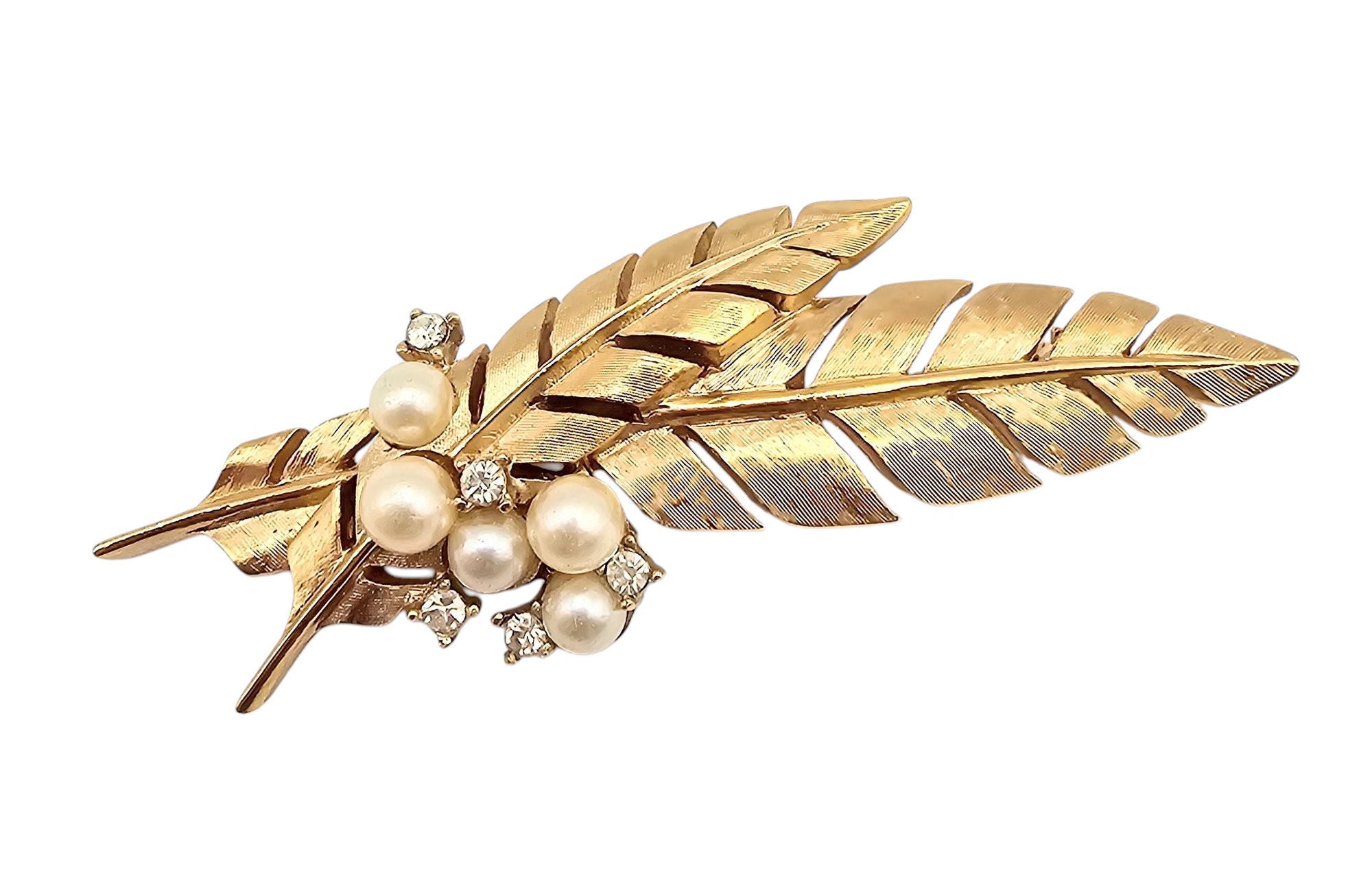 Crown Trifari Vintage Faux Pearl Rhinestone Gold Tone Leaf Brooch