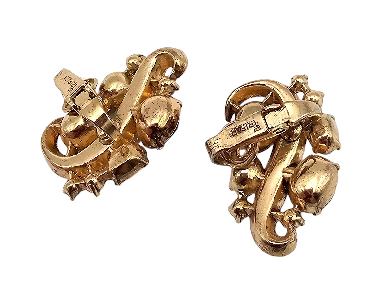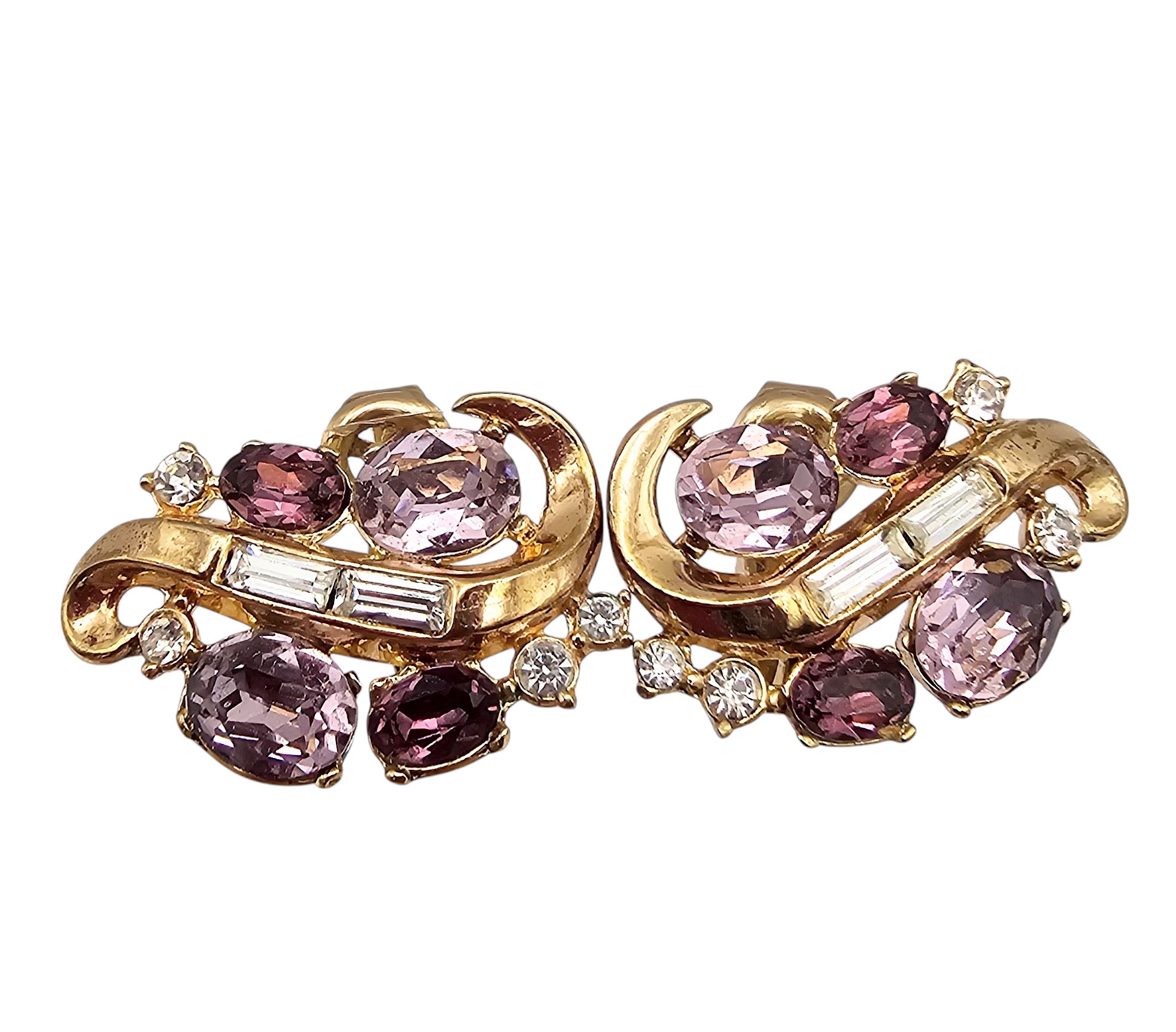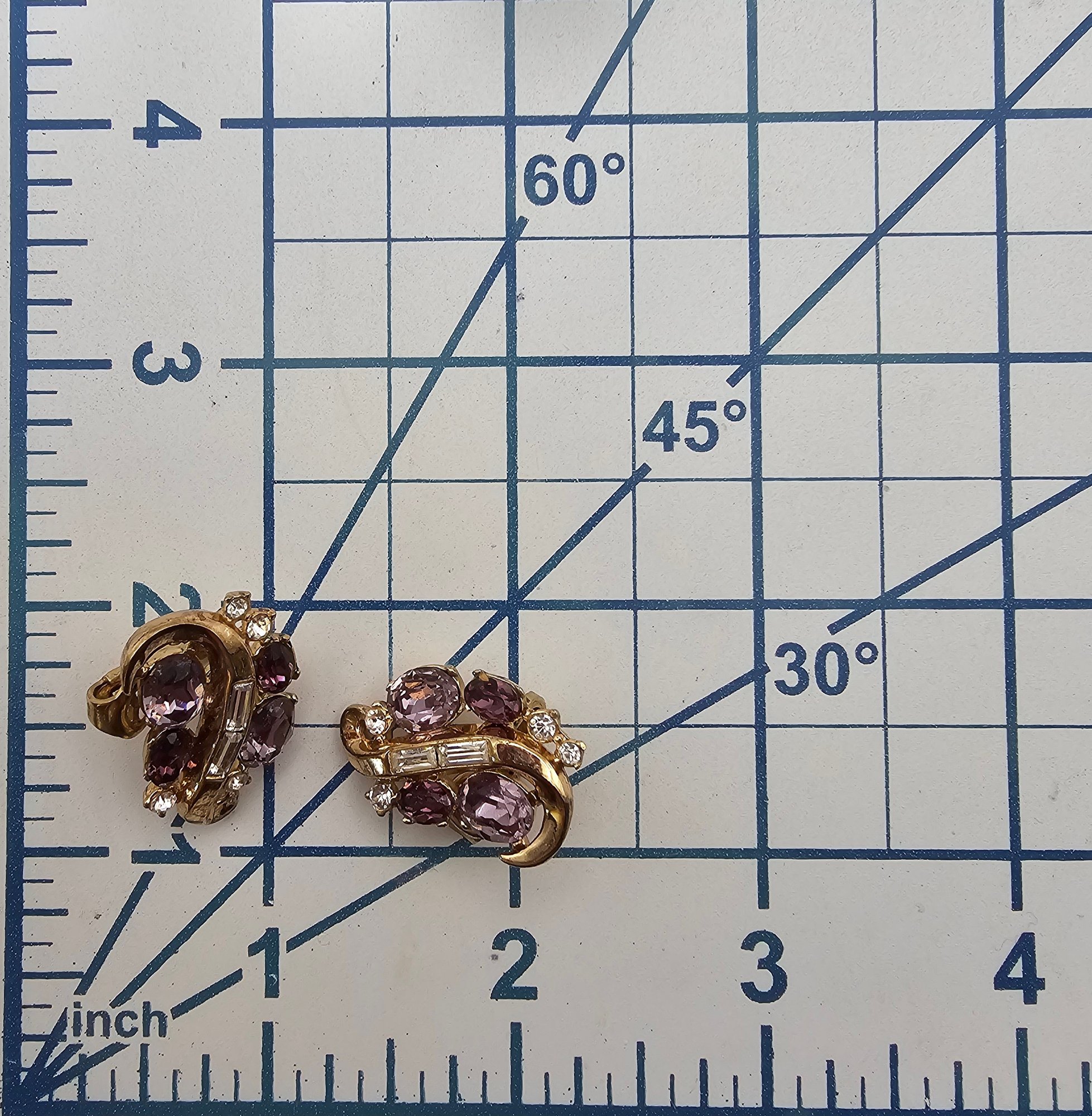 Vintage Crown Trifari Purple And Clear Stone Gold Tone Earrings