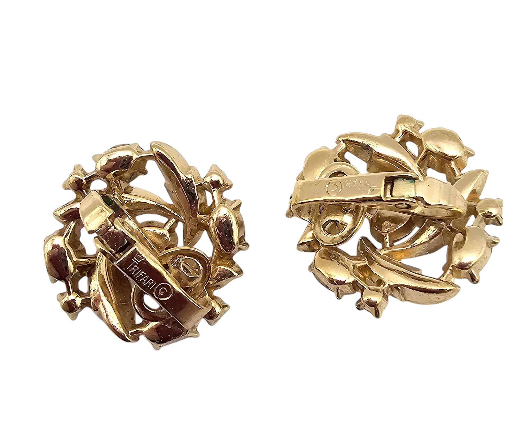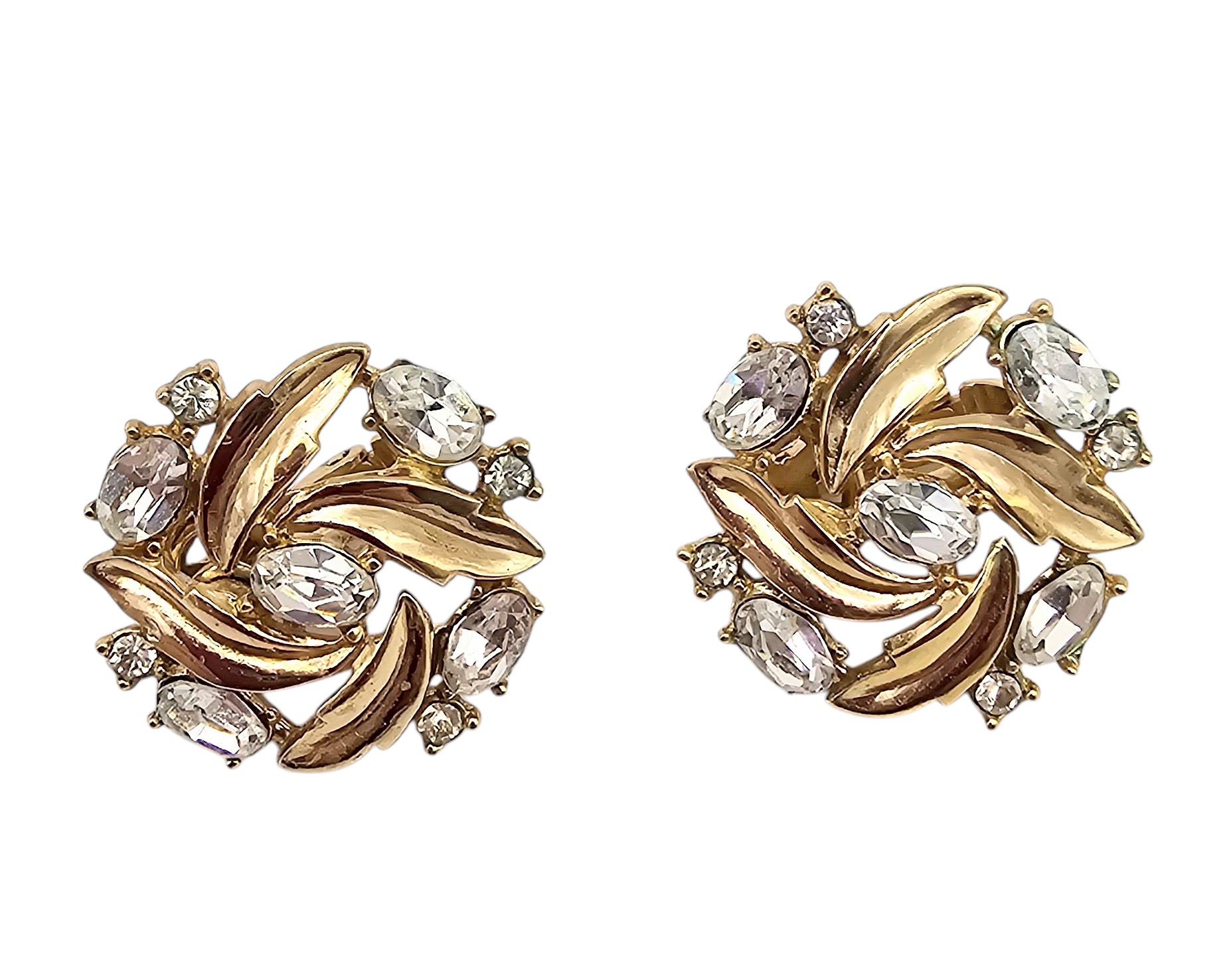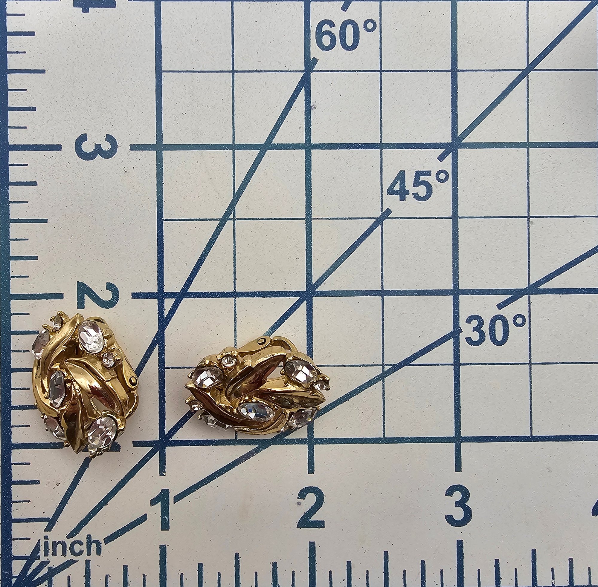 Crown Trifari 1950s Clear Rhinestone Gold Tone Leaf Earrings