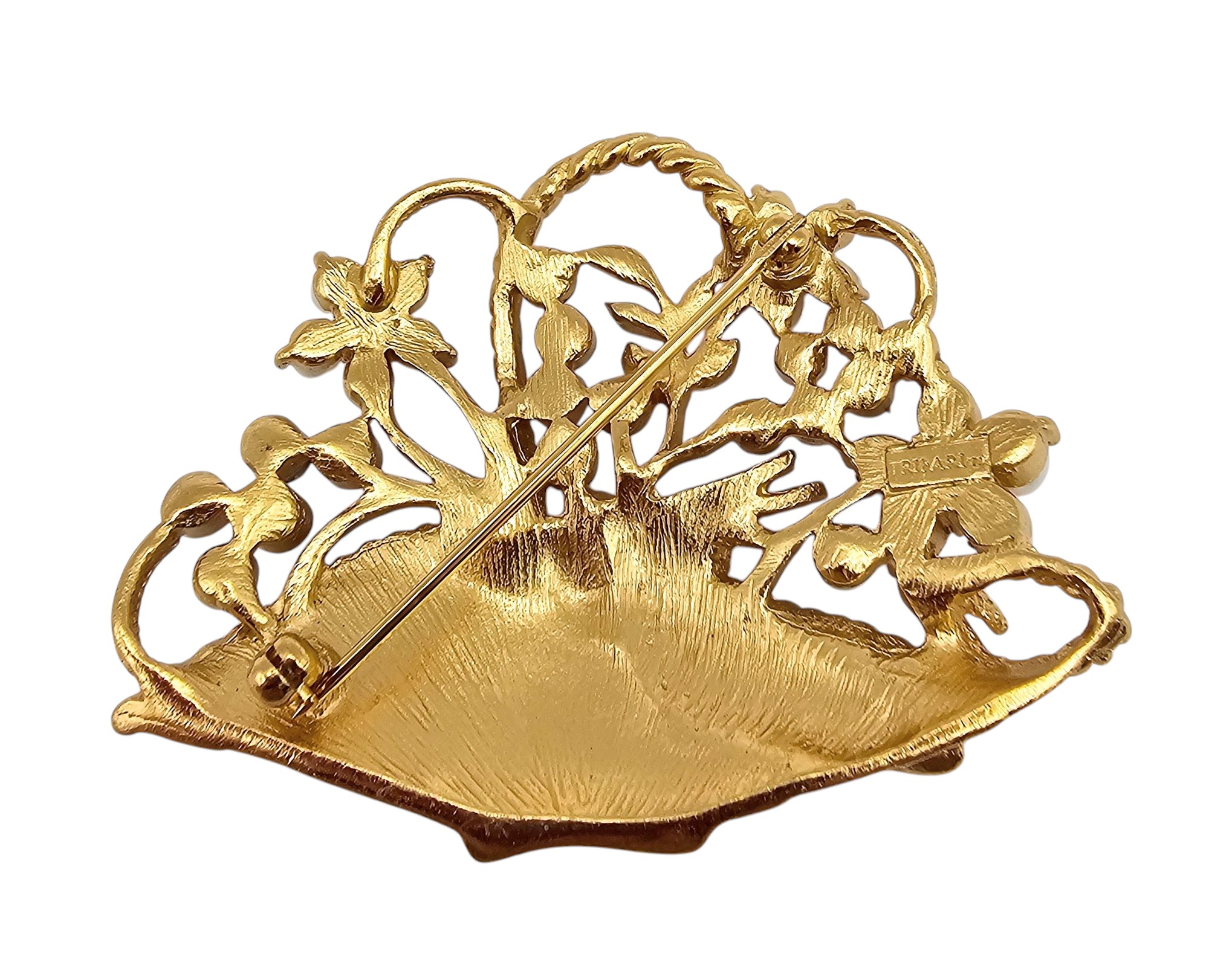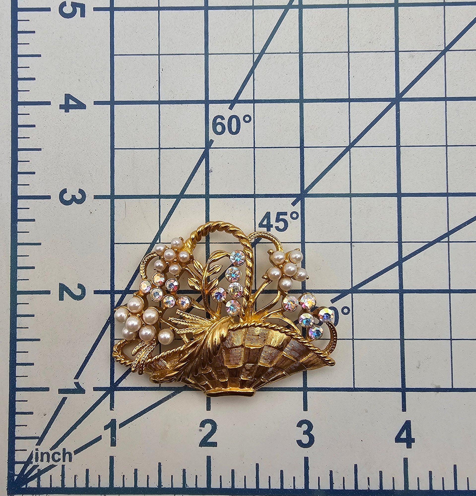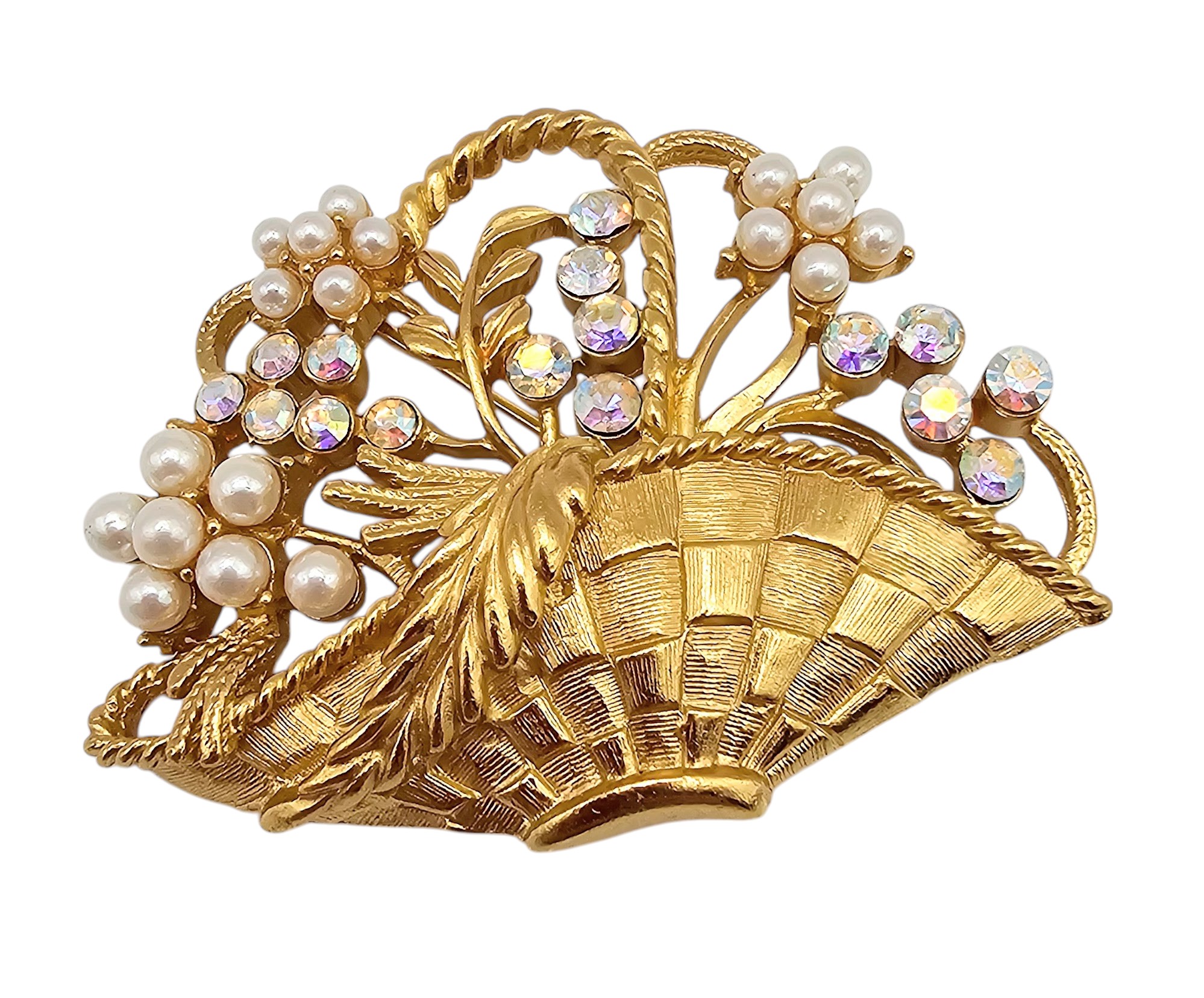 Trifari Vintage Iridescent Rhinestone Faux Pearl Gold Tone Flower Basket Brooch