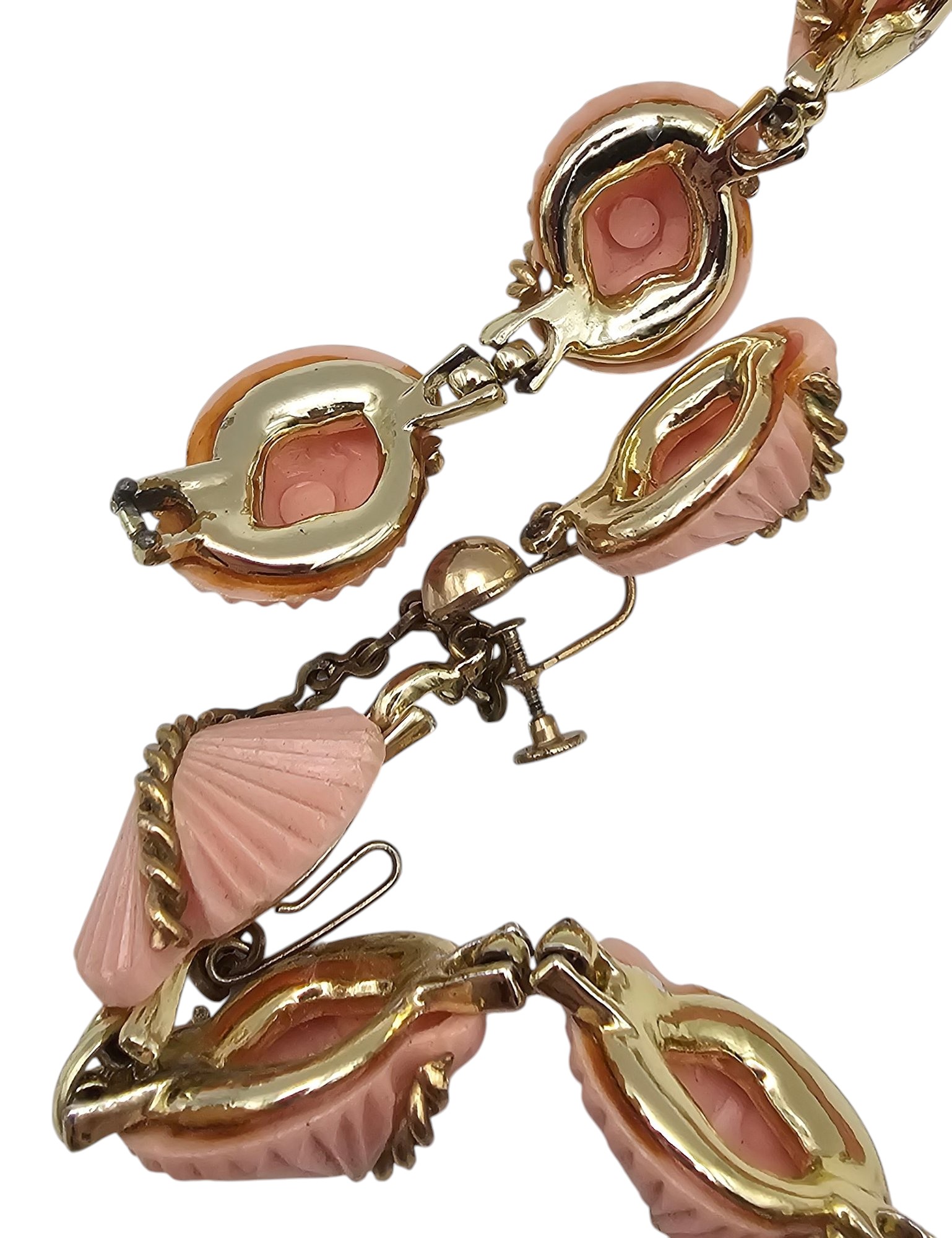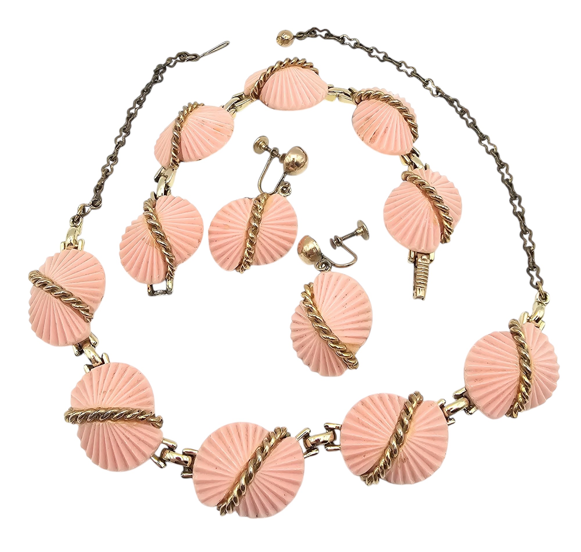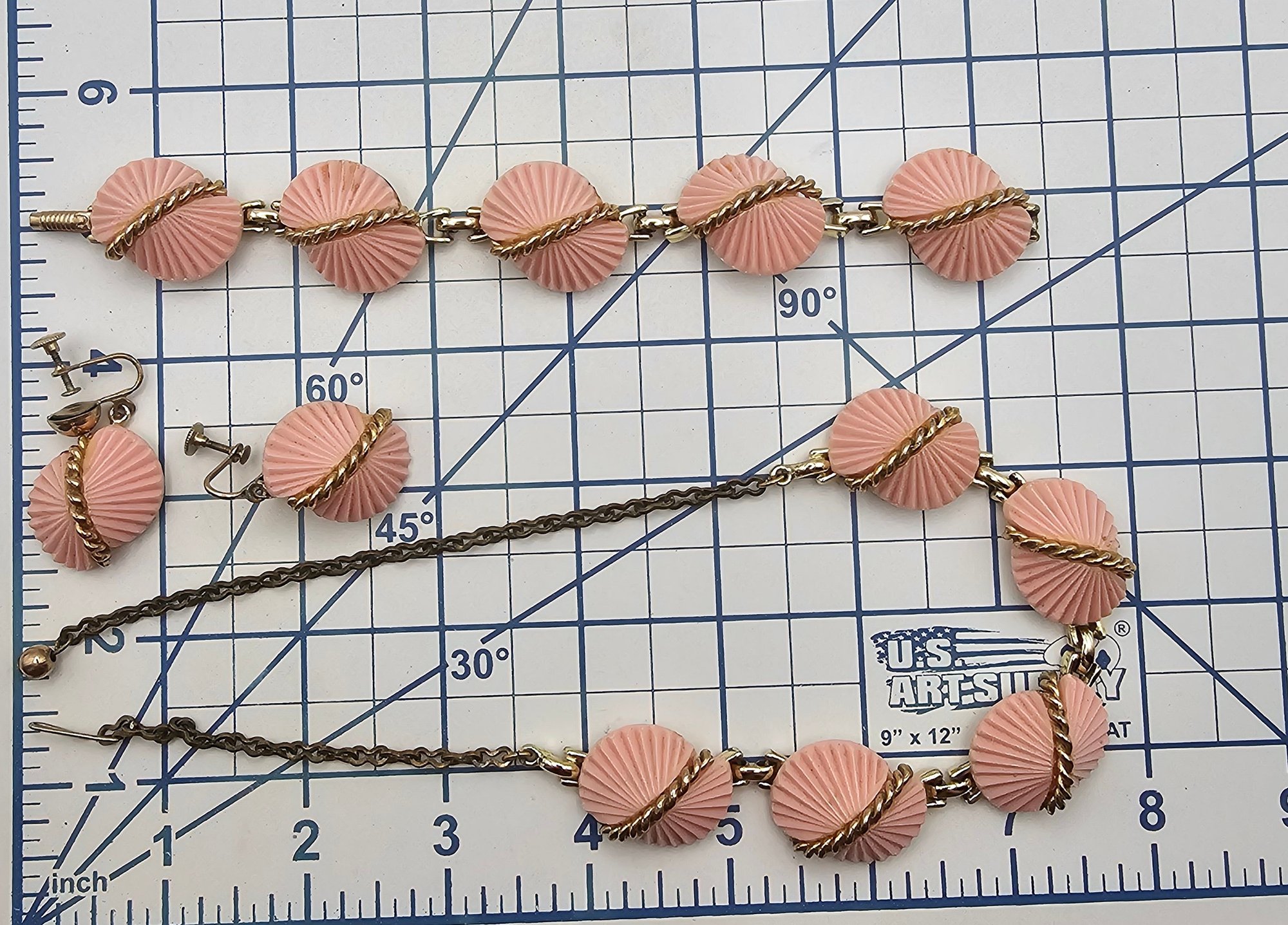 Vintage Pink Thermoset Gold Tone Shell Style Necklace Bracelet Earrings Set