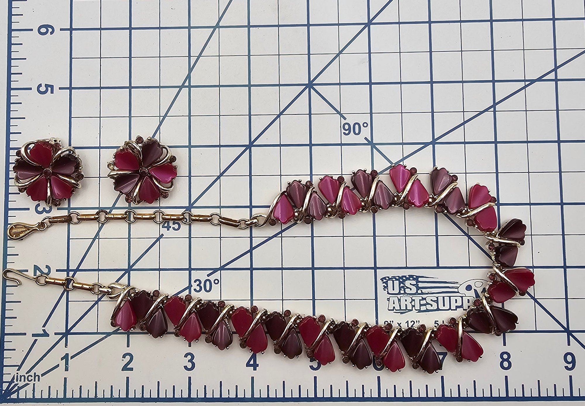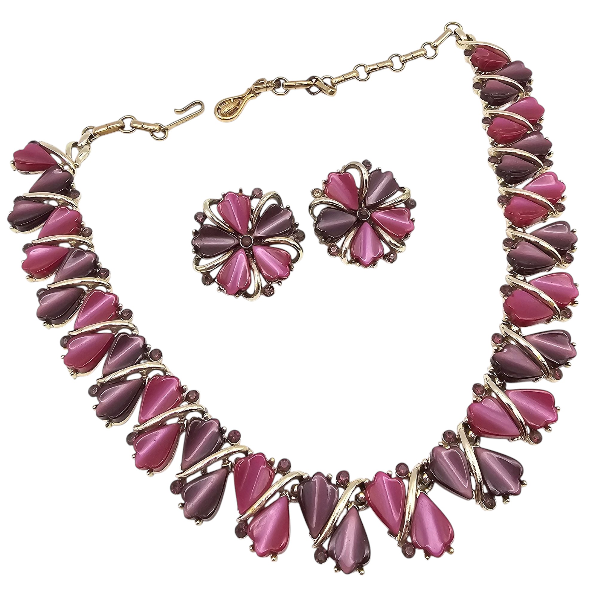 Coro Vintage Fuchsia Plum Thermoset/Lucite Gold Tone Floral Necklace Earrings Set