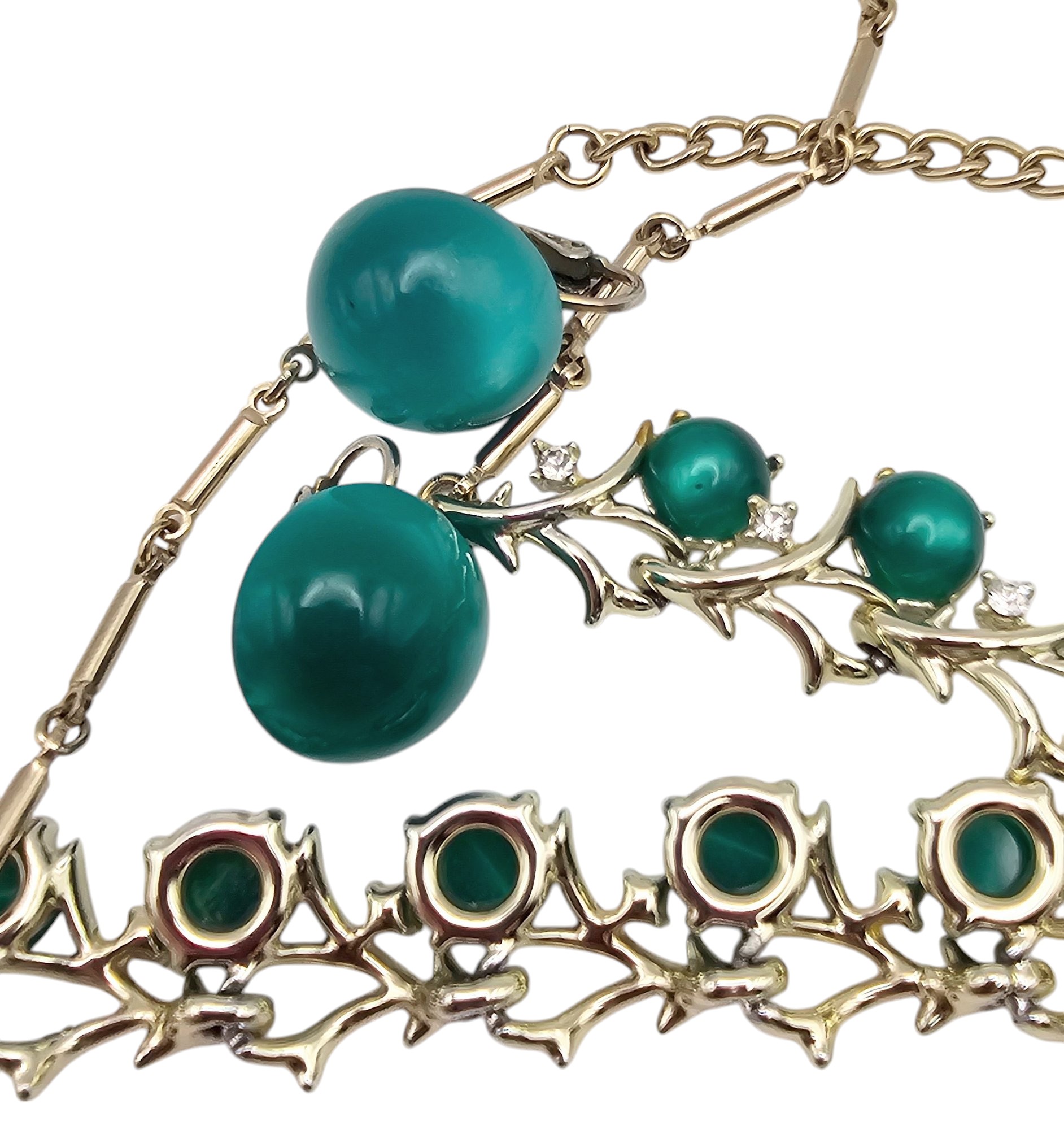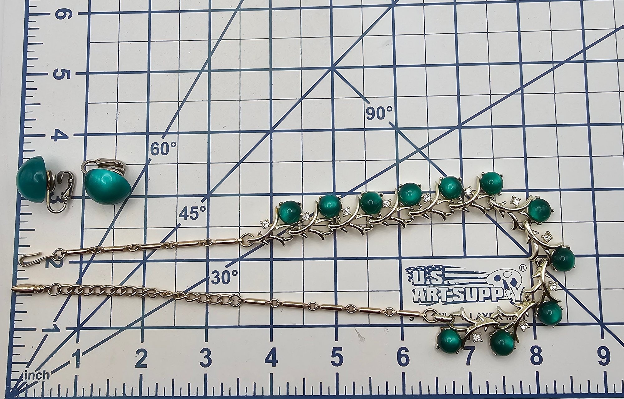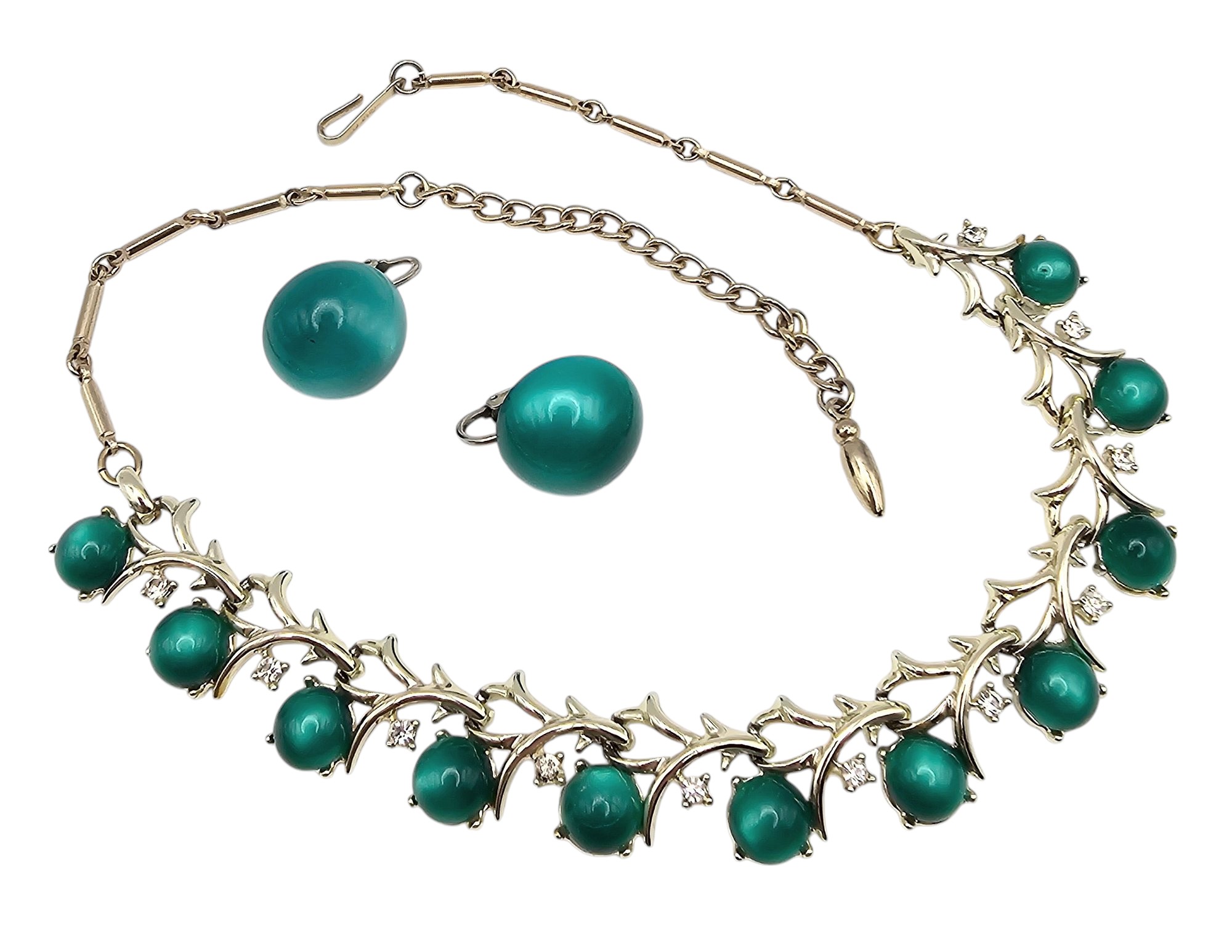 Coro Vintage Green Moonglow Thermoset/Lucite Gold Tone Necklace Earrings Set