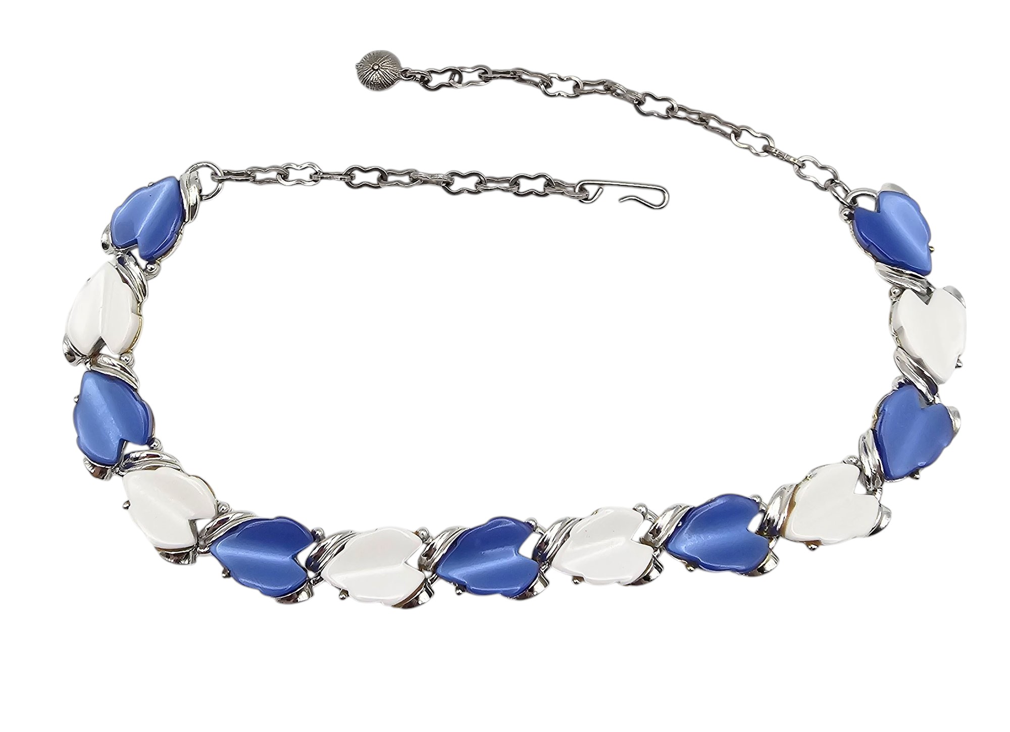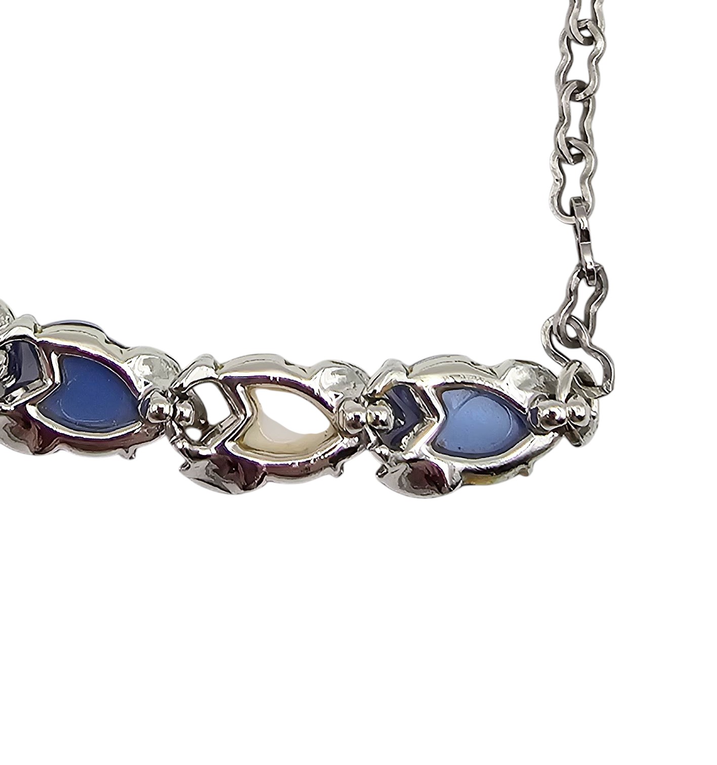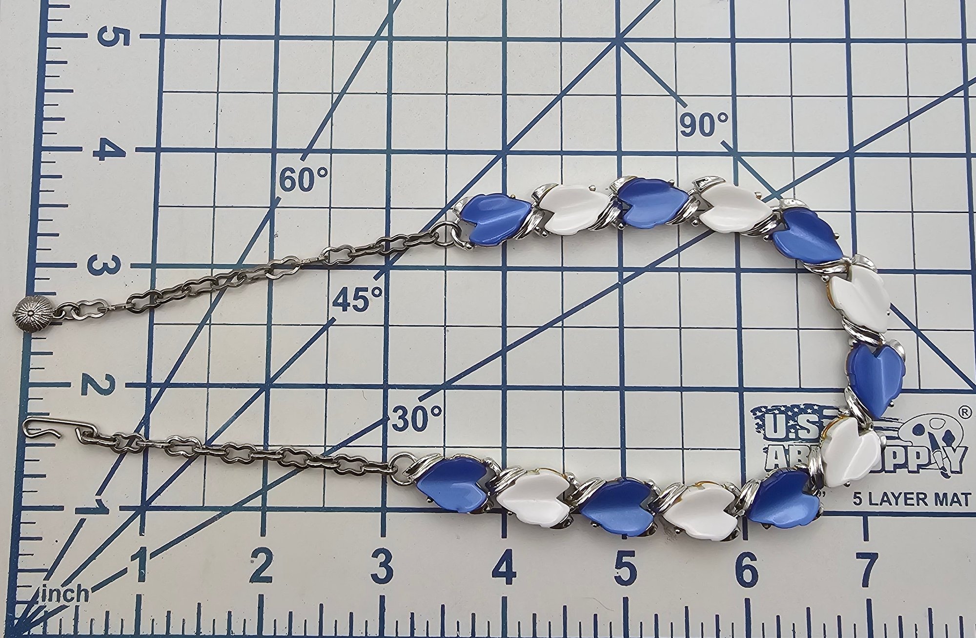 Mid Century Blue White Thermoset Leaf Silver Tone Necklace