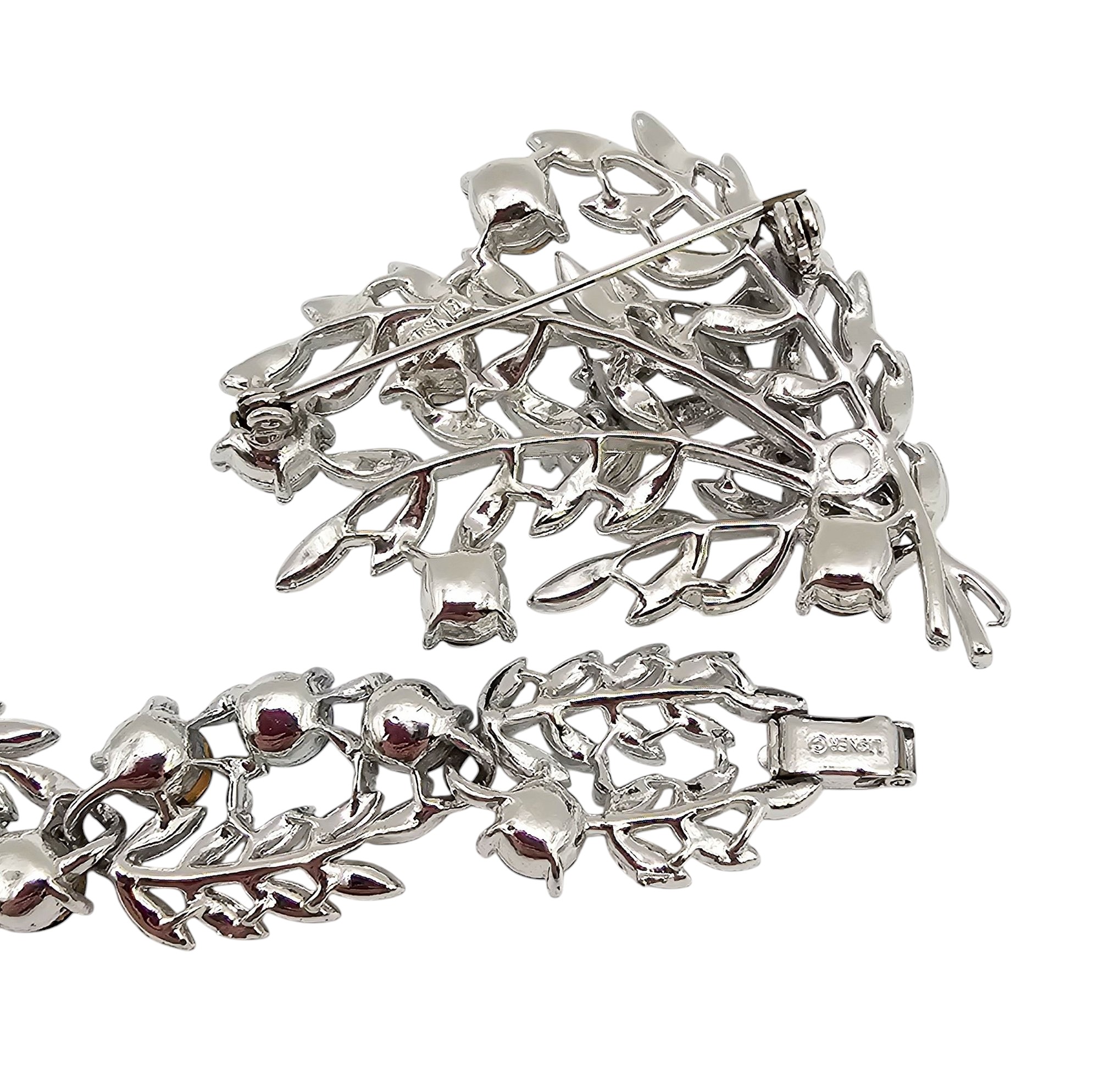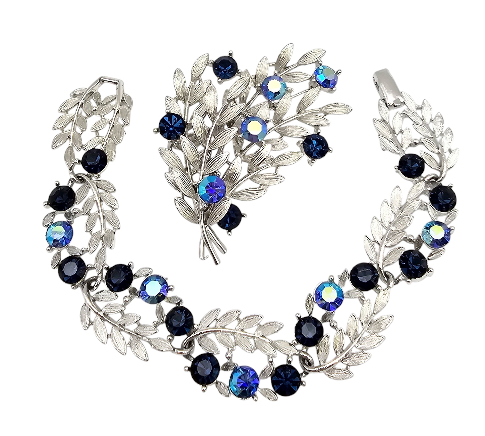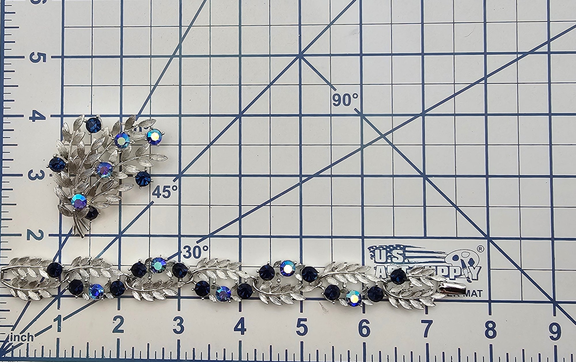 Lisner Vintage Blue Rhinestone Brushed Silver Tone Leaf Spray Brooch Bracelet Set